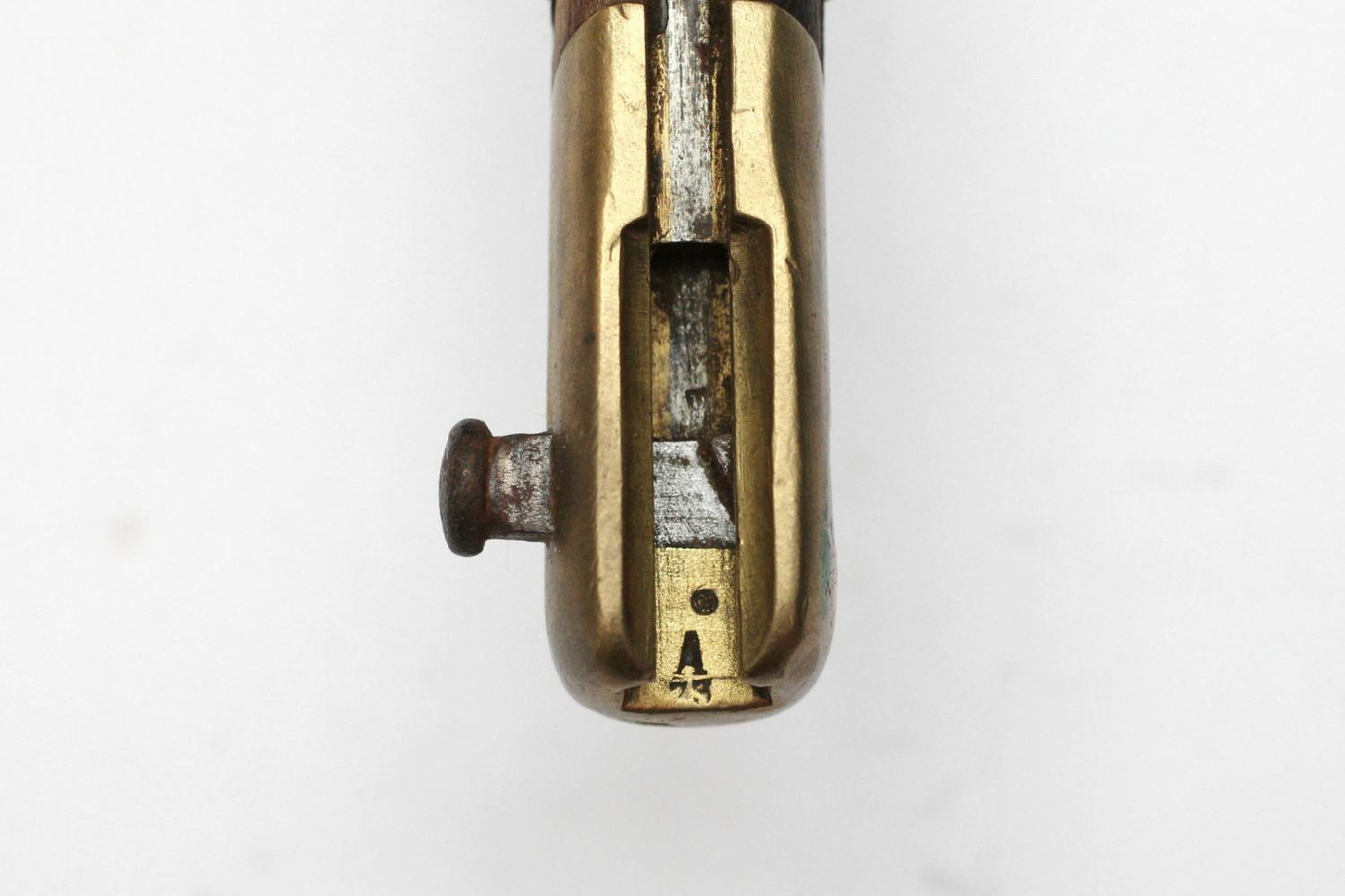 Baïonnette-épée Gras Mle 1874 en état moyen/mauvais état sans son fourreau. Il y a de nombreux marquages (poinçons de contrôle et de réception, directeur de la manufacture, numéro d’arme...) lisibles. Le système de fixation est grippé, les poignées en bois ont des marques et la lame a été restaurée. Pièce sans prétention qui est cependant très présentable.