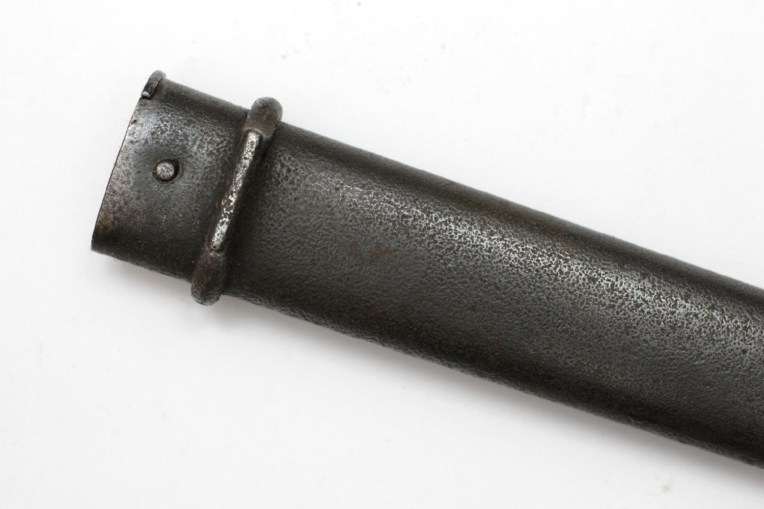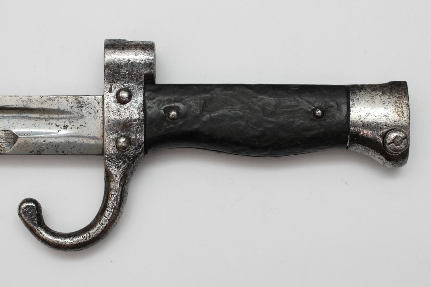 Sabre-baïonnette M-1892 du second type en état moyen. C’est une fabrication de la manufacture de Châtellerault, n° D 47153, d’après 1893. Les plaquettes sont en matériau composite et en état d’usage. Le système de verrouillage est fonctionnel. Le numéro sur le fourreau est quasi illisible, on distingue un 3 et un 2. Le porte fourreau est du modèle adopté en 1914. Le cuir est en bon état, il n’est pas sec. Frais de port compris Mondial Relay. Règlement par Paypal (entre proches) ou par chèque.