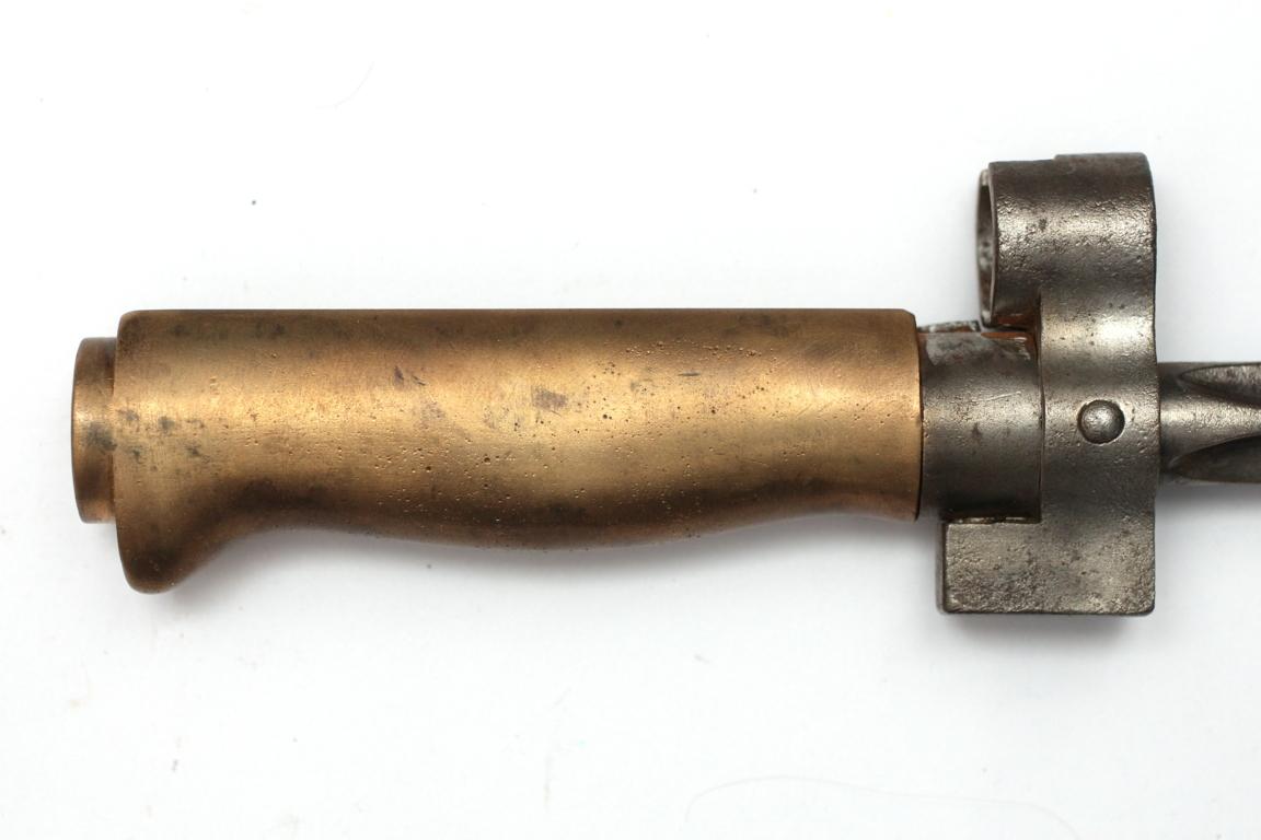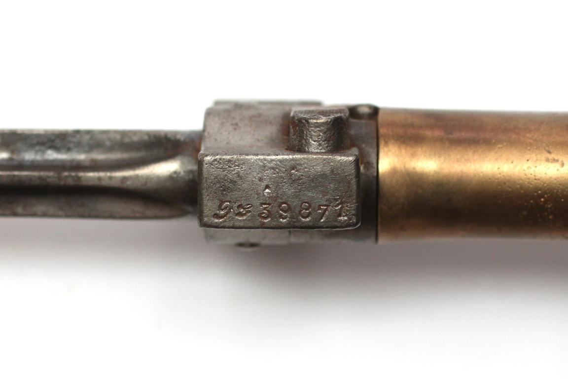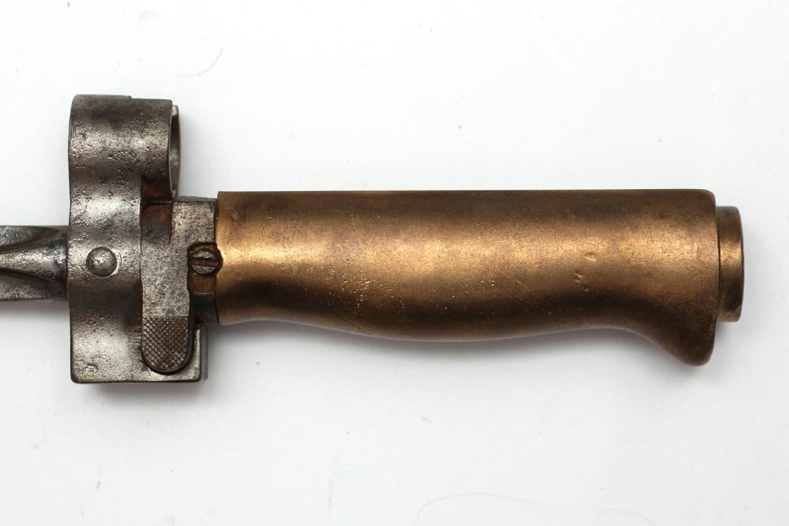 Baïonnette modèle 1886 modifié 1915 sans son fourreau. La poignée est en laiton et porte les initiales du fabricant BM. La baïonnette porte le matricule FL 39871. Le système de verrouillage est grippé. Elle est en état d’usage mais reste très présentable. Frais de port compris Mondial Relay. Règlement par Paypal (entre proches) ou par chèque.