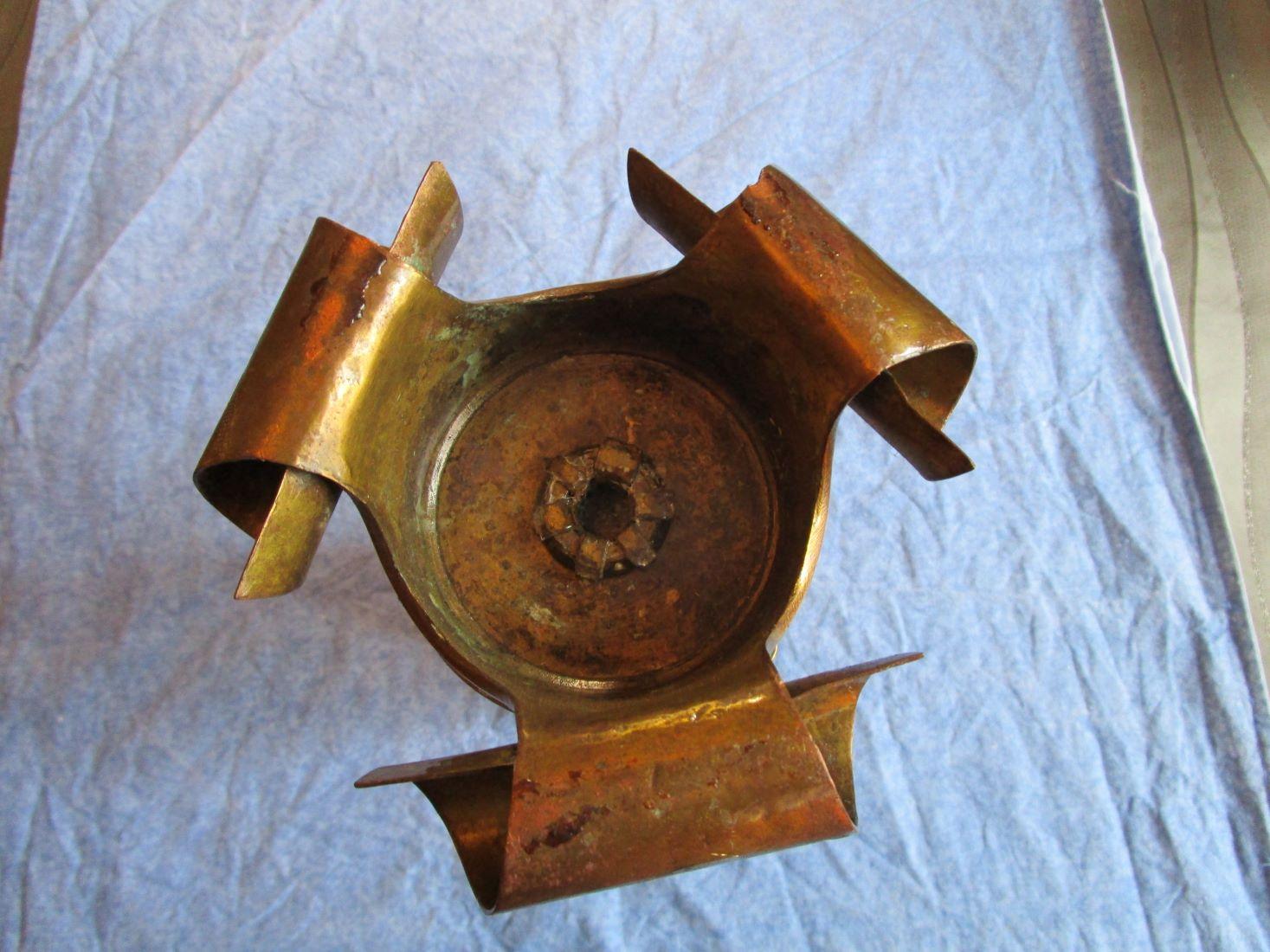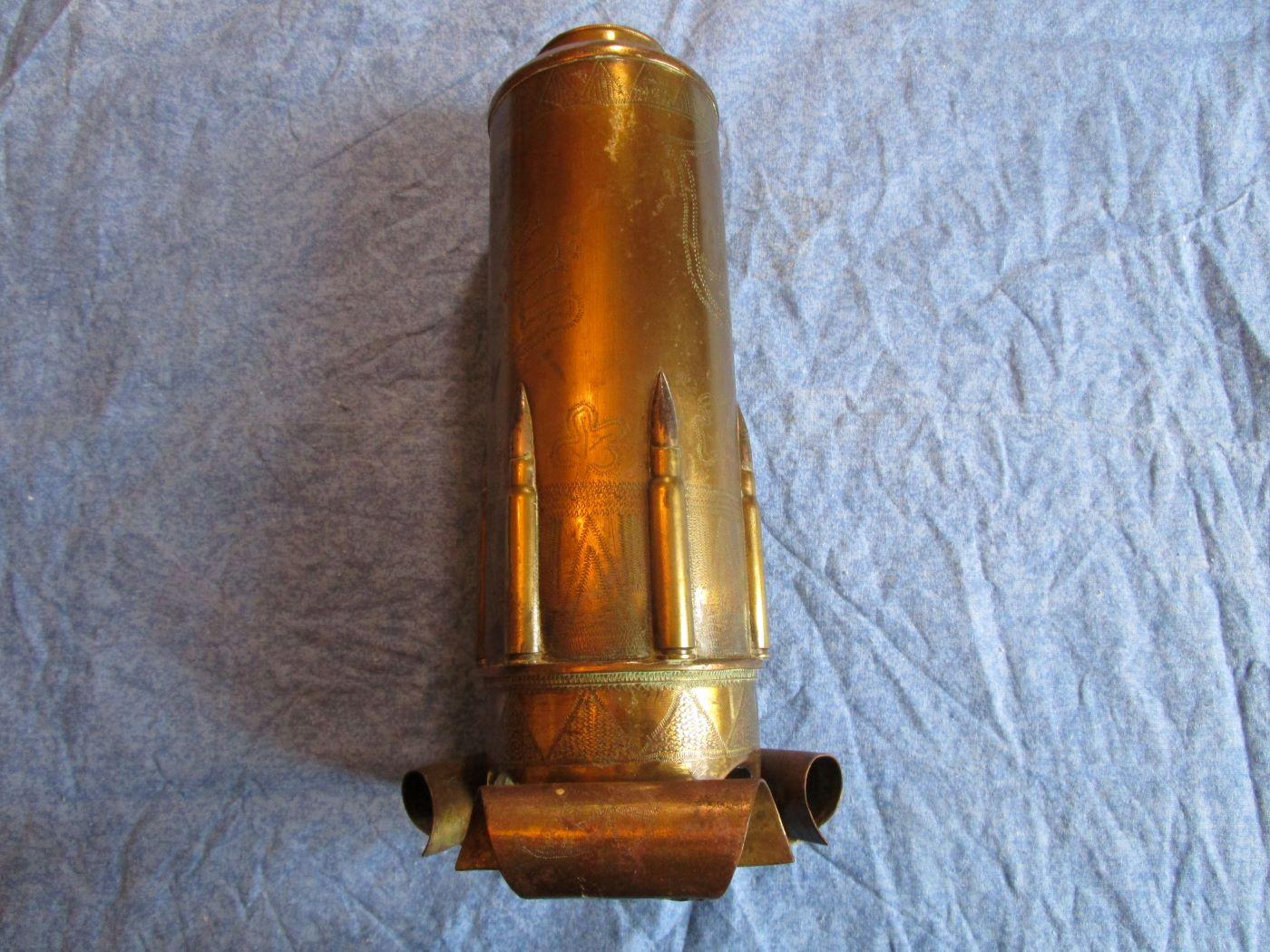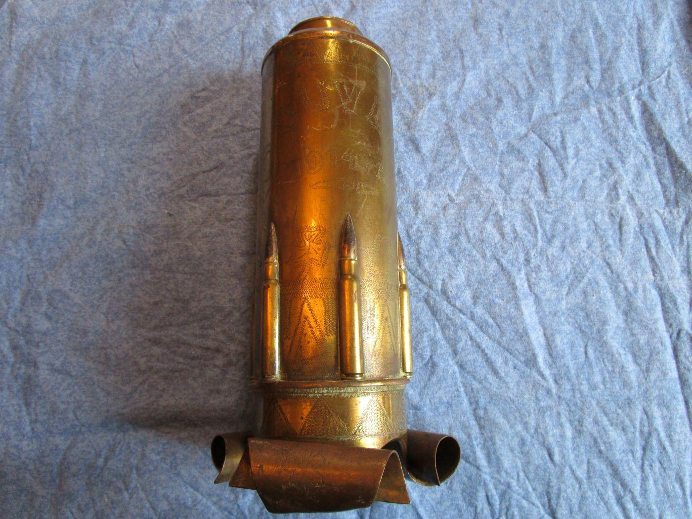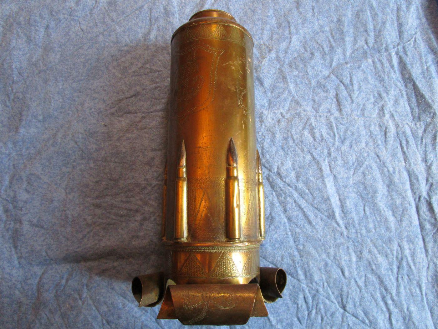 Hauteur totale 26 cm. Gravée "souvenir 1914-16". Demies cartouches allemandes sur le pourtour. Peut être pour faire une lampe. Prévoir 15.60 euros en colissimo ou 7.40 euros par mondial relay.