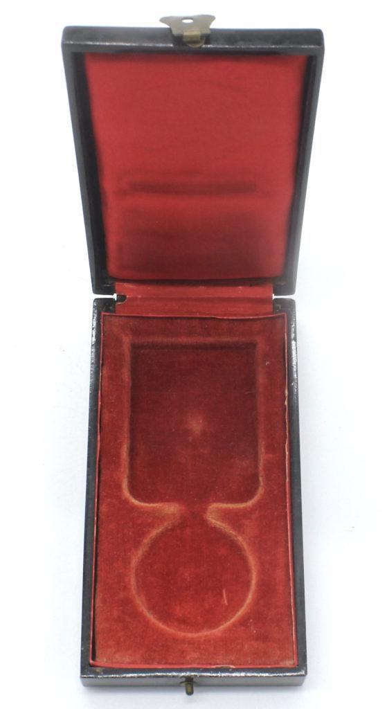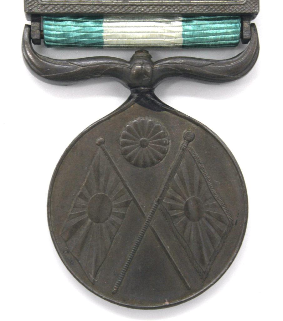 Le recto de la médaille présente des drapeaux croisés de l’armée et de la marine ainsi que le chrysanthème impérial. Au revers il est inscrit «Médaille de guerre Meiji 27-28 (1894-1895)».