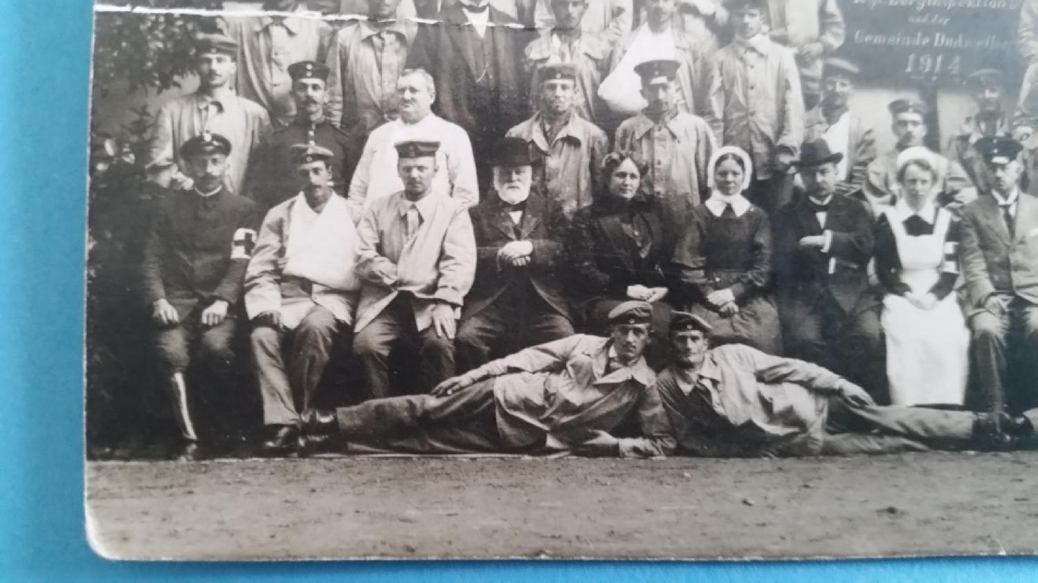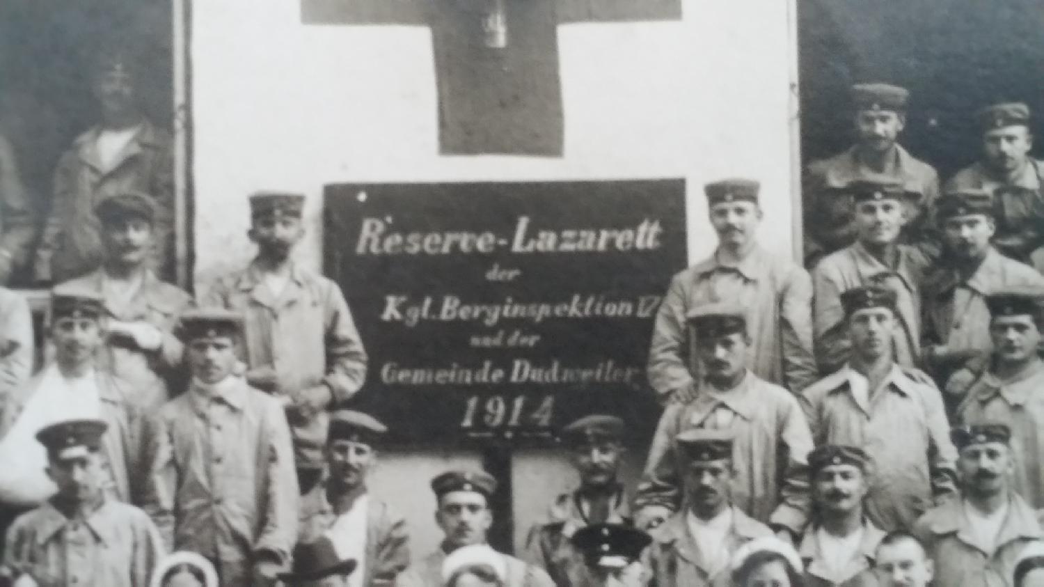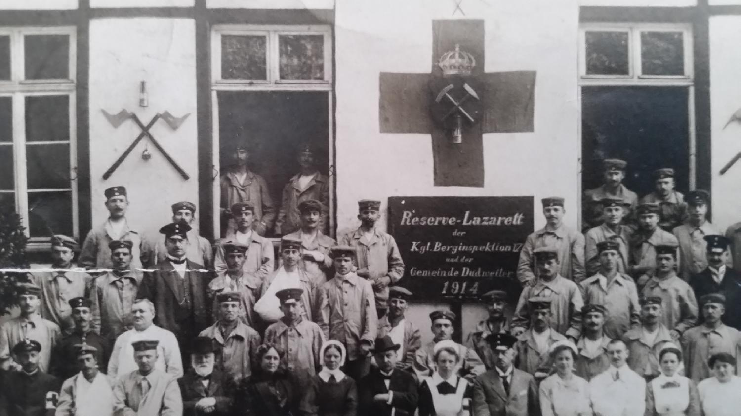 Photo prise devant l’entrée d’un hôpital allemand (Reserve Lazarett) avec le personnel y étant affecté.