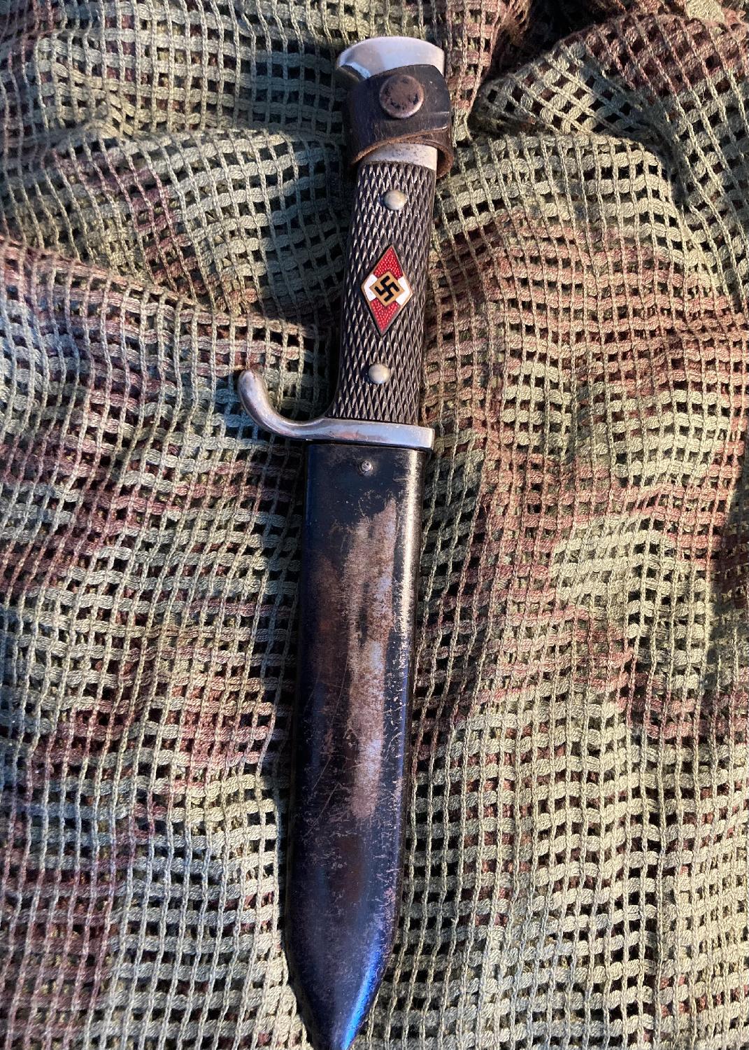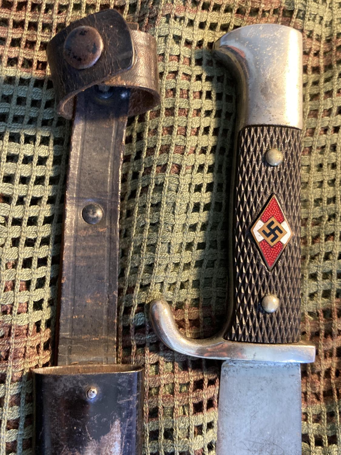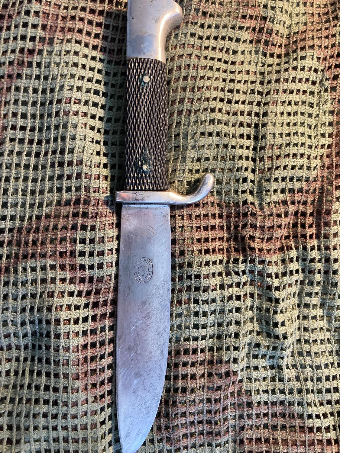 Beau couteau HJ début du reich sans ricasso avec reste de glaçage argenté encore bien présent. Poignées avec petites stries, insigne émaillé, usures normales de l'époque. Devise gravée sur la lame, le couteau à bien servi dans son passé.