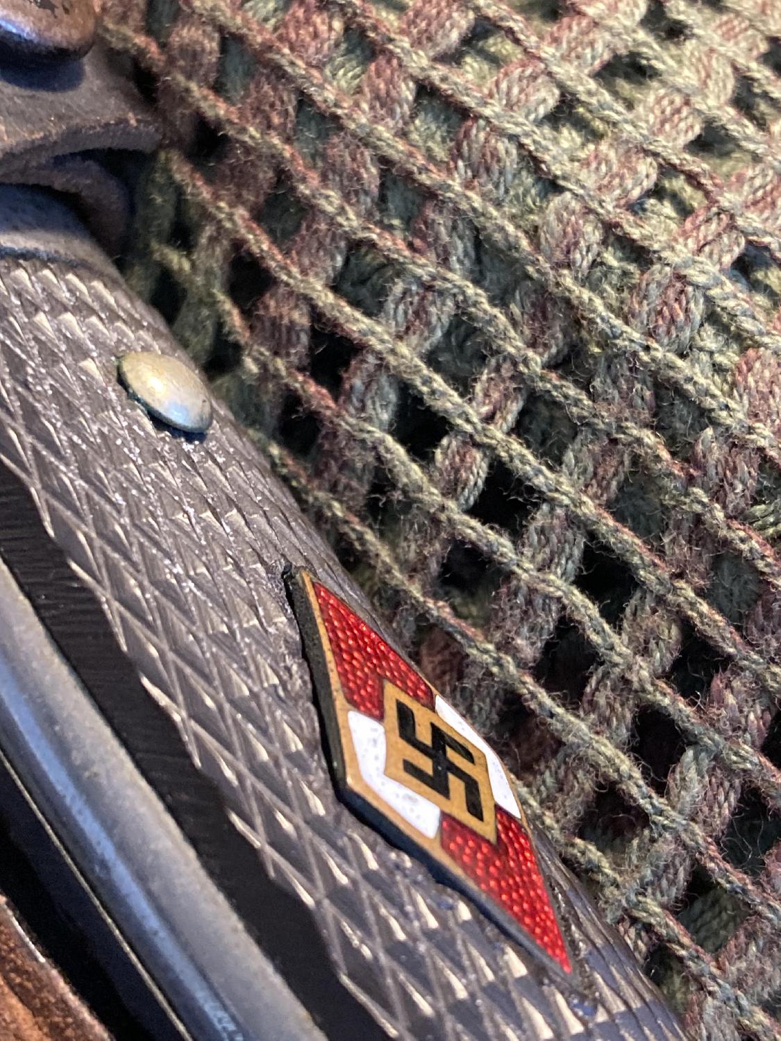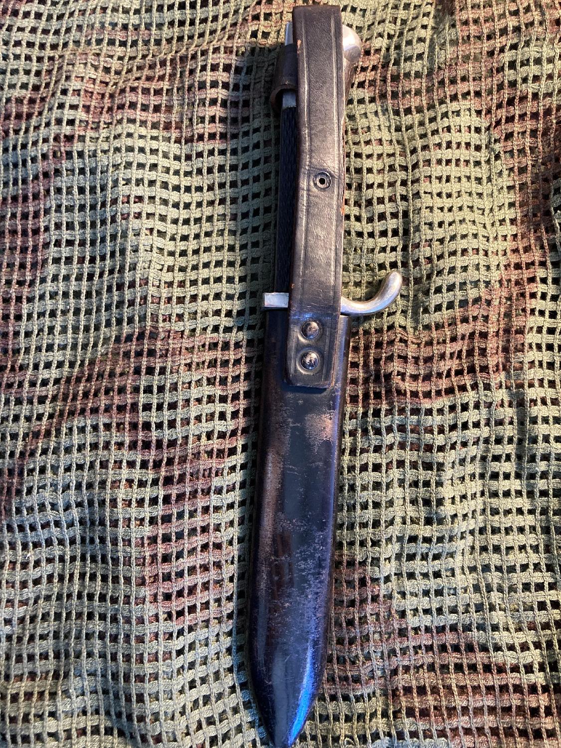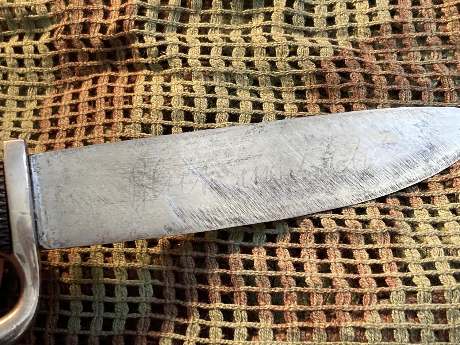 Beau couteau HJ début du reich sans ricasso avec reste de glaçage argenté encore bien présent. Poignées avec petites stries, insigne émaillé, usures normales de l'époque. Devise gravée sur la lame, le couteau à bien servi dans son passé.