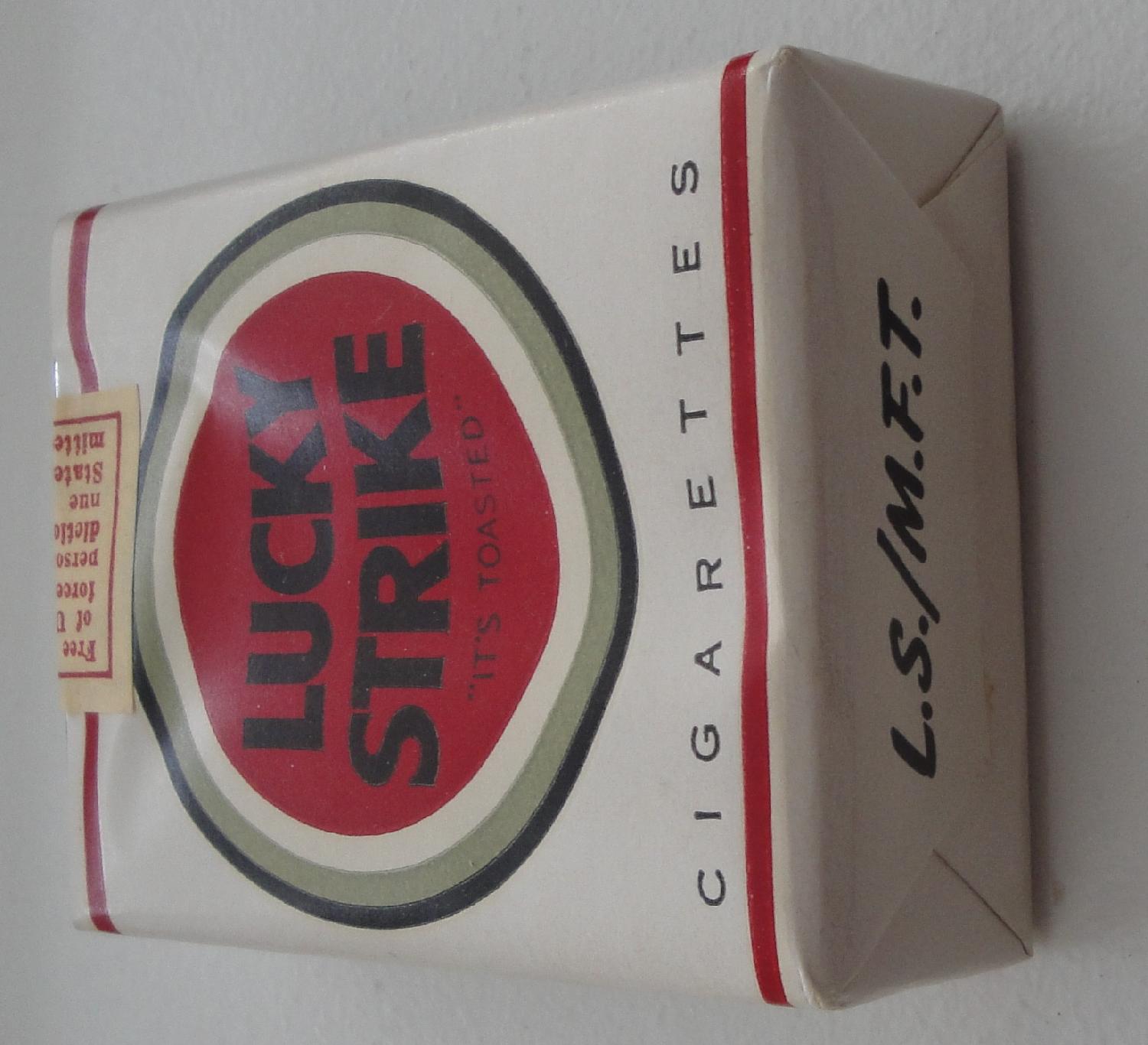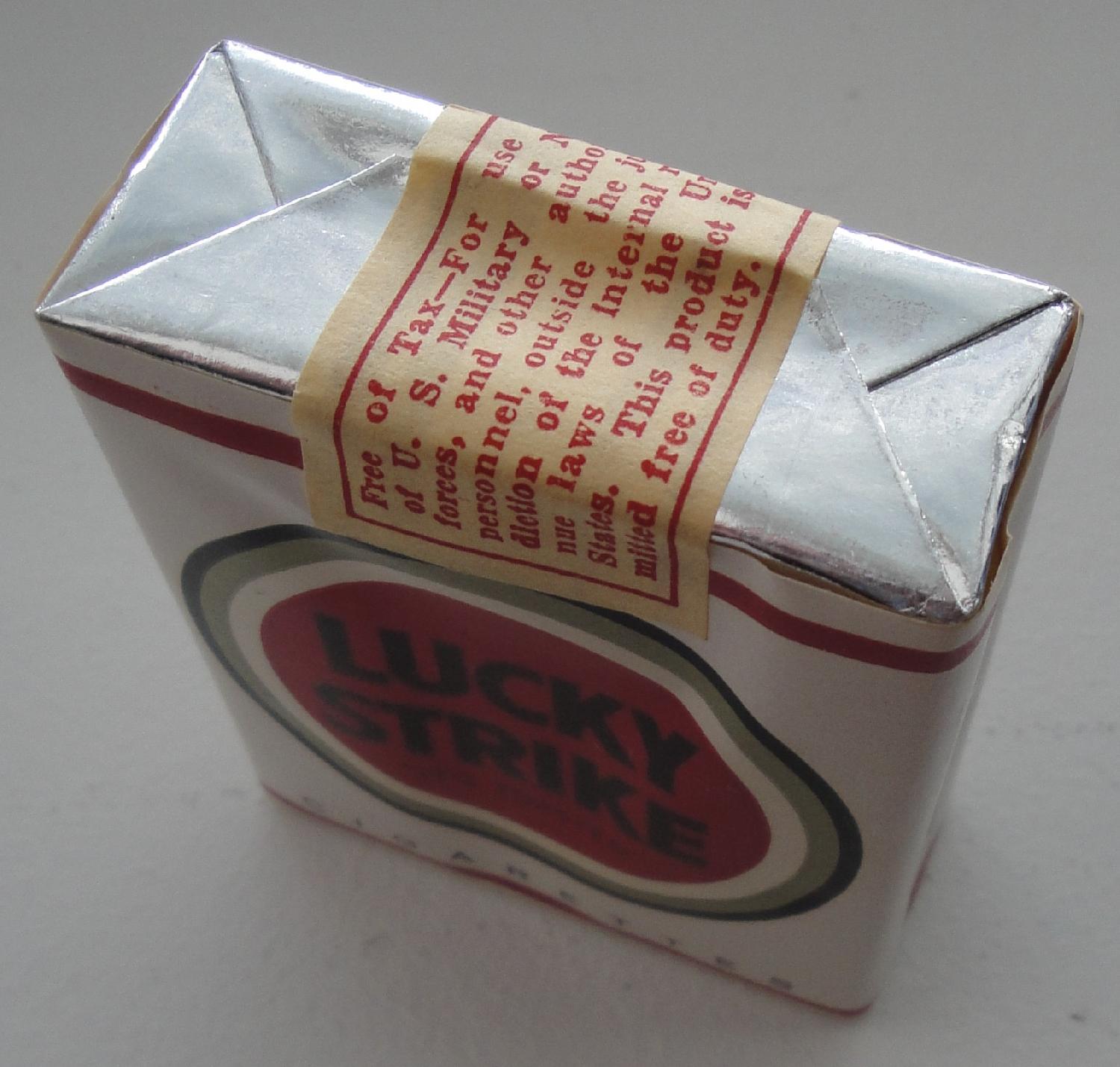 Paquet de 20 cigarettes Lucky Strike non ouvert d'origine avec le timbre de détaxe pour les troupes d'outremer (années 45 ou 50). SANS BLISTER. Frais de port 5€ par mondial relay