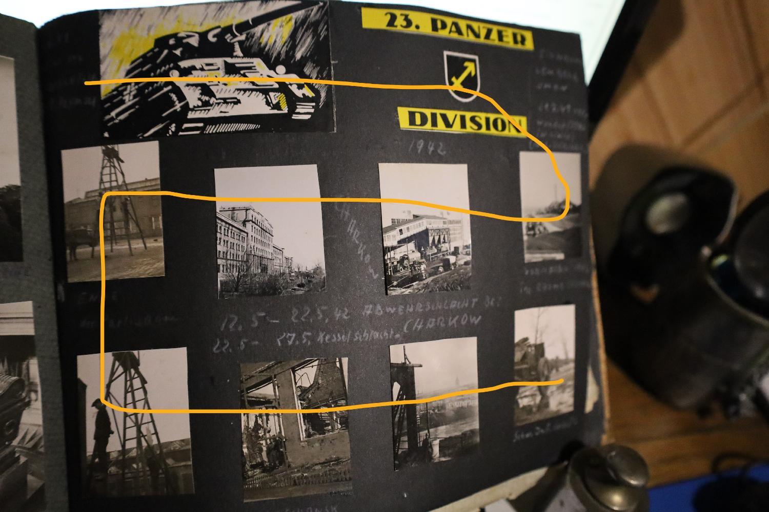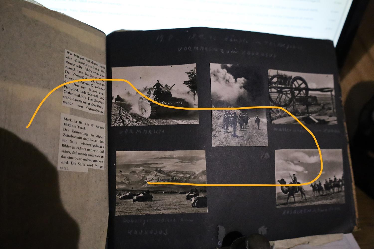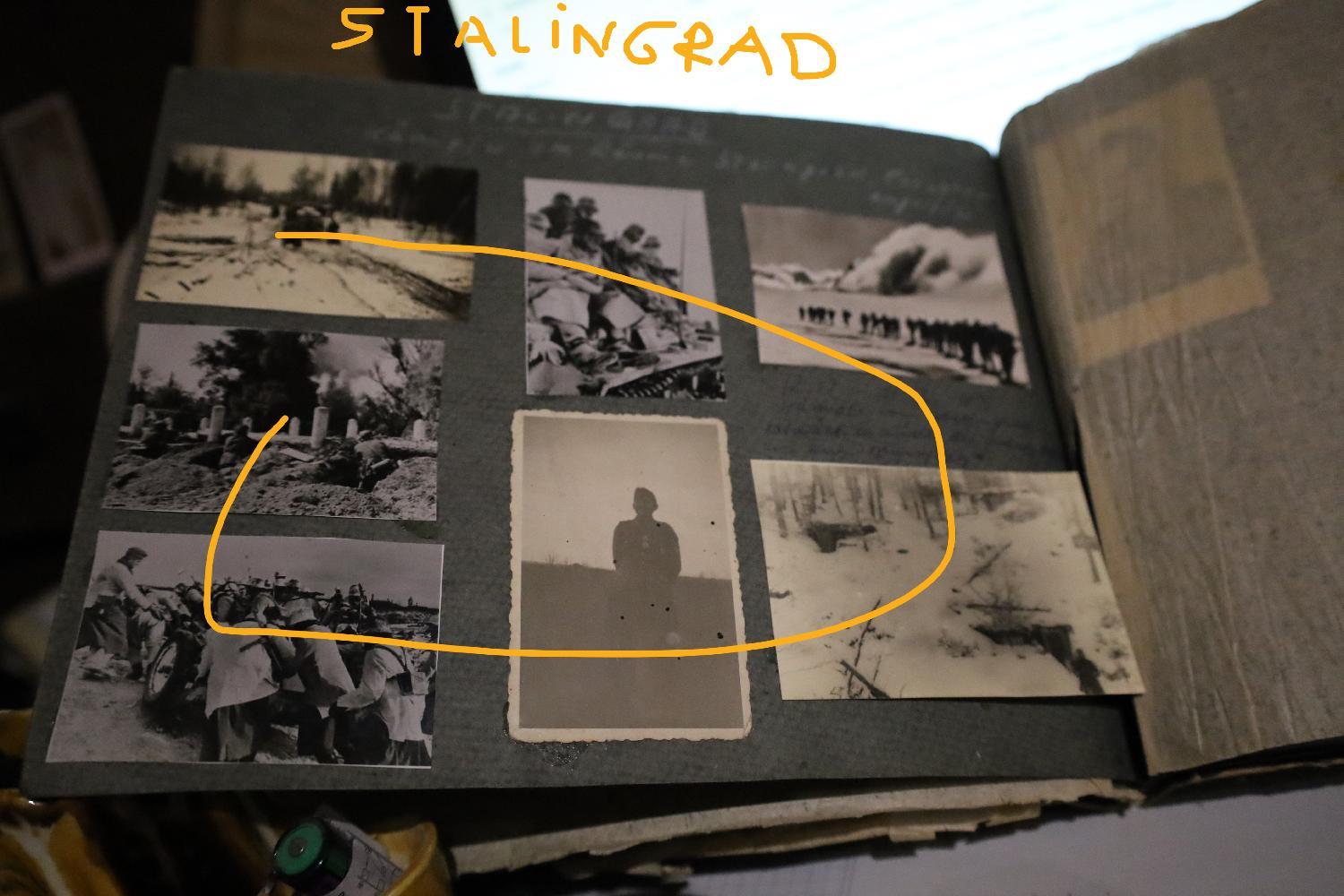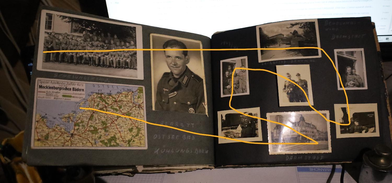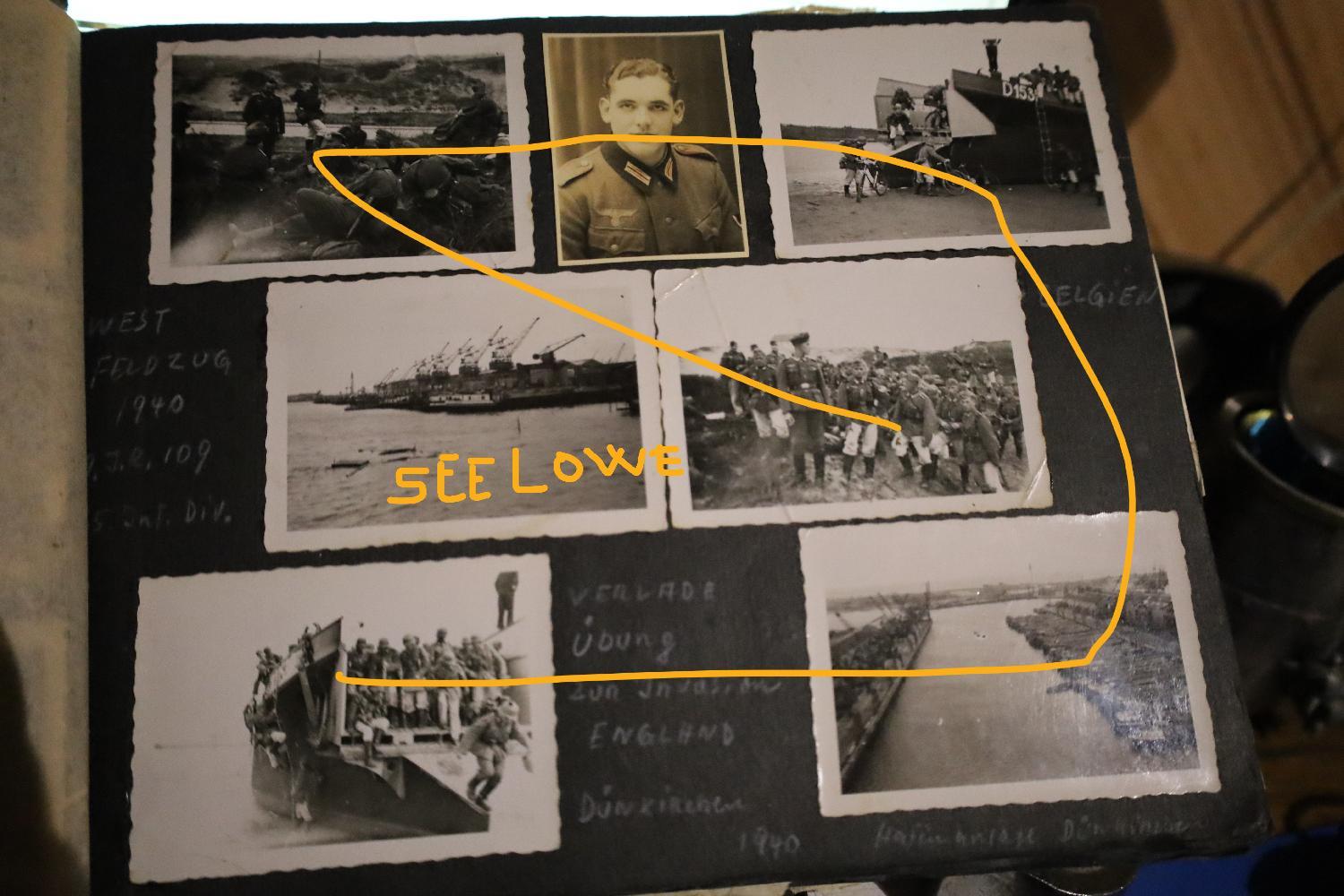 superbe album photos d'un soldat allemand qui à fait entre autre la préparation de "Opération Seelöwe" (invasion de l'Angleterre) qui n'à jamais eu lieu, Stalingrad (soit en temps que participant ou les troupes qui ont essayées de briser l'encerclement...),hôpital de campagne, occupation française de la capitale, et d'autres campagnes jusqu'en 1945....il y à une page datée de 1952 mais plus de photos....présence de photos volantes, une kennkarte (C.I.) un article de journal d'époque sur Stalingrad, bref de quoi mener une enquête pour le parcours de ce soldat! l'album en lui même est en état moyen, quelques photos manquantes mais excellent témoignage de ce conflit de 150/200 photos .Prévoir le port.