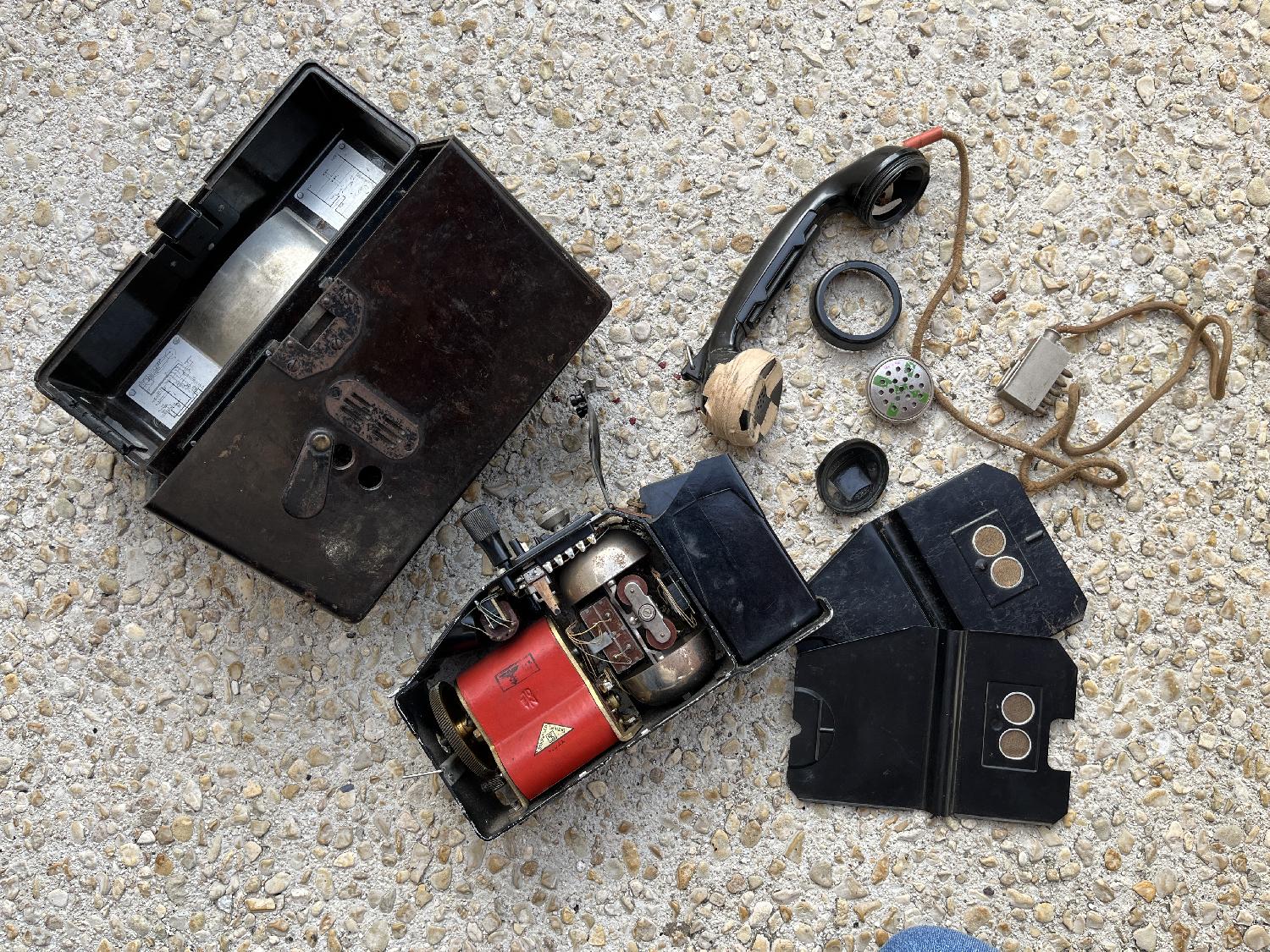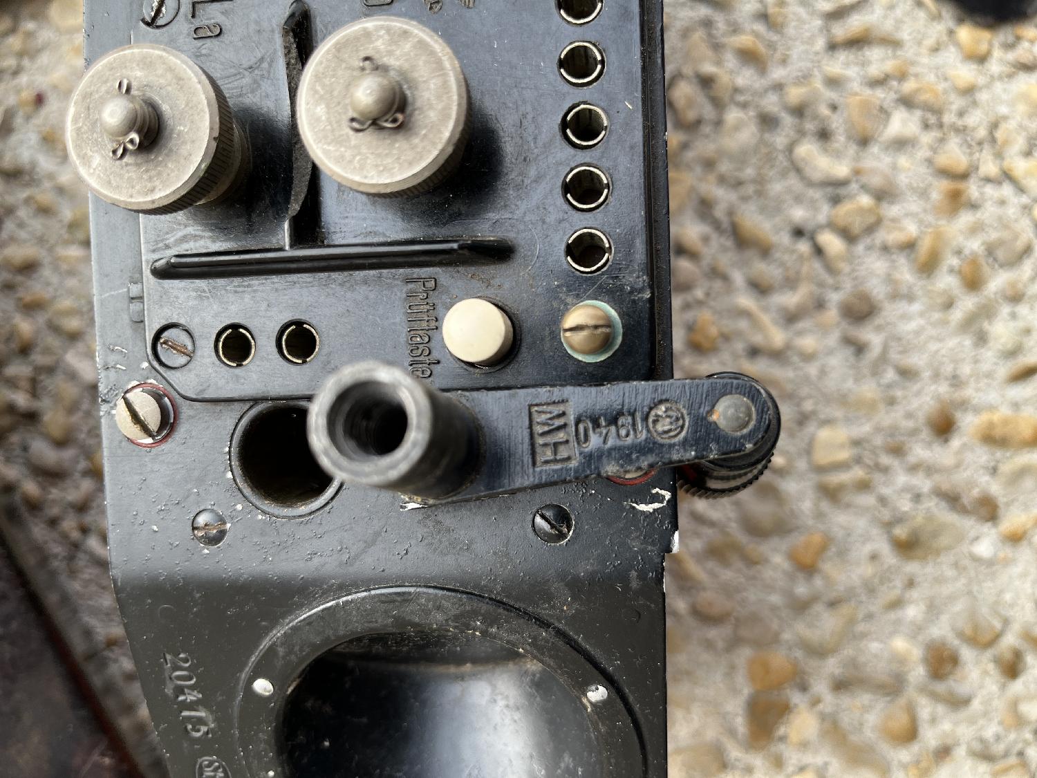 Feldtelefon FF33 de 1939 ( STÖCKER.U.CO à LEIPZIG ) complet avec puits de pile; Combiné ( pastille micro de 1941 ) pastille écouteur présente mais non démontée ( réparation avec sparadrap très ancienne et possible d'époque WW2 ).