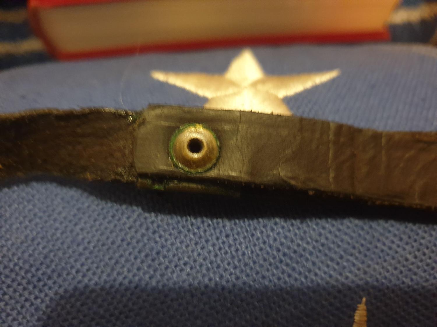 original ww2 attaches triangulaires et fermoir en laiton noirci. rivet non marqué et en laiton noirci, production mi 1944 (source: guide LE CASQUE M1, page 17)