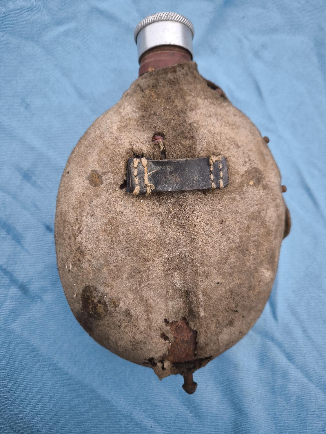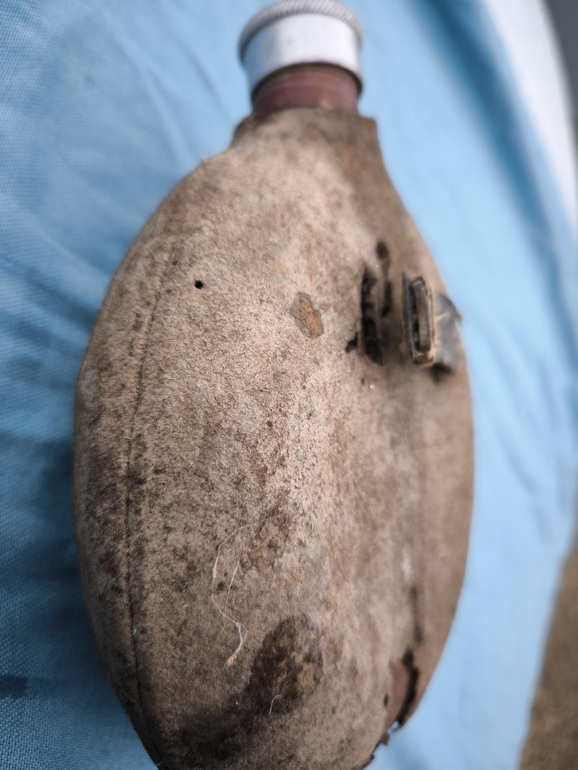 bidon individuel all ww2 état grenier, corps émail rouge bouchon alu housse feutre manque brêlage