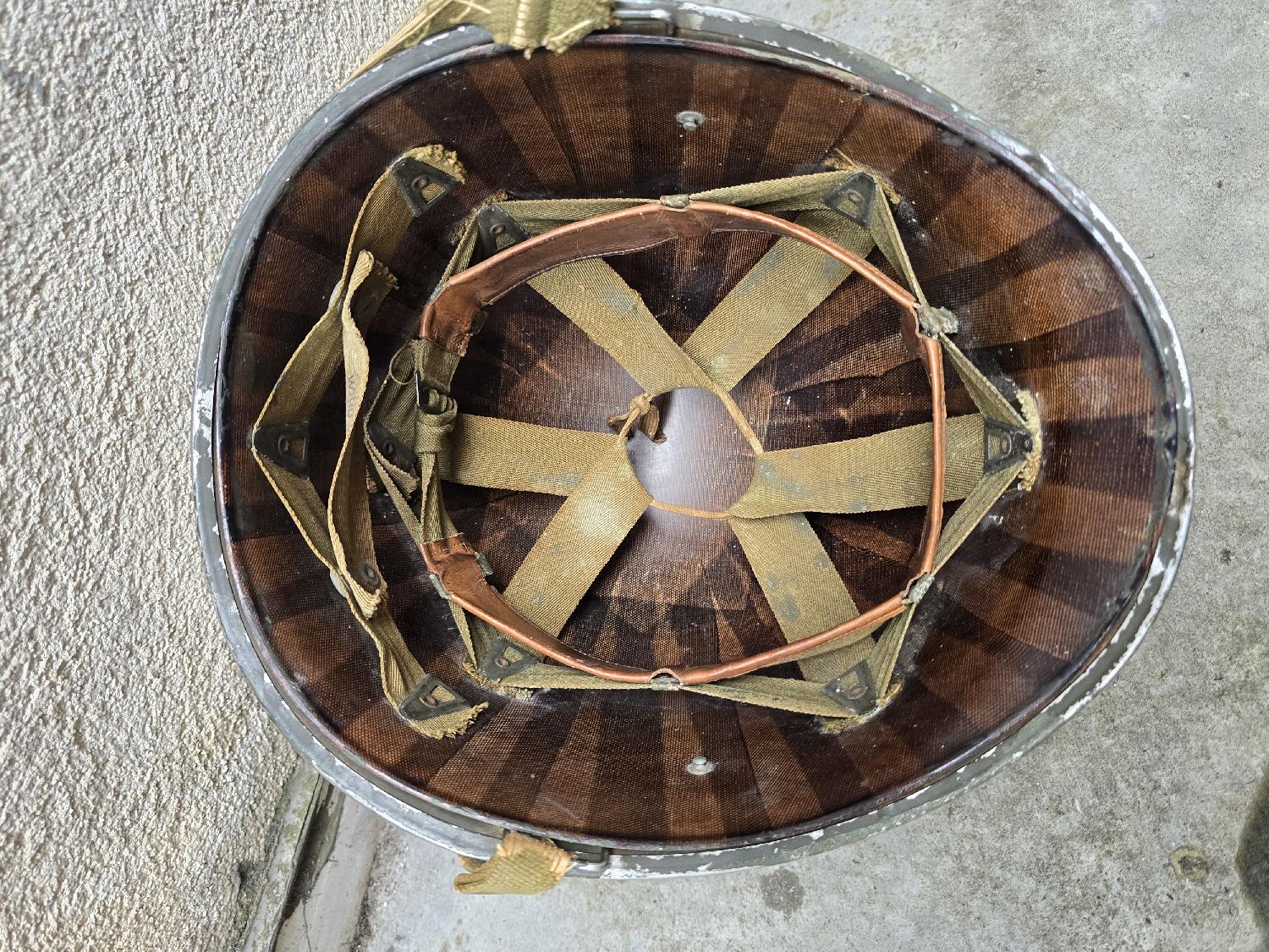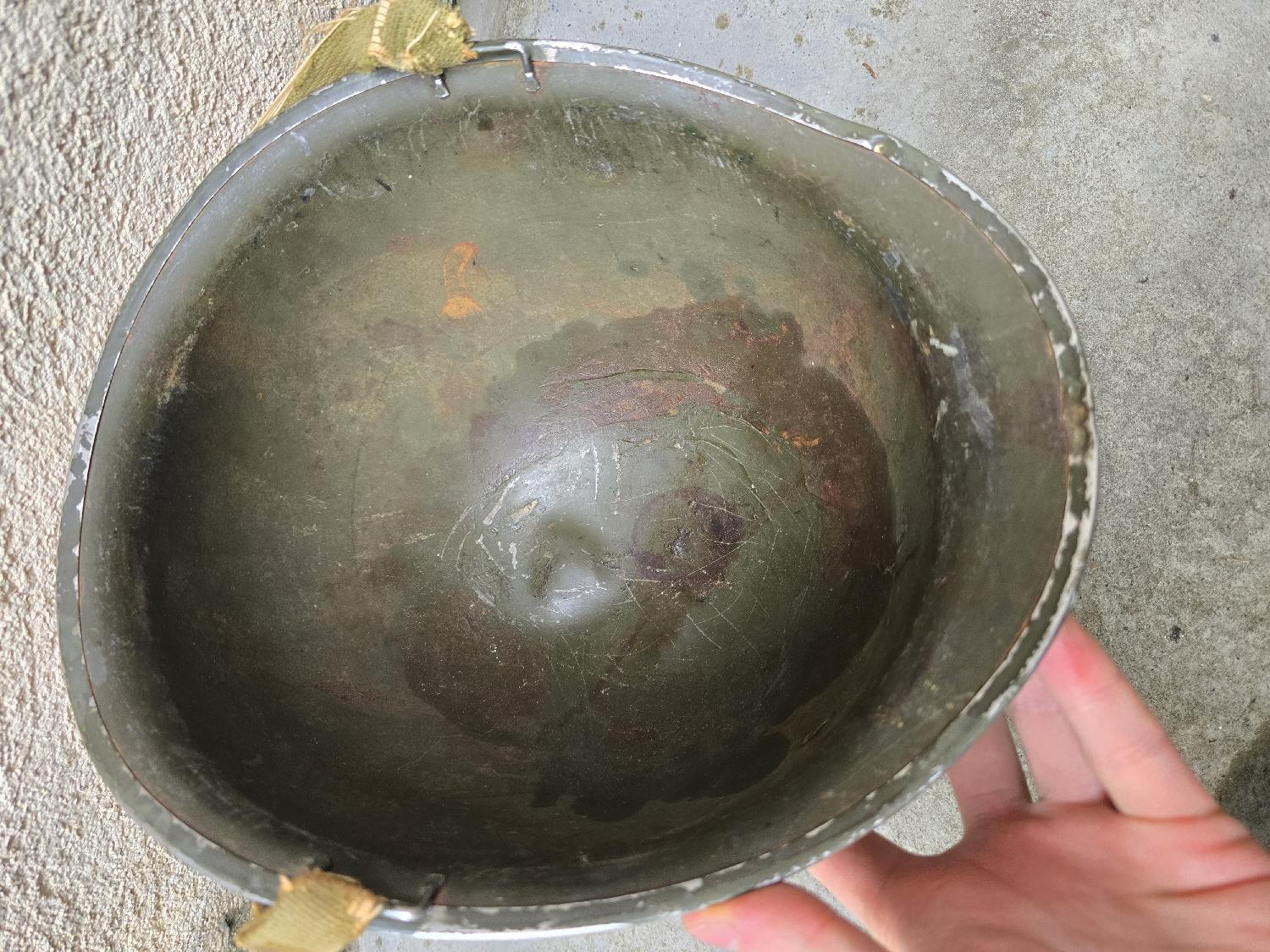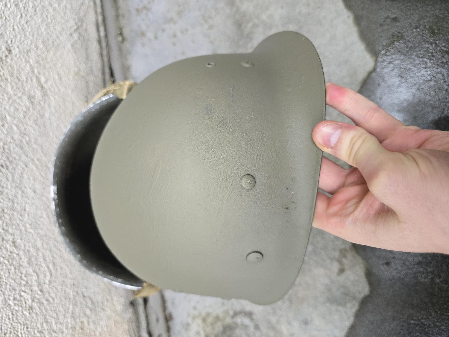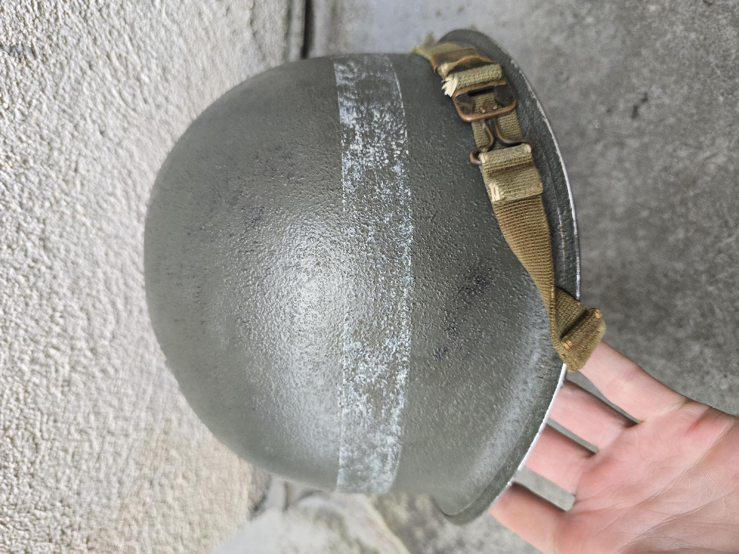A vendre ce Casque US M1 WW2 pattes fixes jonc avant de chez McCord. Liner A Washer peint en vert.