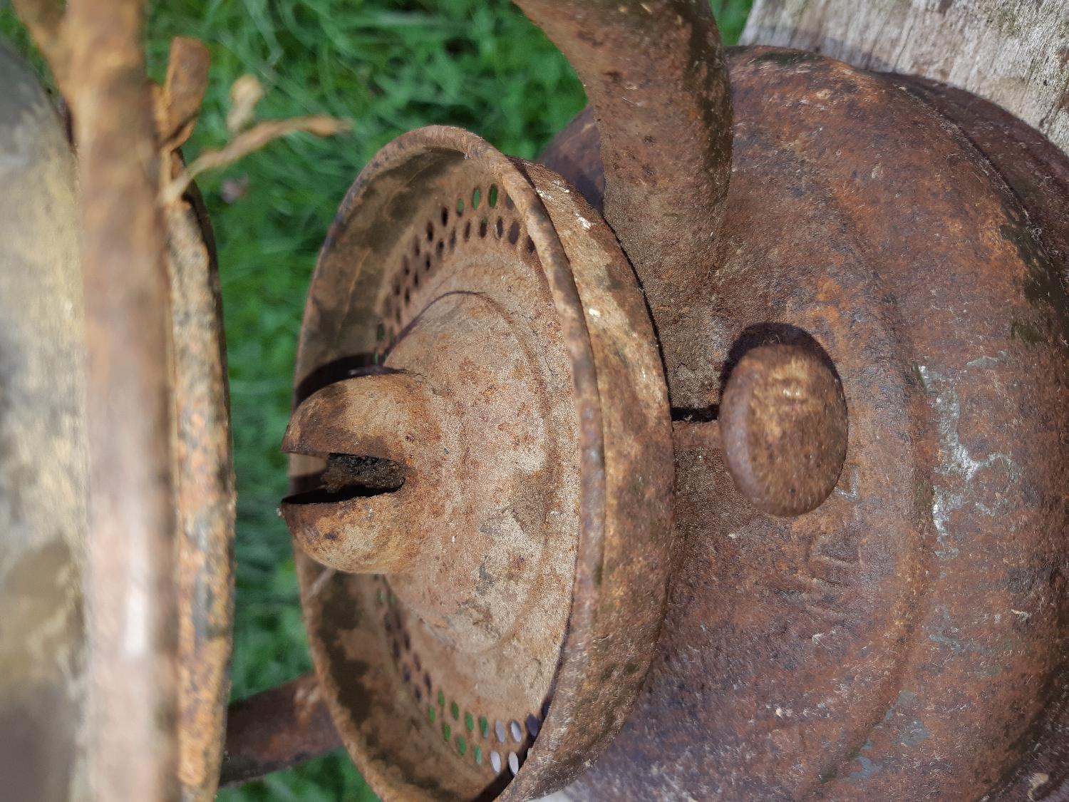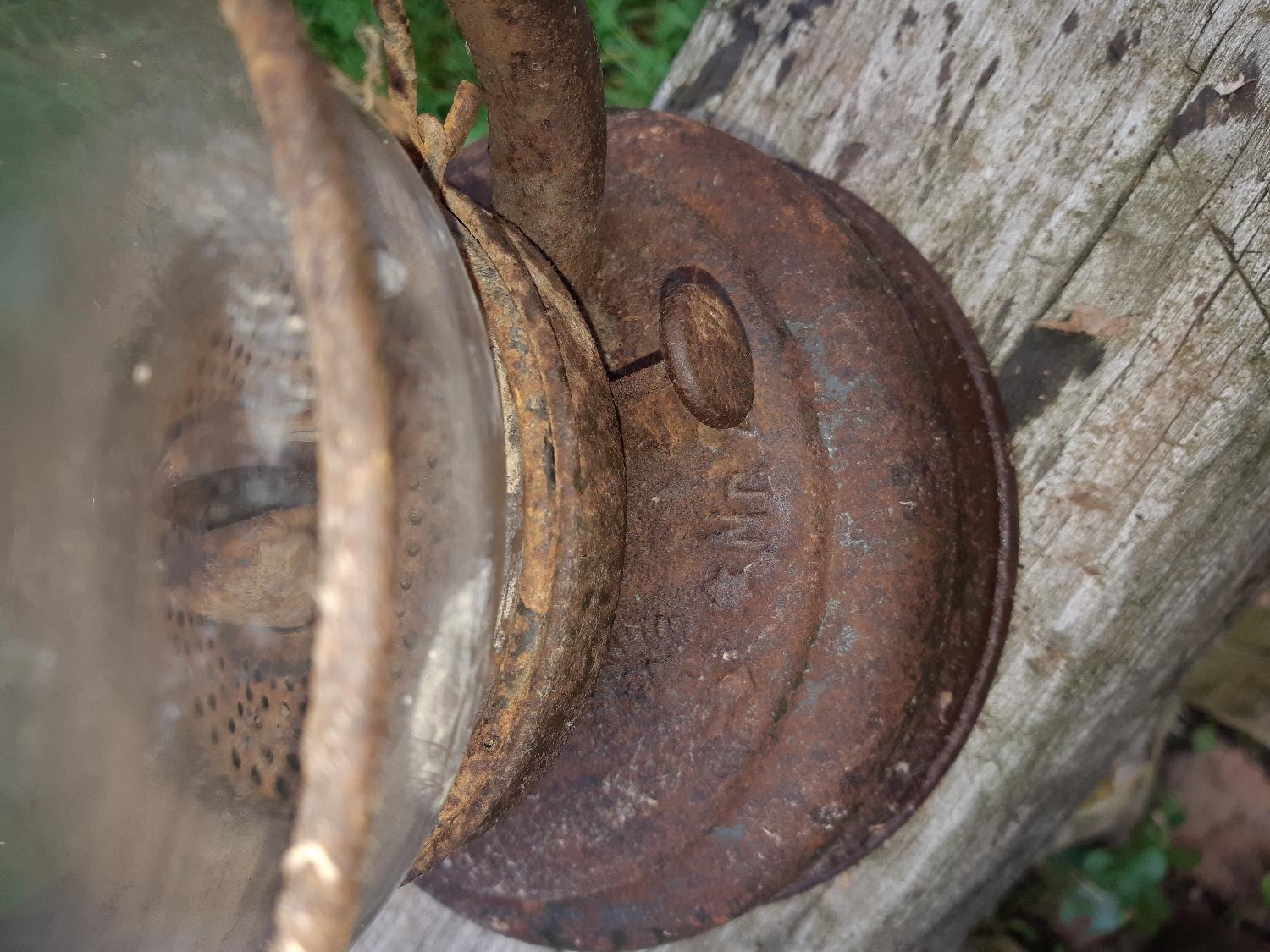 Grande lampe à pétrole Feuerhand 201. Peinture verte reglementaire du temps de guerre (pas d'étamage pour cause de rationnement de l'étain).