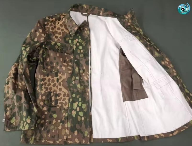 - Vareuse Feldbluse sur base de modèle 43, fermant par 5 boutons, coton camouflage Dot 44, col fermant 1 crochets, 4 poches sans plis watteau et à rabats droits, intérieur en coton blanc.