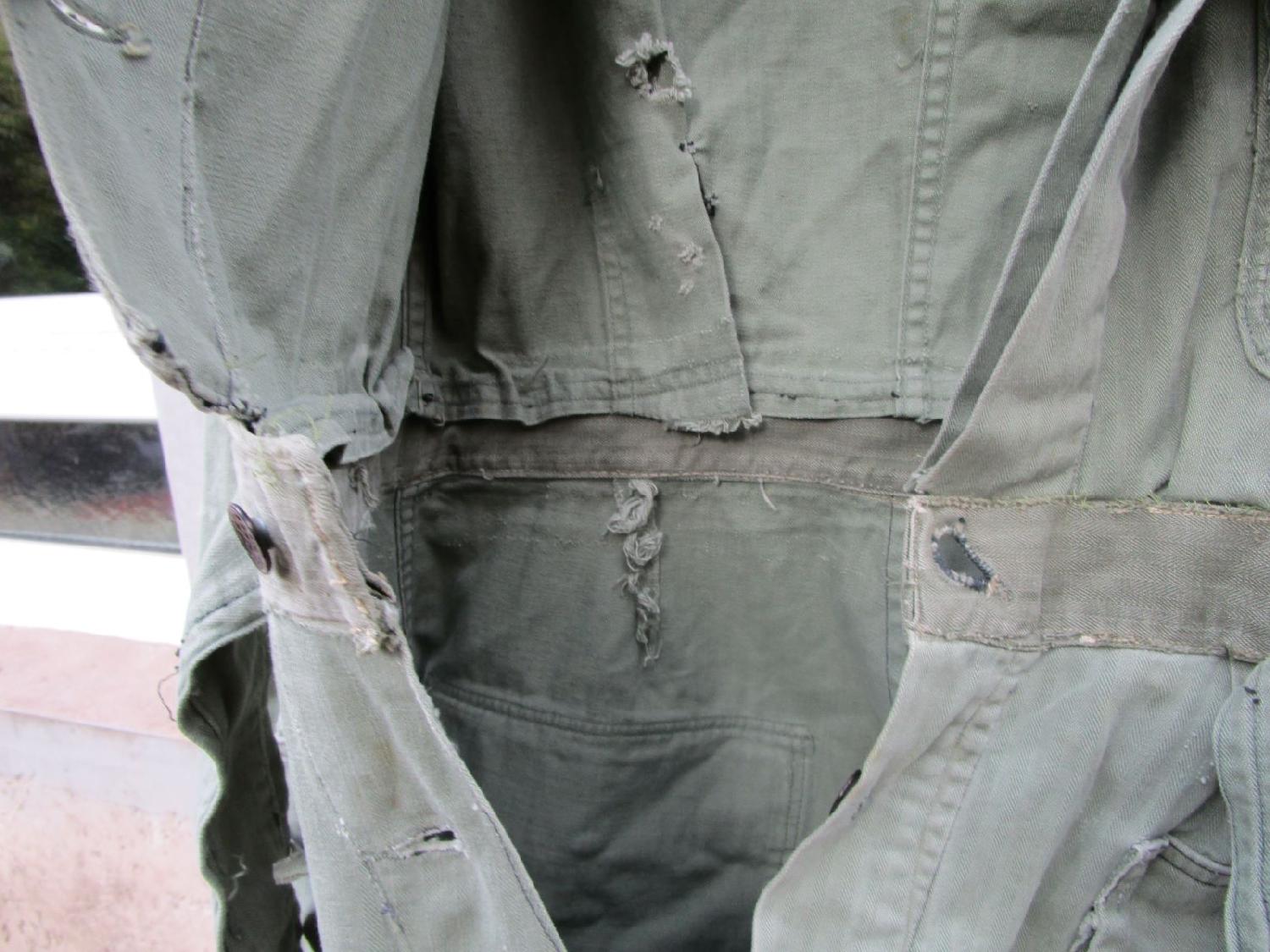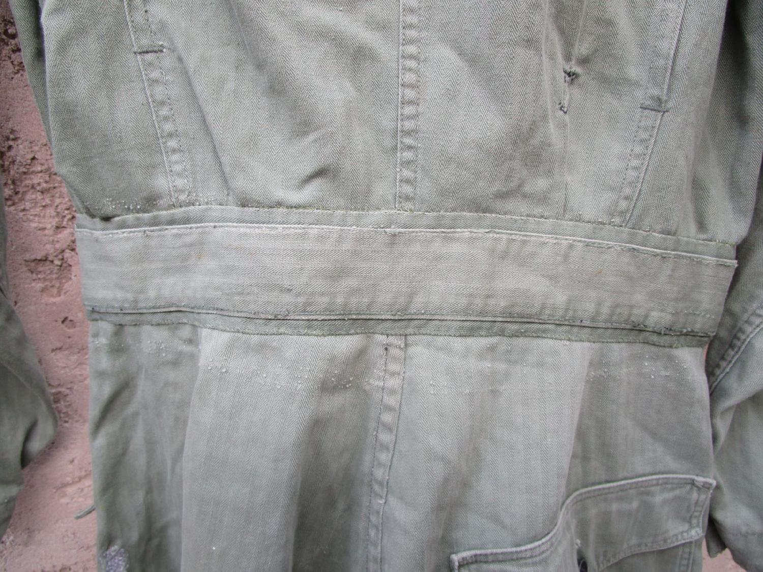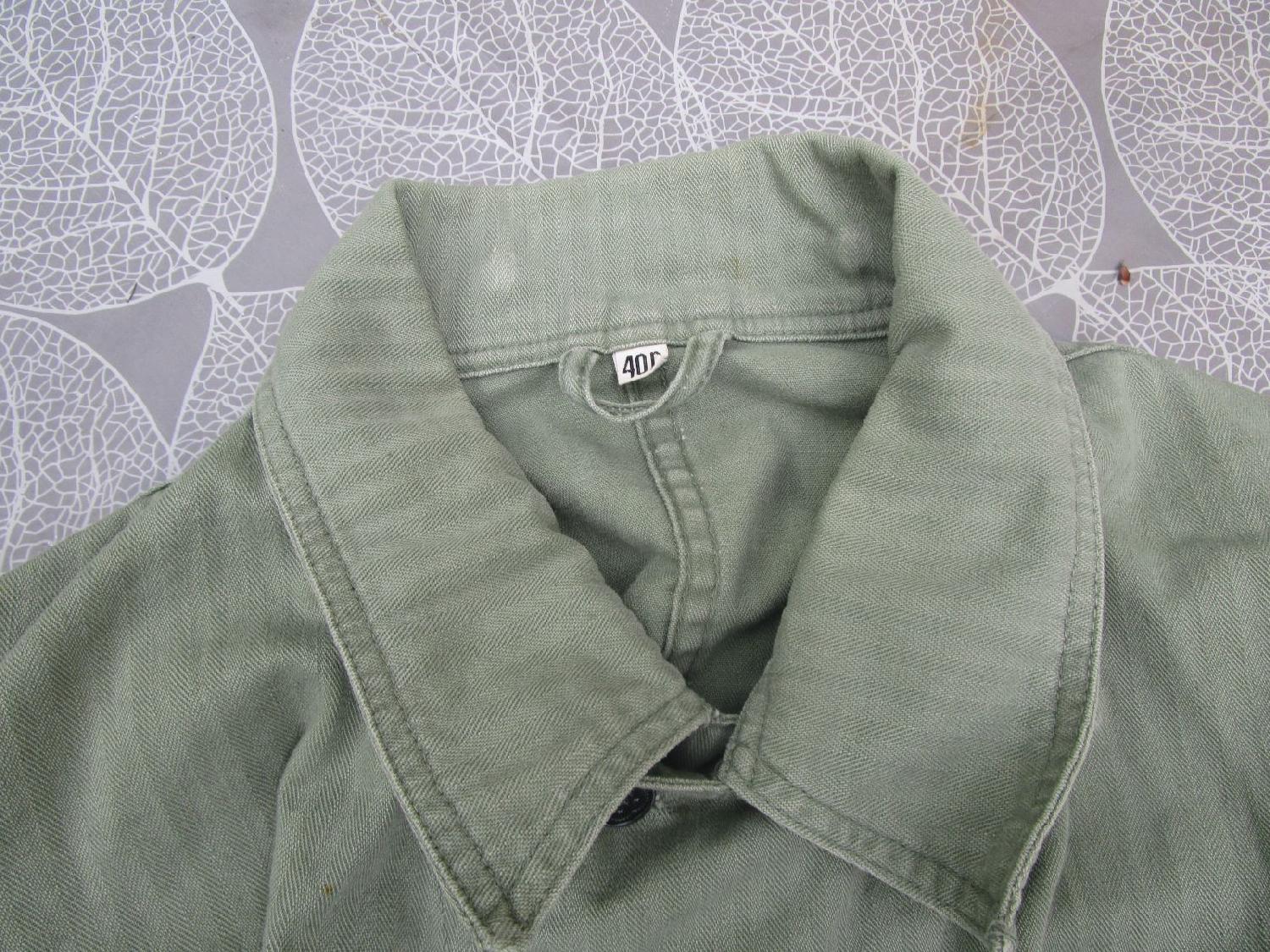 Taille 40R. Une bande de tissus HBT a été ajouté au niveau de la ceinture à l'intérieur (pour renforcer la ceinture ou pour l’agrandir ??). Peut être une modification de l'armée française ?. Manque un bouton à étoile et deux à étoiles différents des autres. Un accroc réparé d'époque sur le haut de la cuisse droite et Déchirure réparée en bas de la jambe droite. Autres photos sur demande. Prévoir 16.60 euros en colissimo ou 7.40 euros par mondial relay.