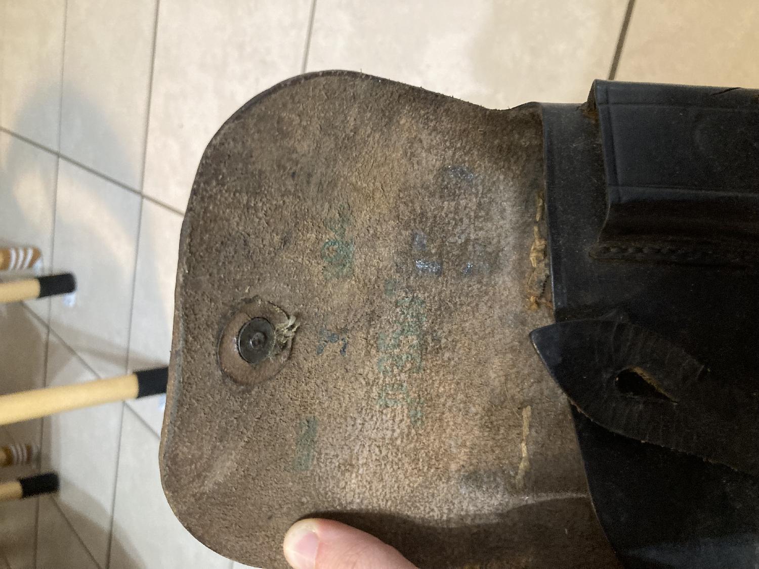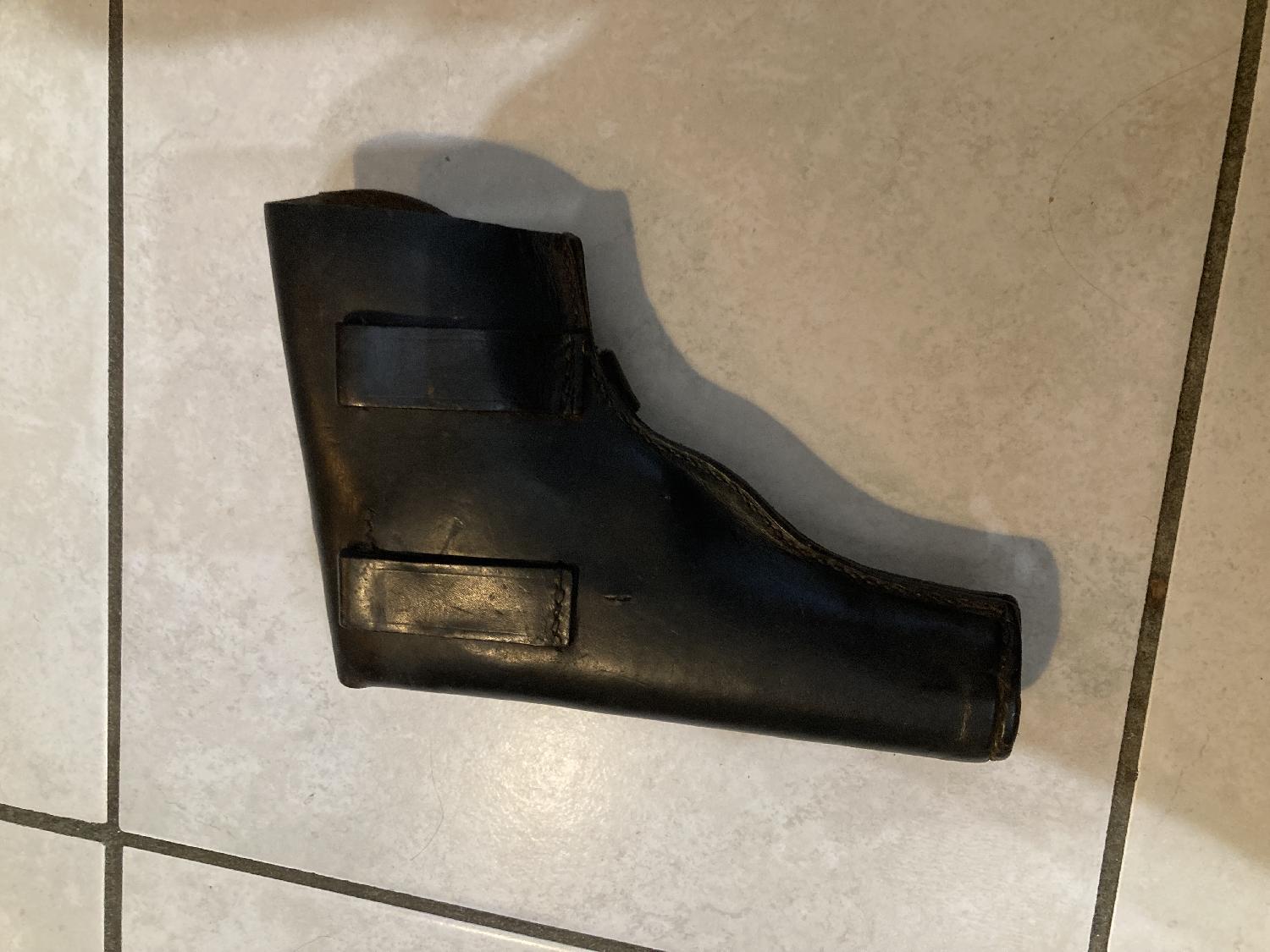 Bel étui de pistolet allemand << P35 RADOM >>, fabrication en cuir noir, bel état général, tamponné sur le rabat intérieur <<< P35 aigle + 194....