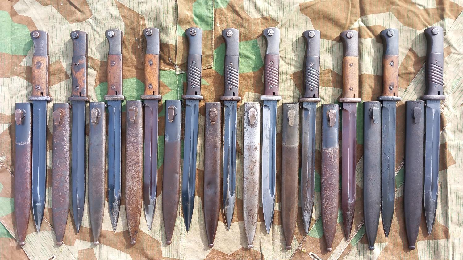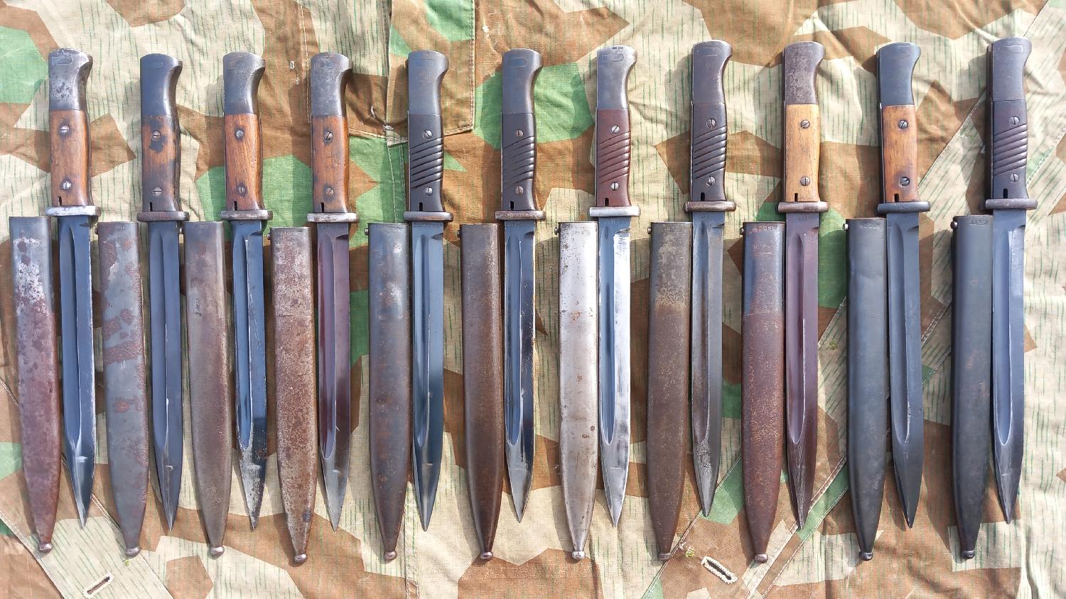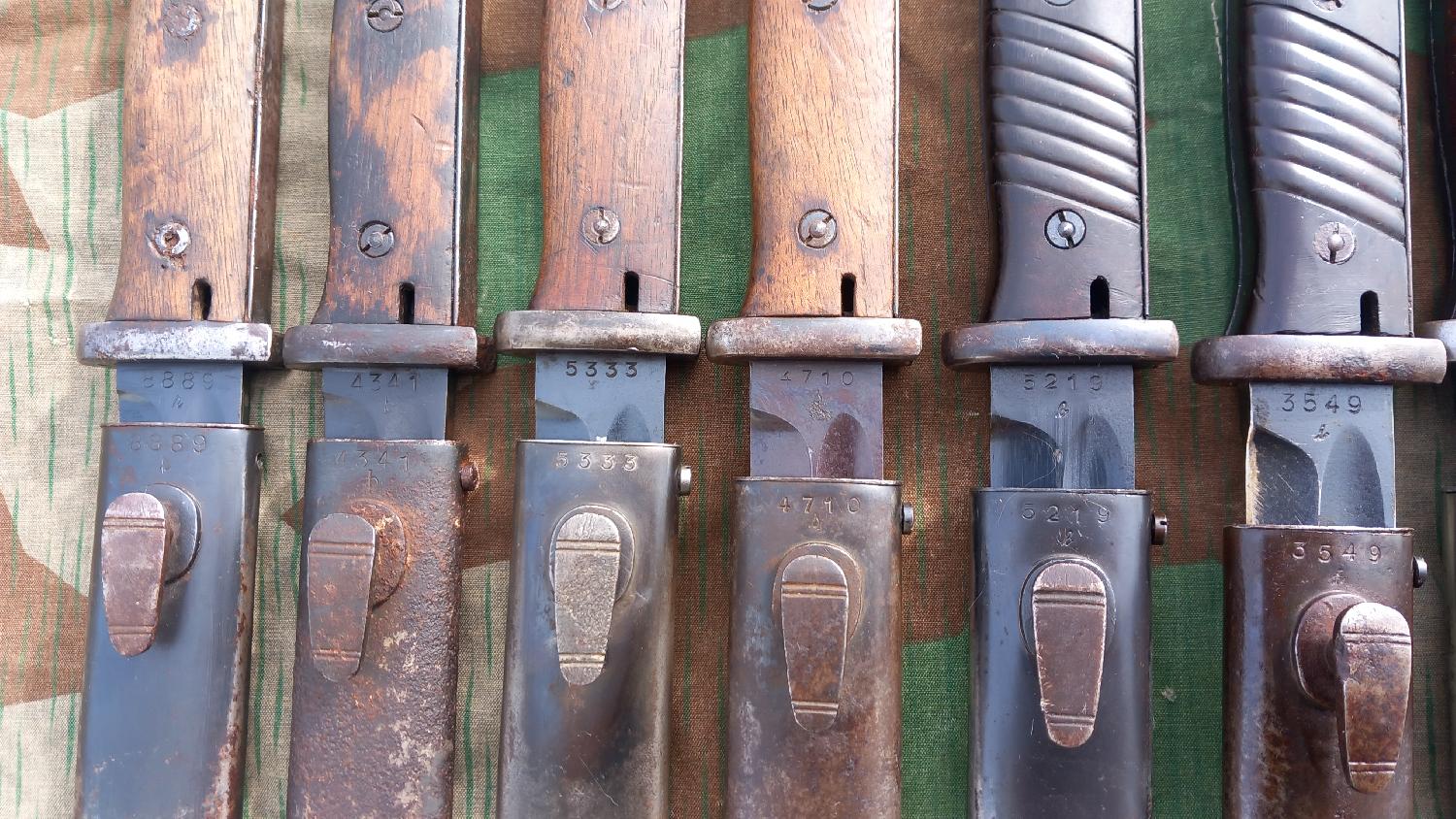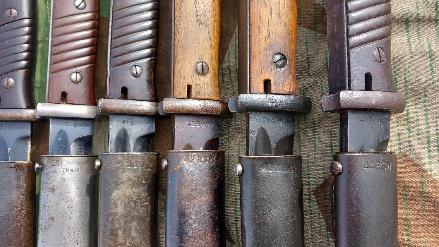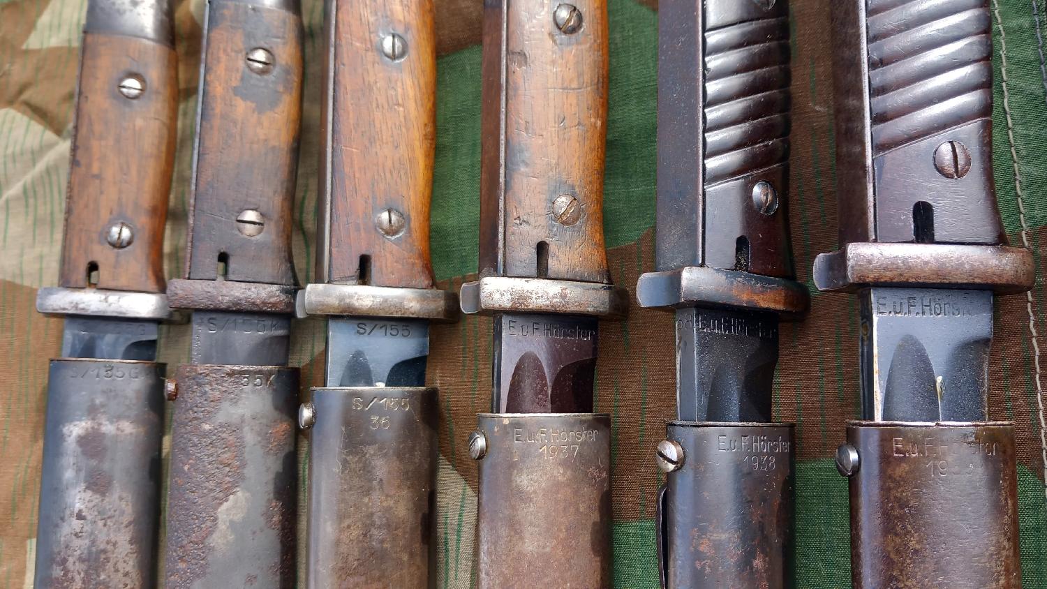 Je vends ce lot de 11 baïonnettes du fabricant Euf Horster (S/155 - ASW) de 1934 à 1944. Certes un des fabricants qui en a produits le plus, mais elles sont toutes monomatricules dans un état correct hormis le fourreau de la S/155K et la lame de 1940 qui à la moitié du bronzage.