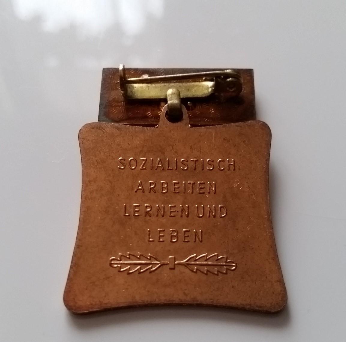 Médaille des travailleurs socialistes de l’Allemagne de l’Est (RDA). Complète avec son drapeau métallique et son agrafe. Très bon état.