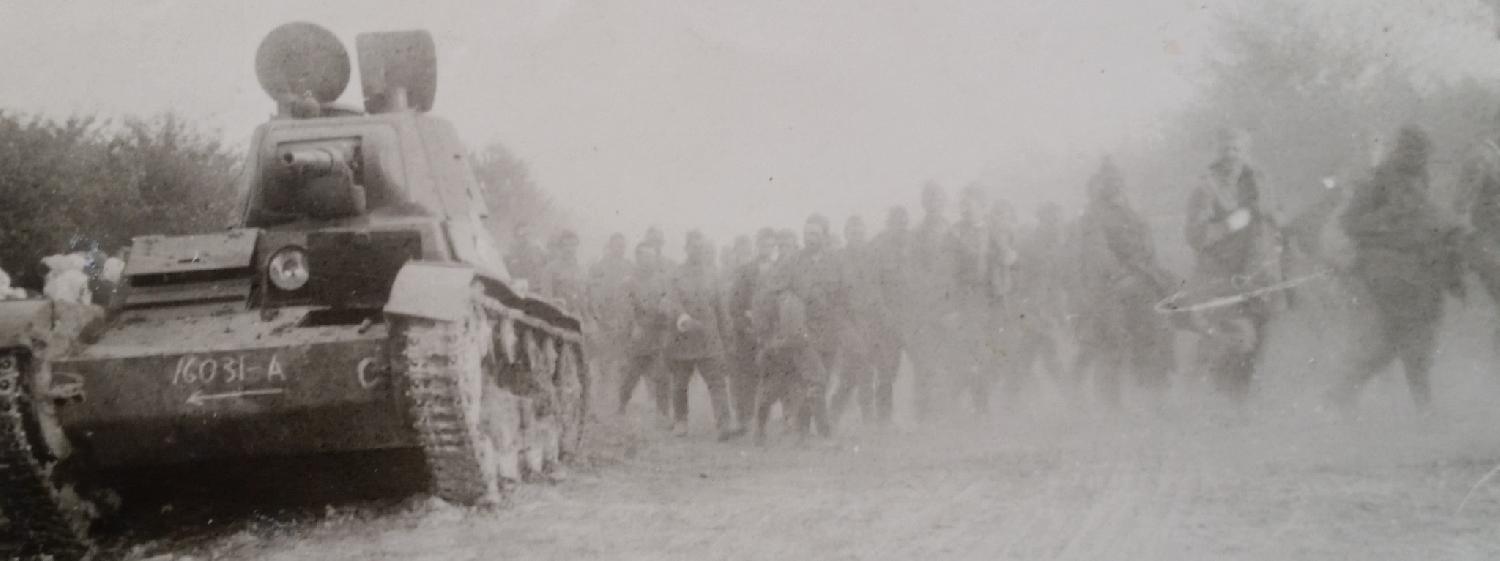 Photo d’un char T 26 et d’une colonne de prisonniers russes