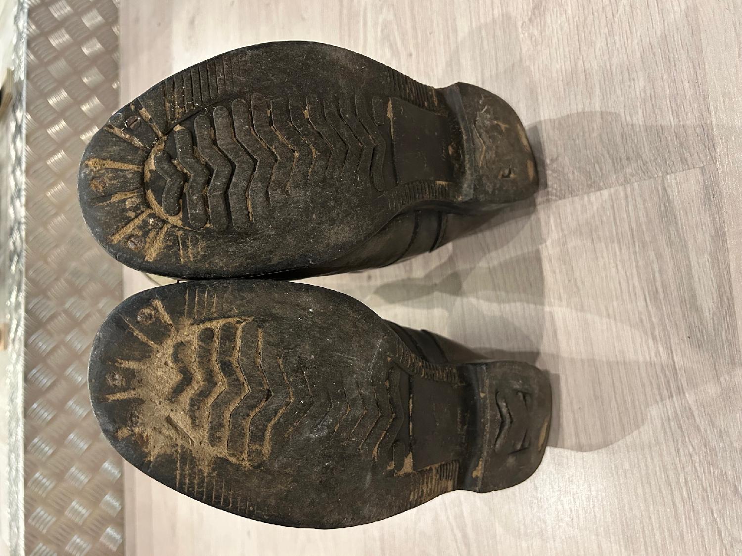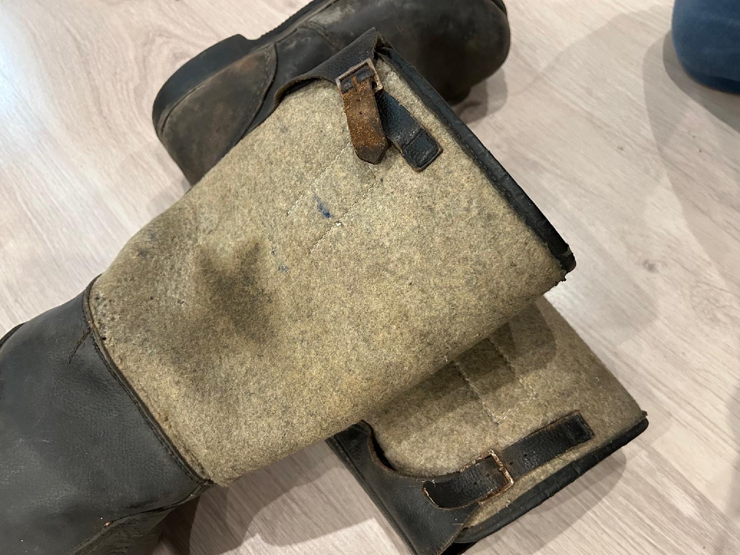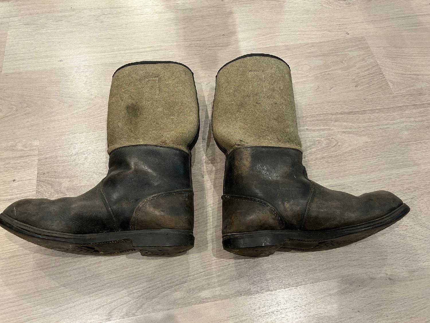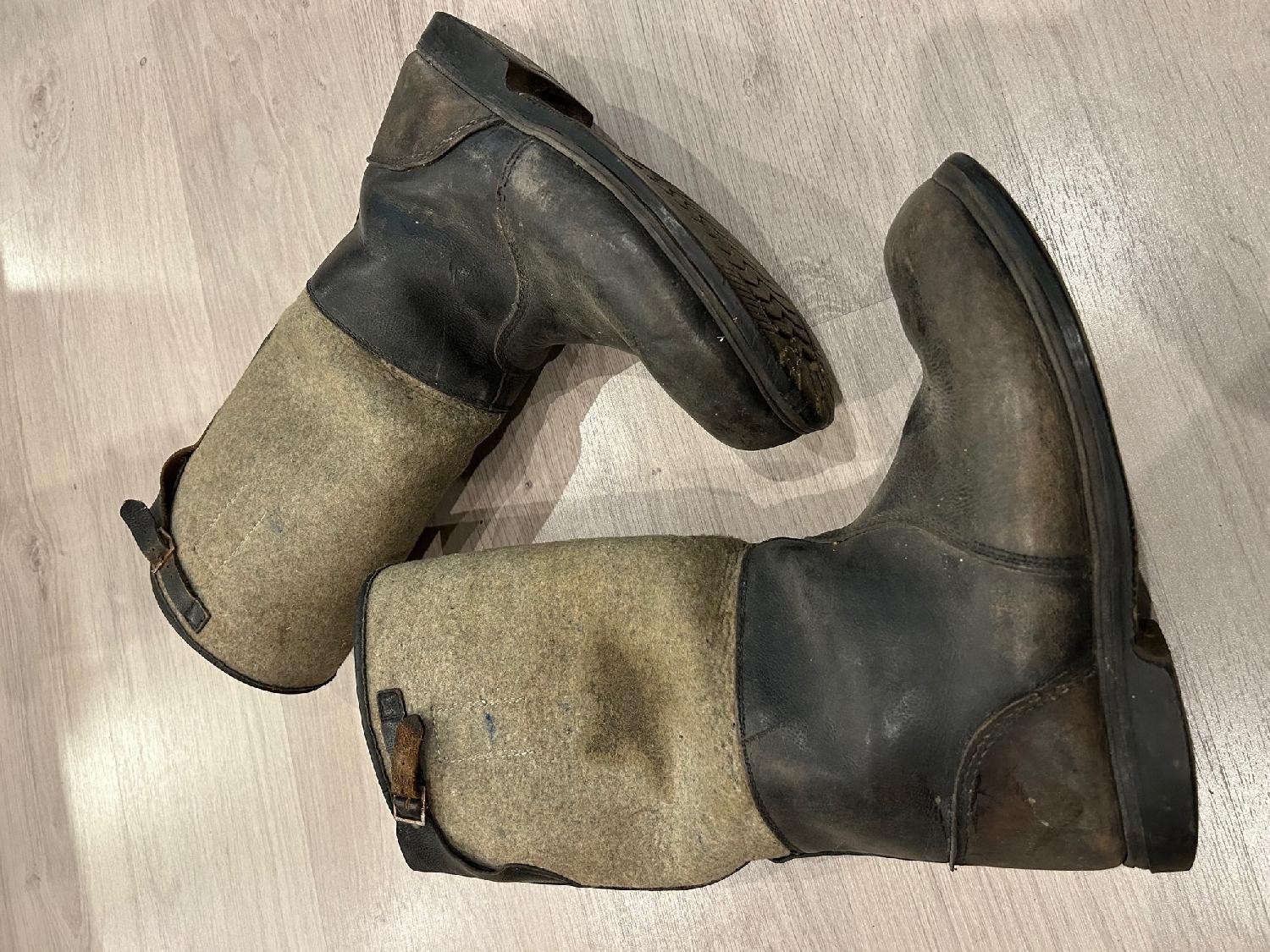 Bottes feutres dans leur jus et homogène. Bien porté et usé. Idéal pour monter sur mannequin. Taille environ 45. Frais de port en supplément pour la France métro 10 euros.