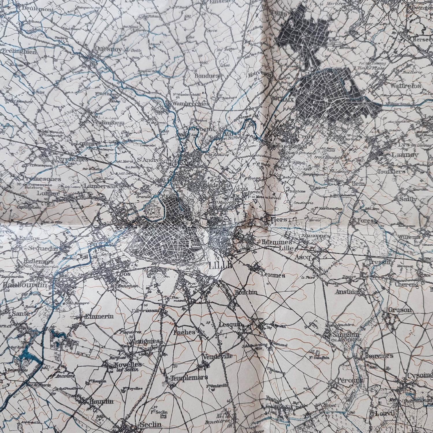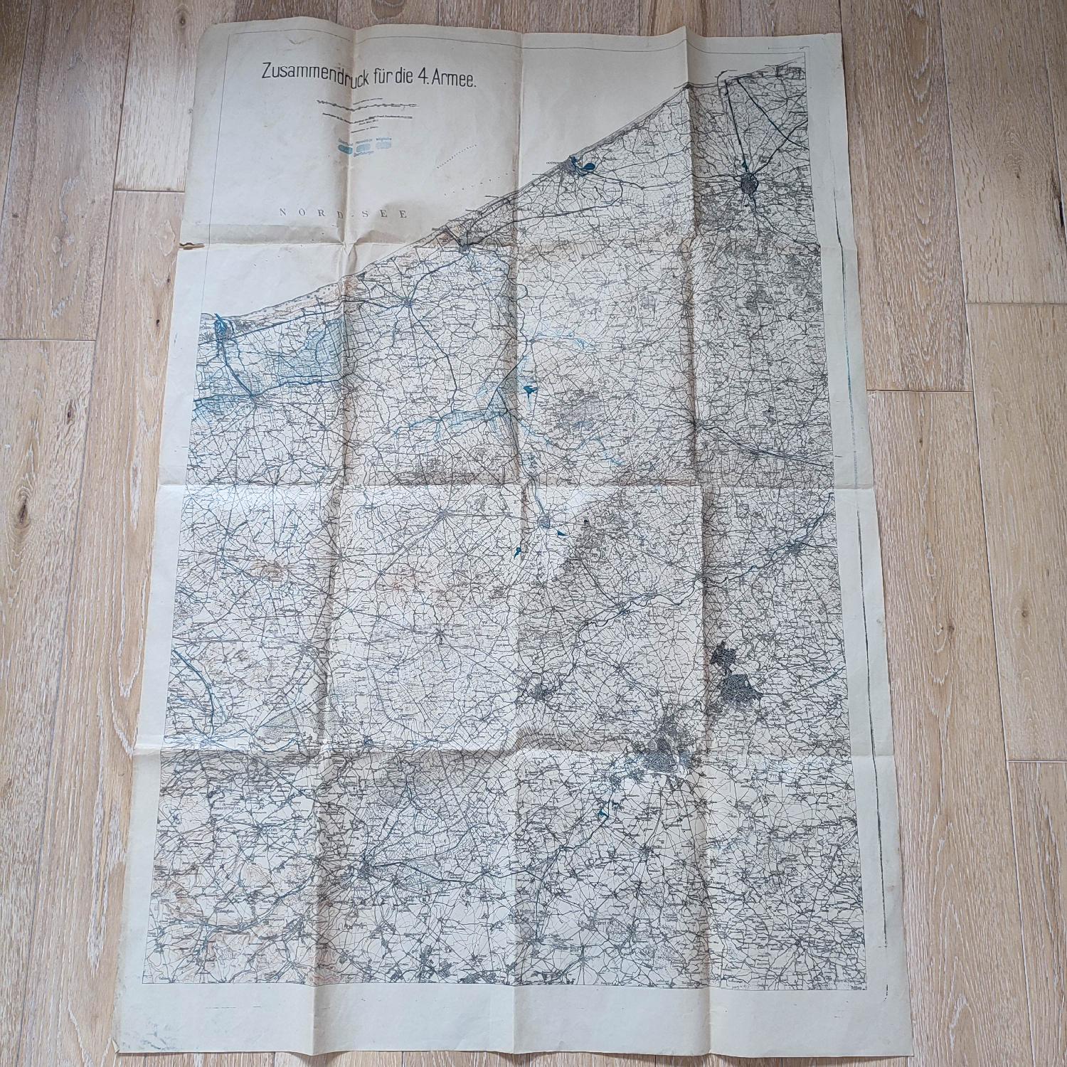 Carte d'état-major Allemande de la 4eme Armée. Datée 1918. Secteur Mer du Nord (Lille – Béthune – Dunkerque – Bruges) Dimensions 76 x 110 cms. Trés bon état. Sera envoyé pliée comme trouvée. Prix 25 euros. Port et emballage 5 euros par Mondial Relay France