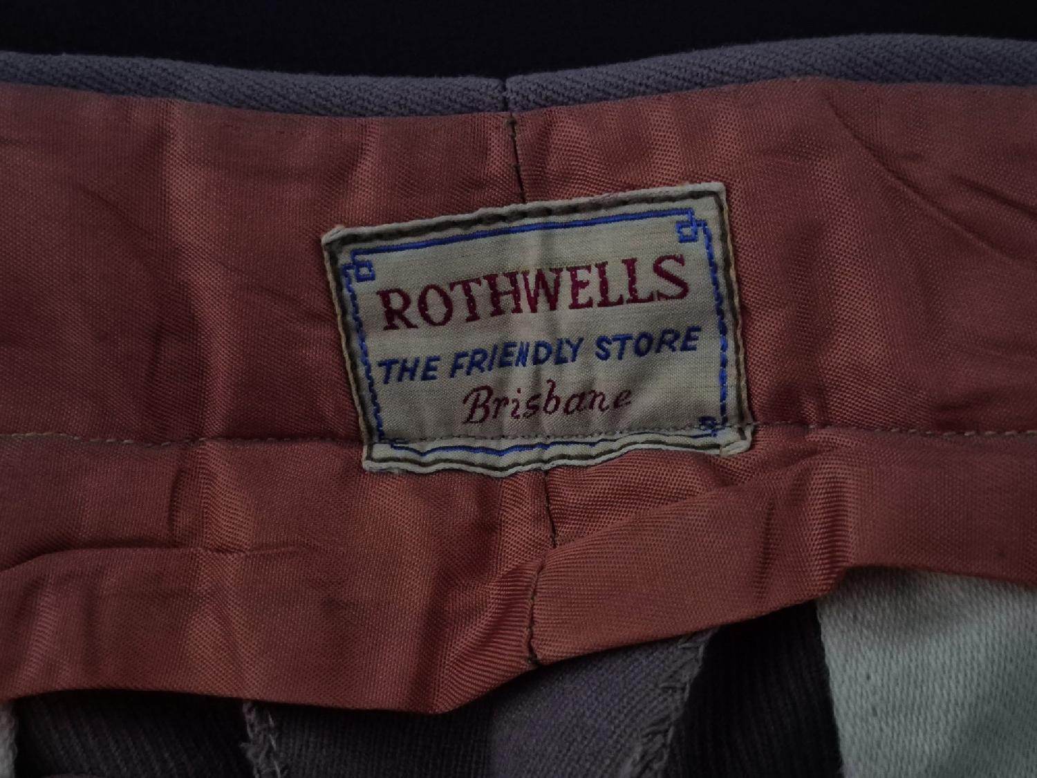 Fabrication tailleur de couleur " pink ", étiquette présente à l'intérieur du pantalon indiquant une fabrication australienne de la maison Rothwells the friendly store dans la ville de Brisbane.