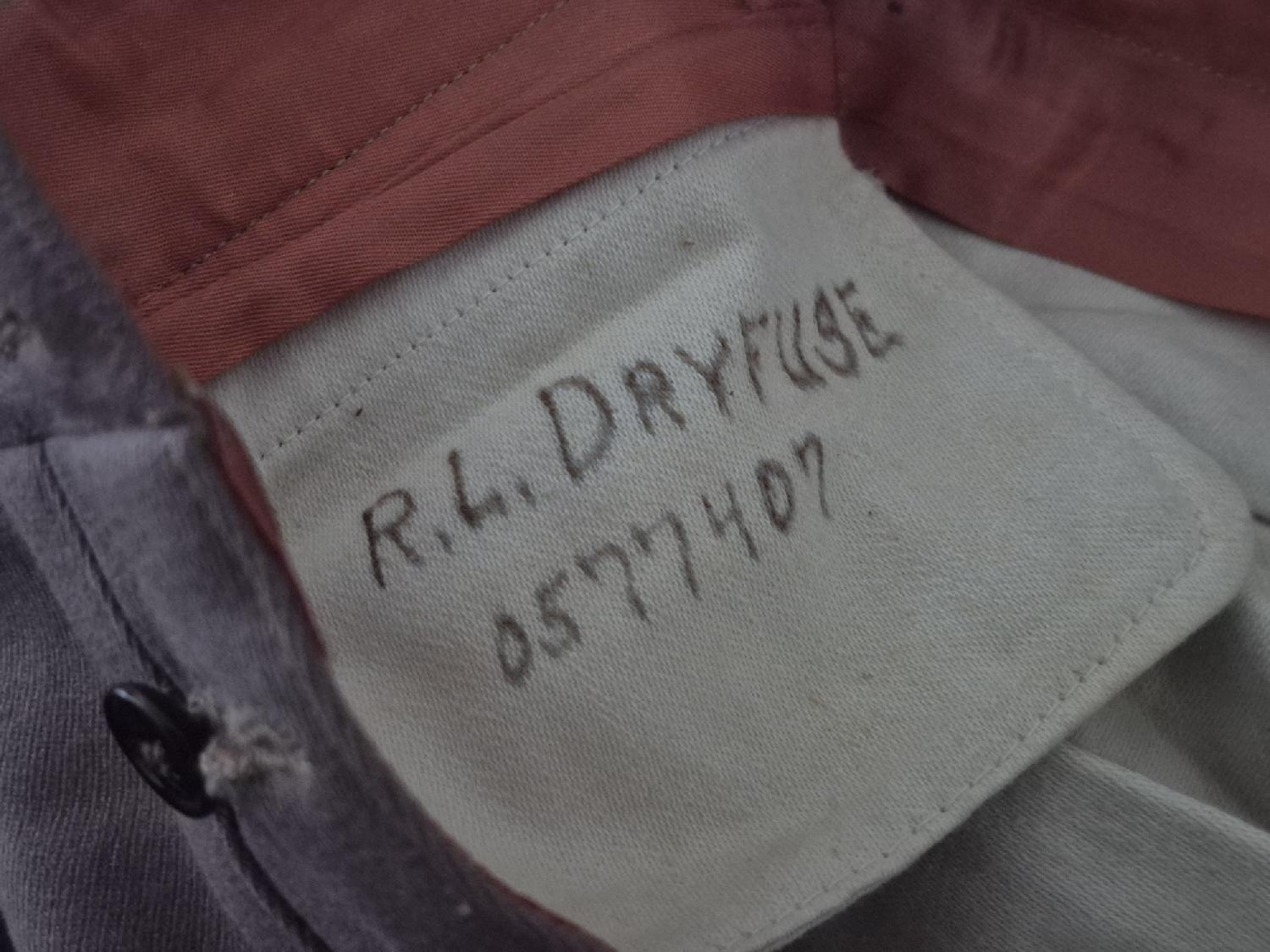 Le pantalon présente une belle couleur et une belle condition, l'officier y a apposé son nom et matricule à l'intérieur au niveau d'une poche, " R.L. DRYFUSE 0577407.