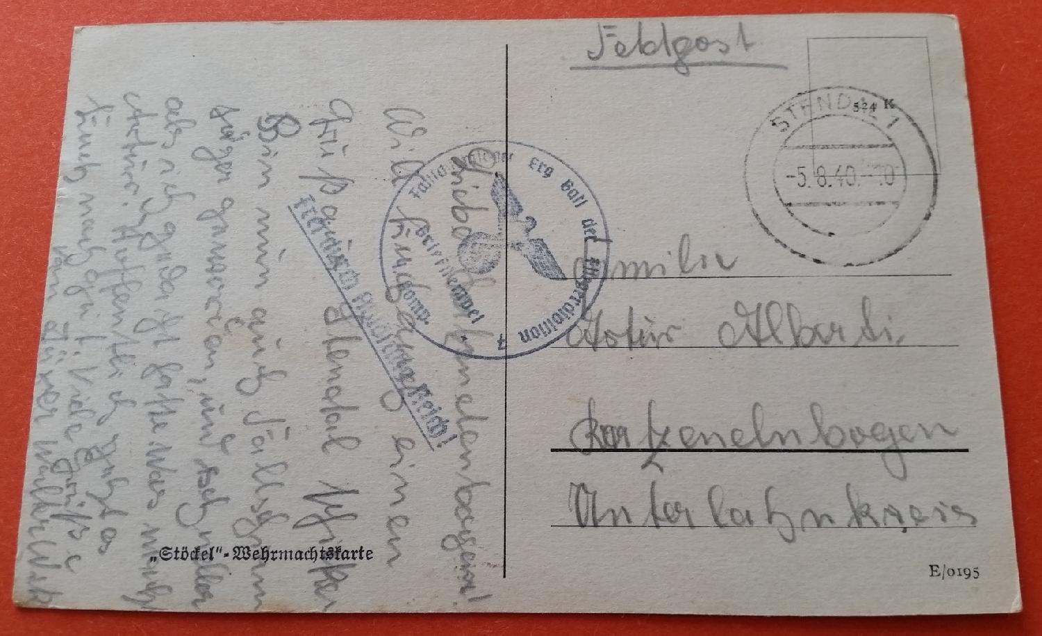 Photo – carte postale représentant un chasseur Messerschmidt Me 109, dans une de ses premières versions officielles utilisées par la Luftwaffe. Format 9 cm sur 14,1 cm. Au revers, texte manuscrit daté du 05 août 1940, avec tampon du Fallschirmjäger Erg Bataillon der Fliegerdivision 7. Il s’agit de la première unité aéroportée allemande et le creuset de l’arme parachutiste du IIIème Reich. Elle s’illustre essentiellement en 1940 et 1941 lors des opérations au Danemark, en Norvège, en Hollande, sur la canal Albert en Belgique, en Grèce et en Crète. Malgré parfois des pertes très lourdes en hommes et en matériels de transport, son engagement est décisif dans chacune de ces campagnes. Elle est ensuite utilisée comme une division d’infanterie traditionnelle en URSS à partir de l’automne 1941 jusqu’au printemps 1943. Elle est transformée ensuite en 1. Fallschirmjäger-Division. Très bon état. Rare.