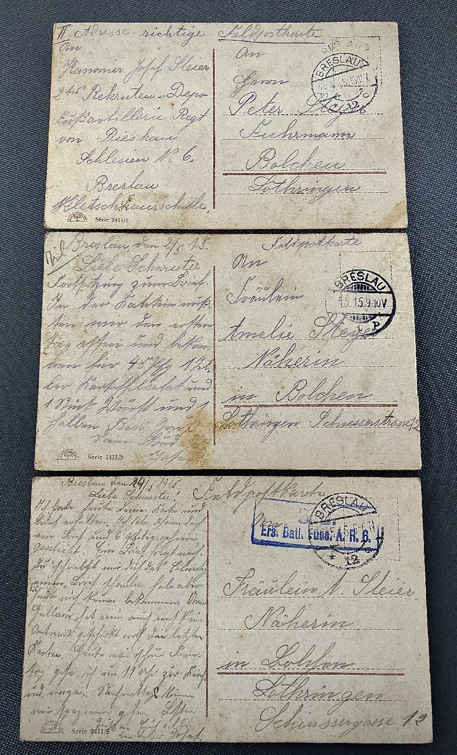 Écrites du même soldat (Ers.Batl.Fuss.A.R 6 à Breslau) et adressées à sa même famille de Bolchen (BOULAY en Lorraine) - toutes datées 1915 - En TTBE avec belles couleurs (sans pliures ou déchirures).