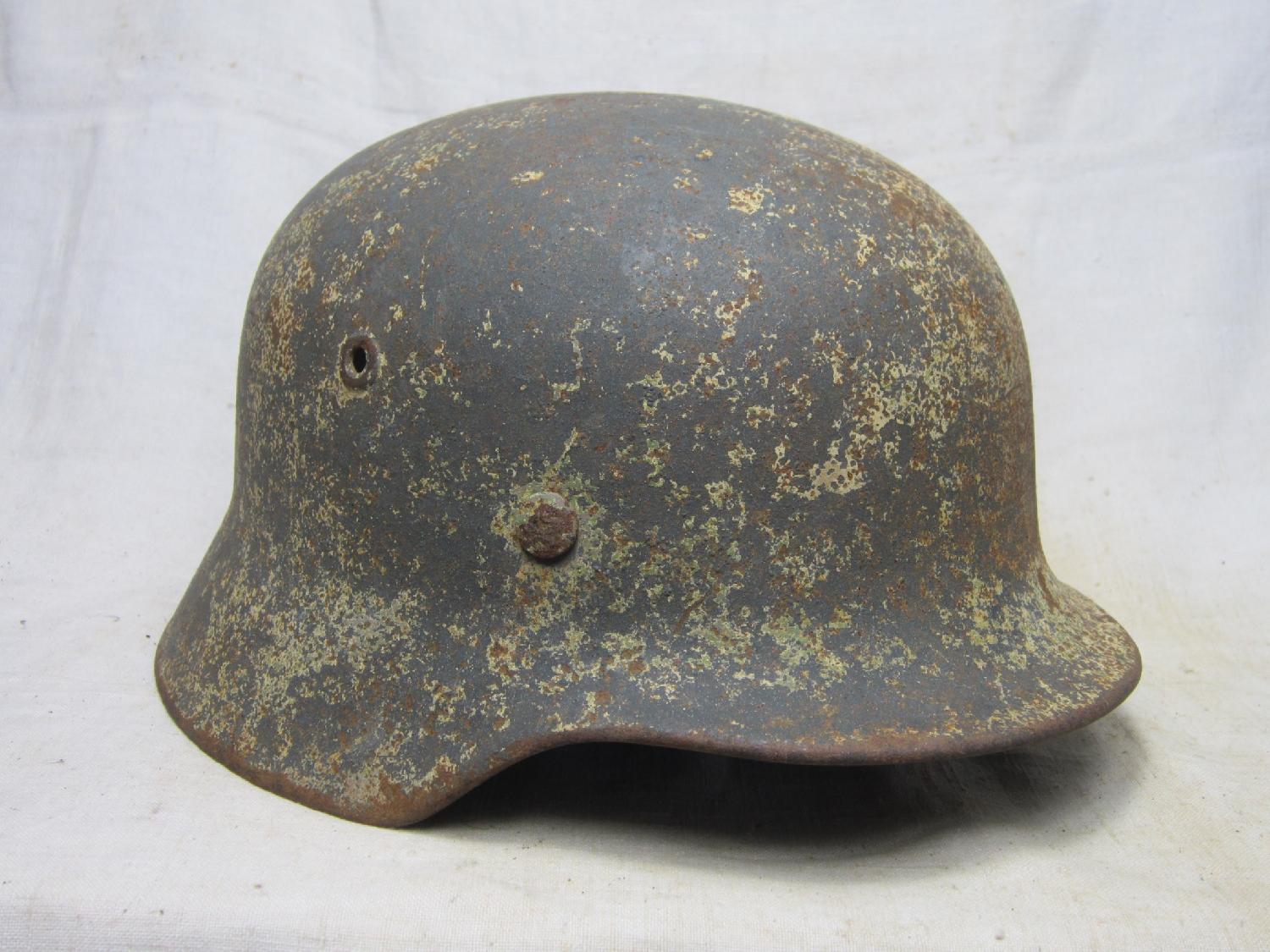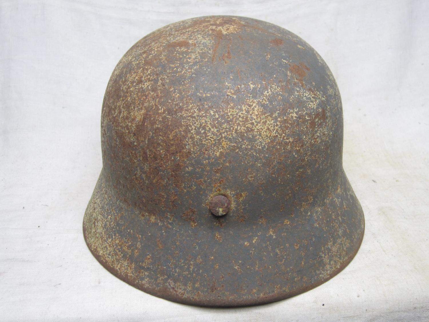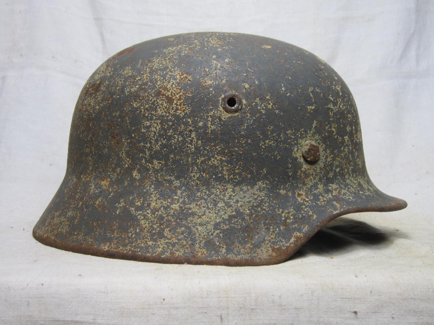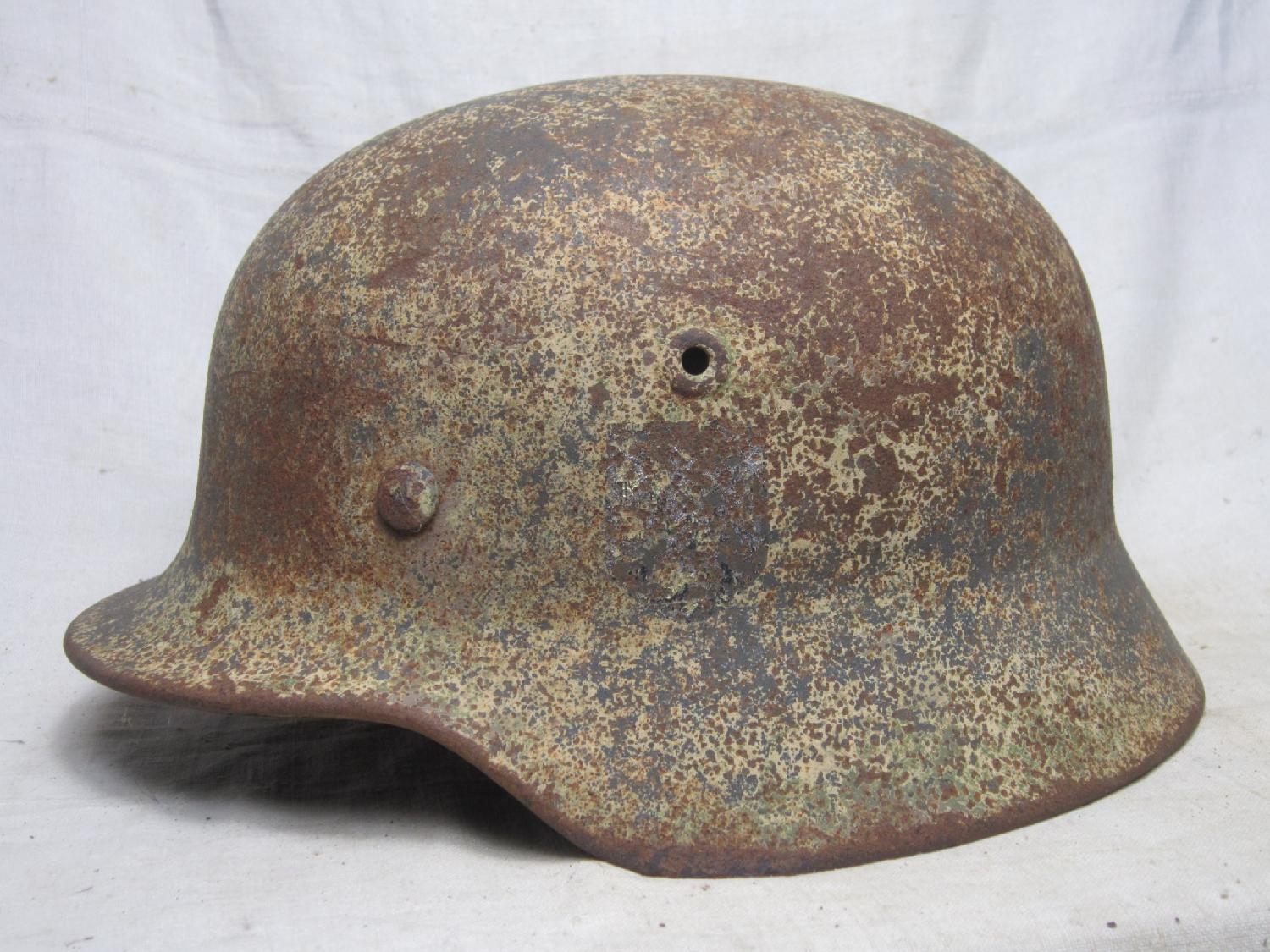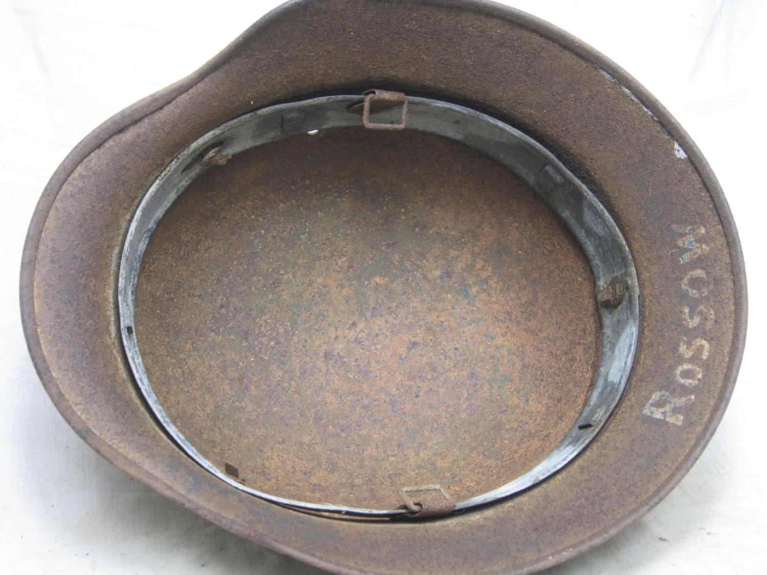 Casque m40 camouflé, bon reste de peinture et trace d'insigne, nom du propriétaire dans la nuquiere, taille de la coque 66.