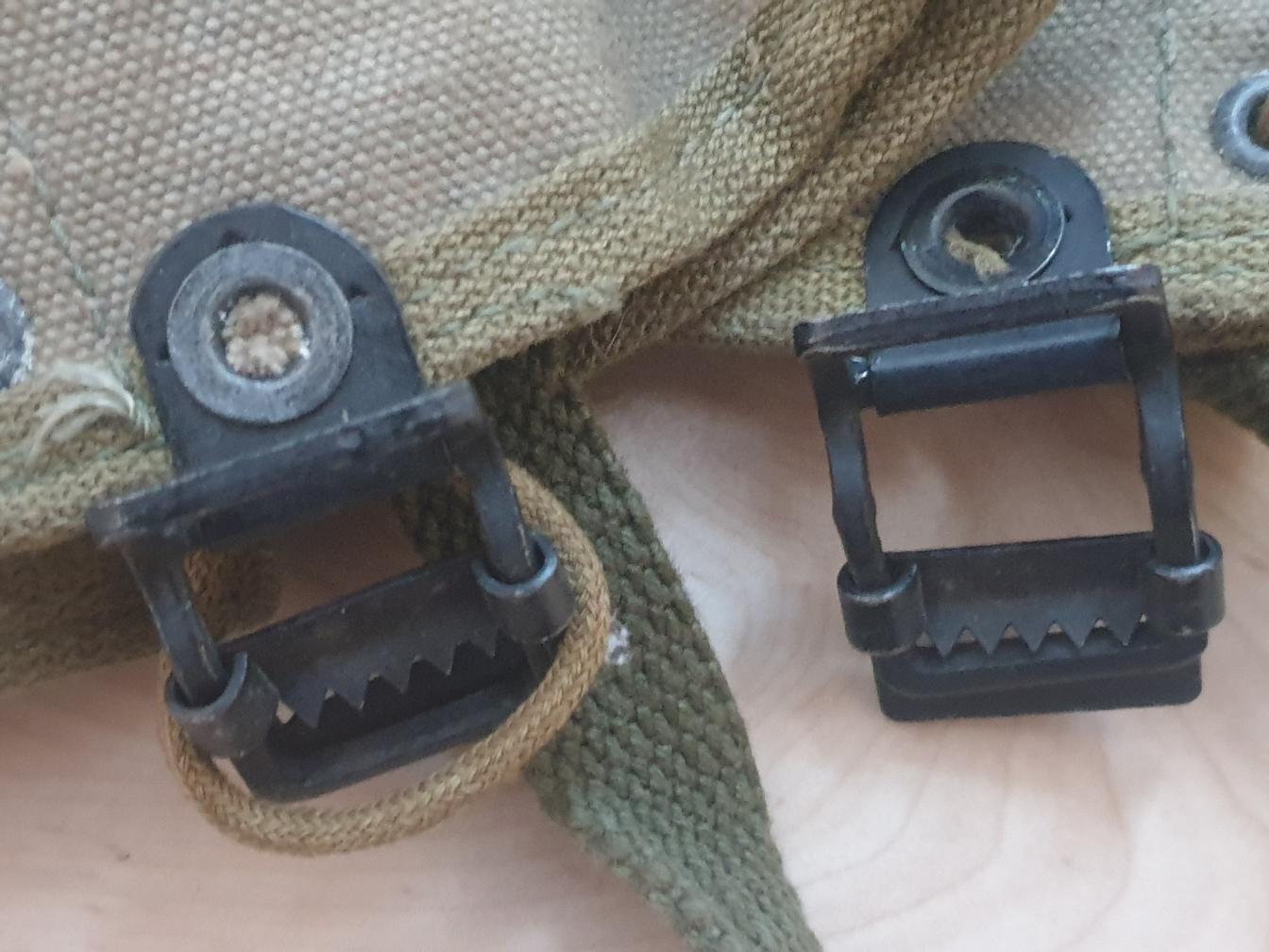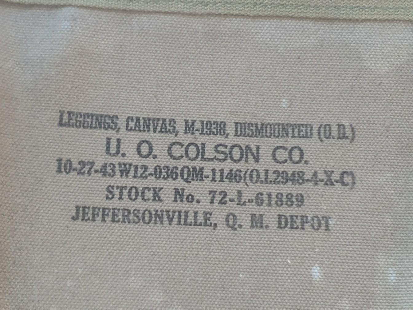 Leggings canvas M1938 (OD) avec ses lacets. Articles fabriqués à Jeffersonville le 27.10.1943, taille 2R. A noter que les sangles de maintien sont de couleur OD.