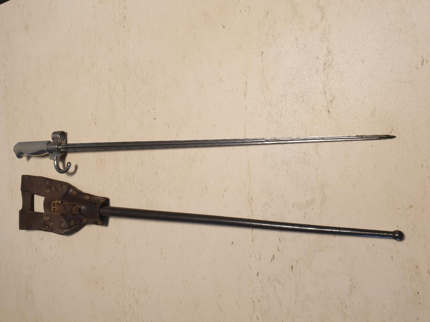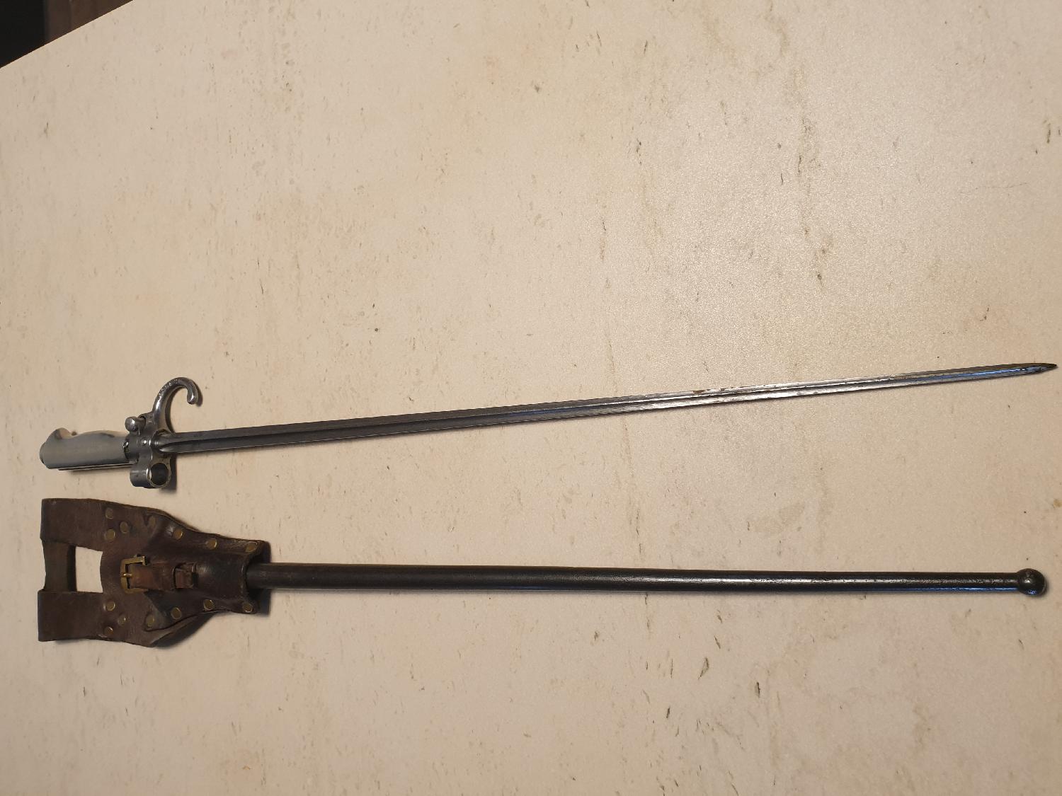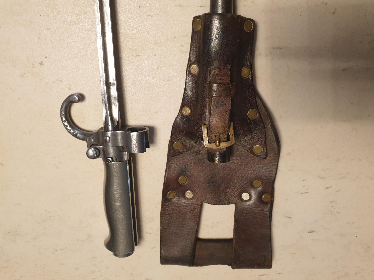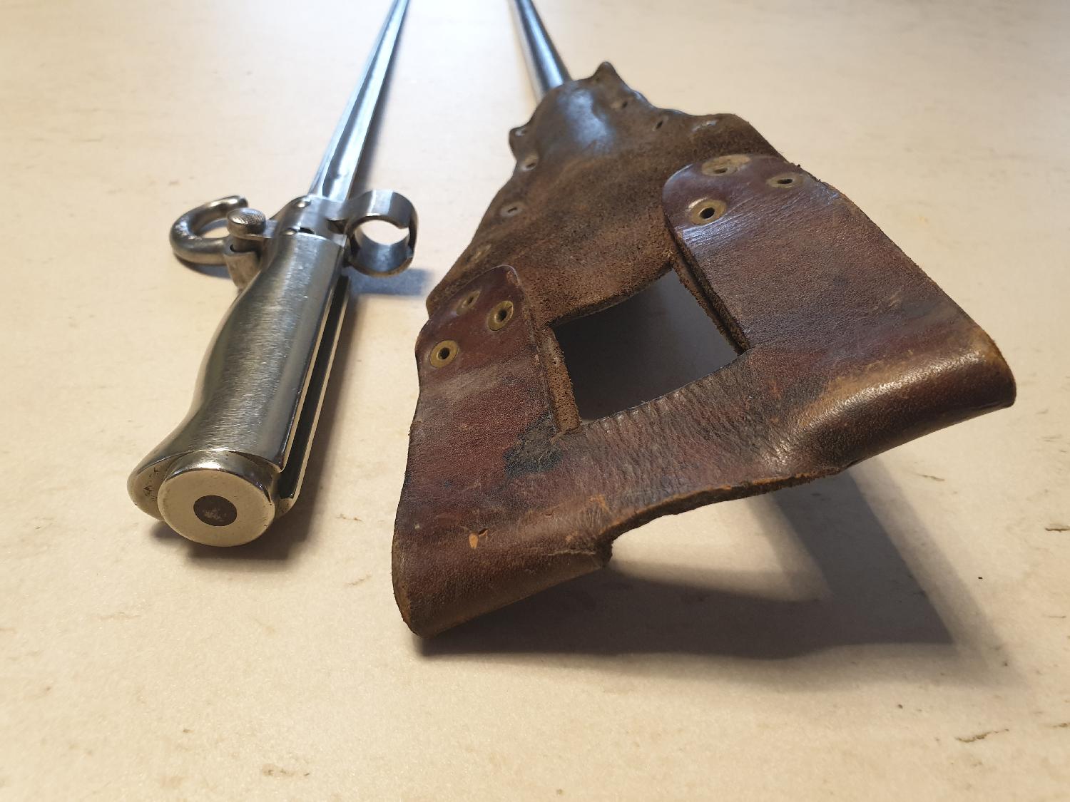 Baïonnette française de poilu en très bon état. Elle est montée sur un cuir couleur marron, montage avec des rivets.Prix en port compris, envoi en collisimo. Règlement par chèque ou virement. Pas de paypal.