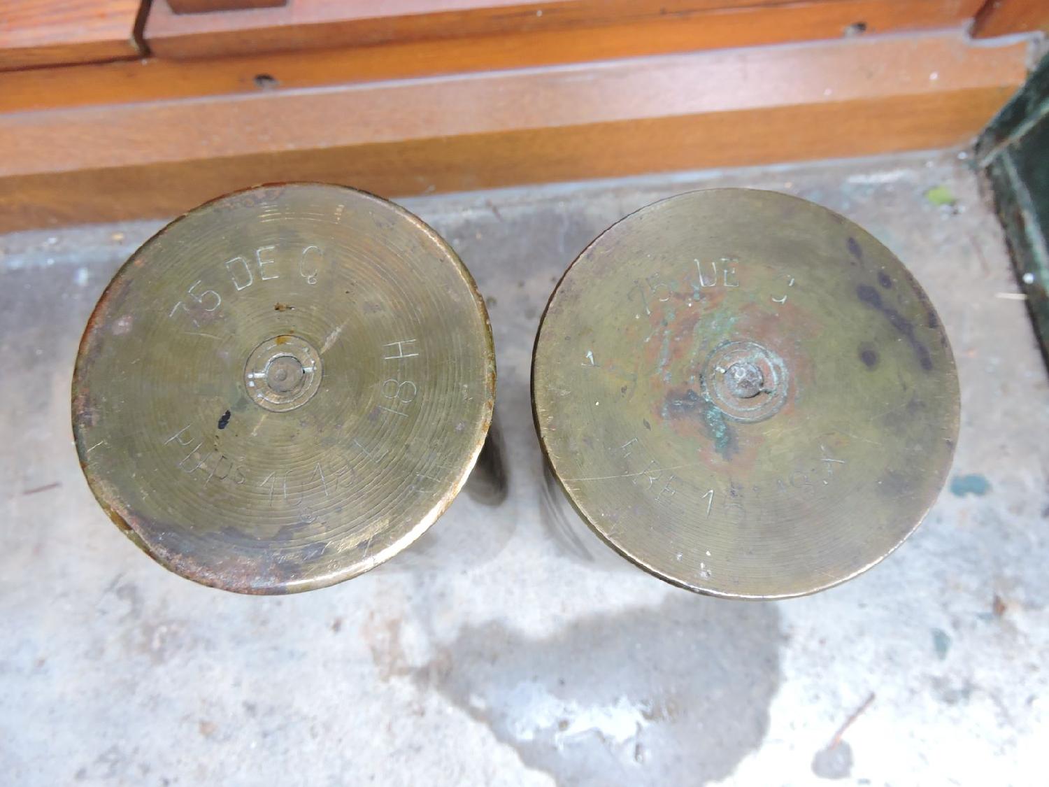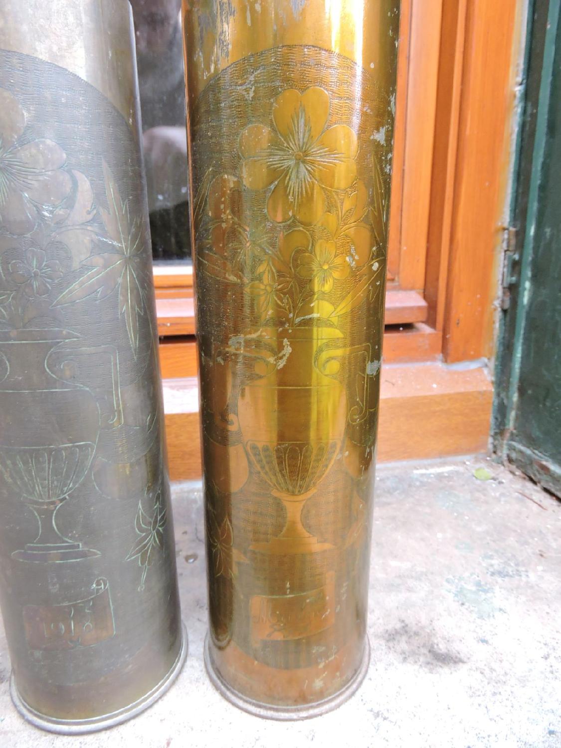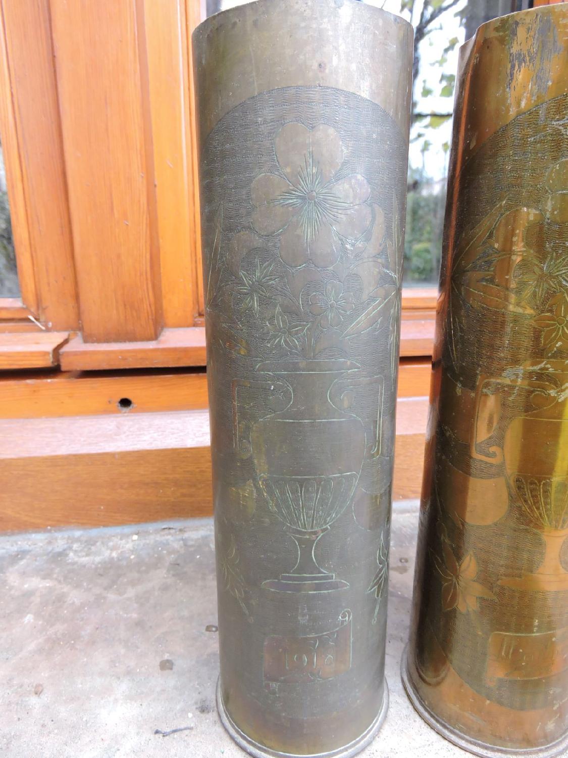 Paire d'obus de 75 gravé, l'un gravé "Marne" et l'autre "1917" dans un cartouche. La gravure représente un bouquet de fleurs dans un vase néo-classique.