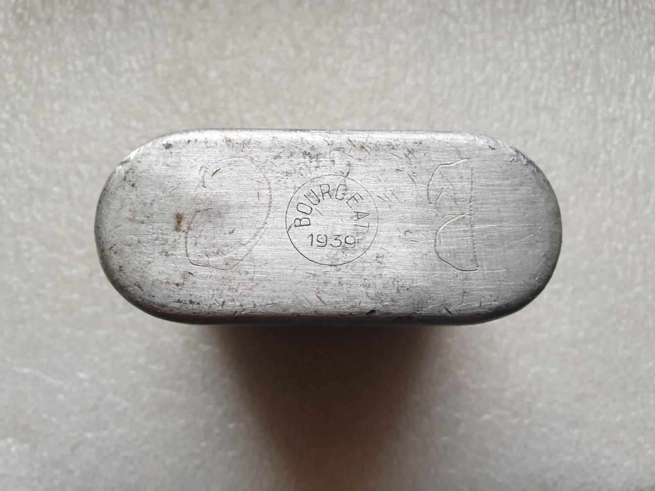 Quart modèle 1935 daté 1939, fabricant BOURGEAT, objet de terrain. A noter que son ancien propriétaire y a gravé ses initiales.