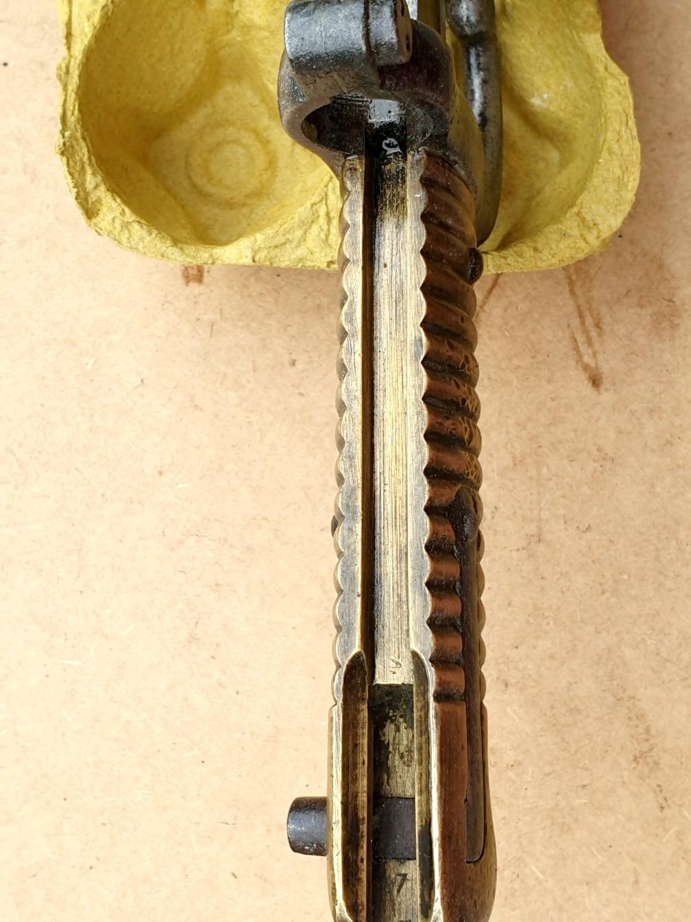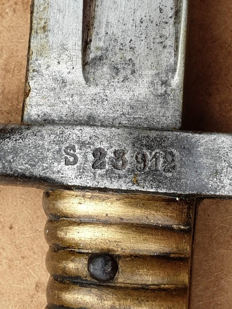 belle état, avec poinçon « S » puis marquage 7 et matricule S 23912, lame poinçonnée « S » tout comme le quillon. Poignée en laiton, bouton fonctionnel, lame yatagan et aucun marquage sur le dos de la lame. Longueur de la lame 57 cm / de la garde 11cm / longueur totale 71cm. Frais de port à prévoir.