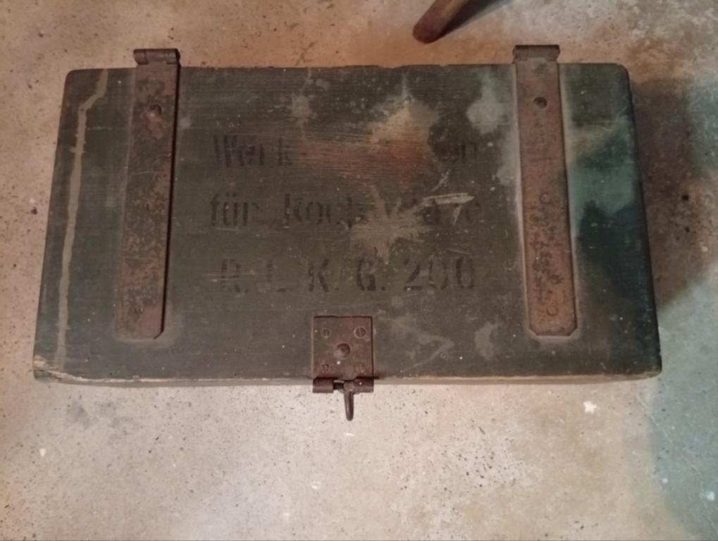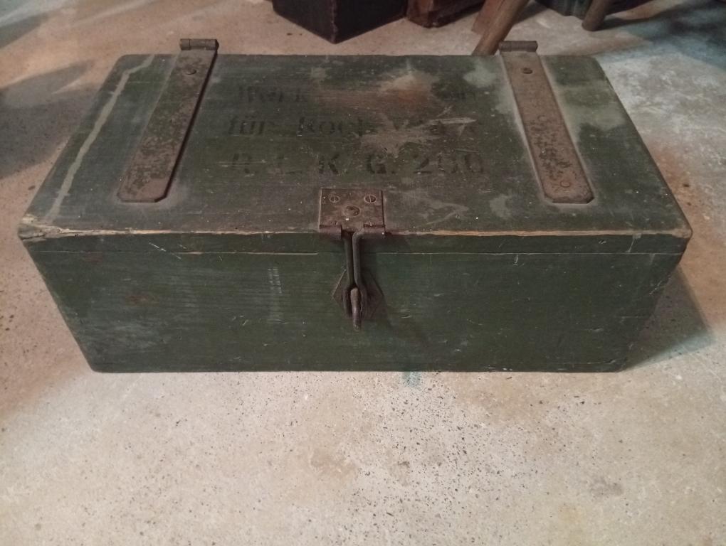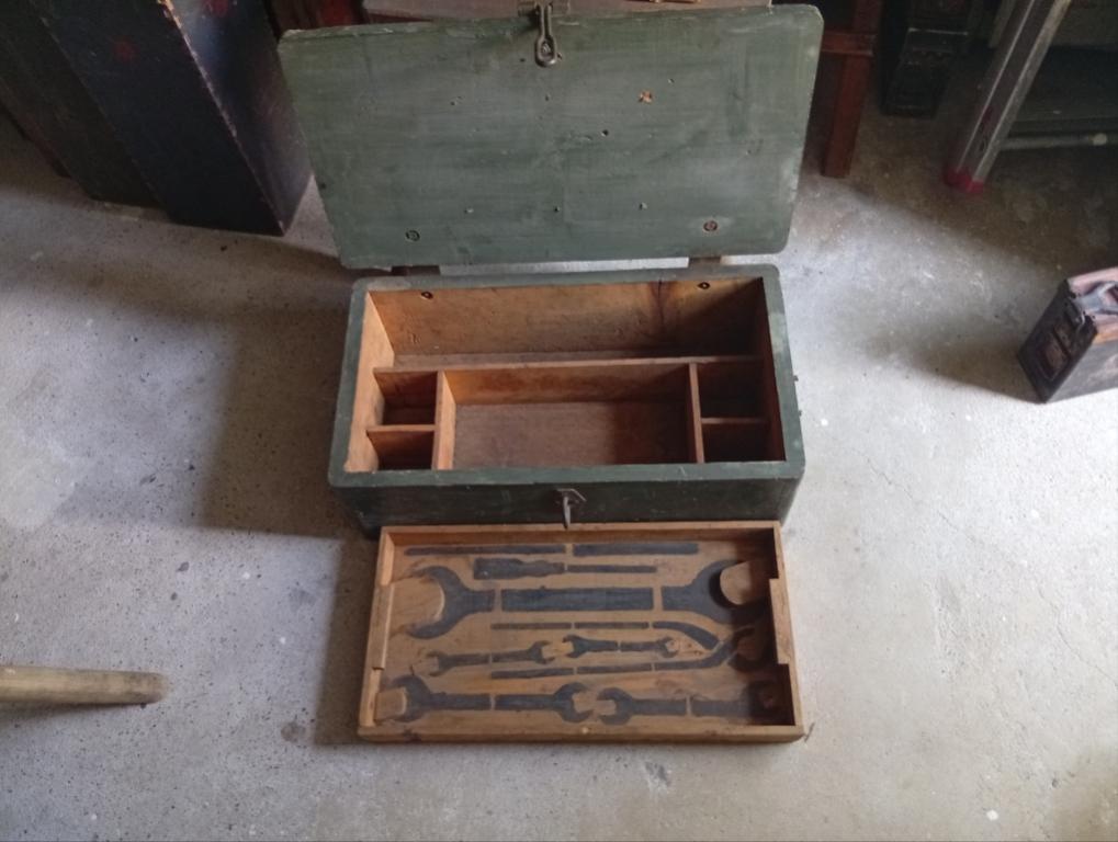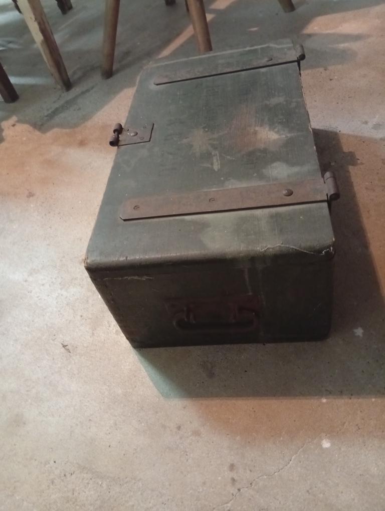 Bonjour je place à la vente cette peu courante caisse à outils que je suppose être destinée à contenir un set d'outils pour cuisine roulante (traduction aléatoire des marquages du couvercle).