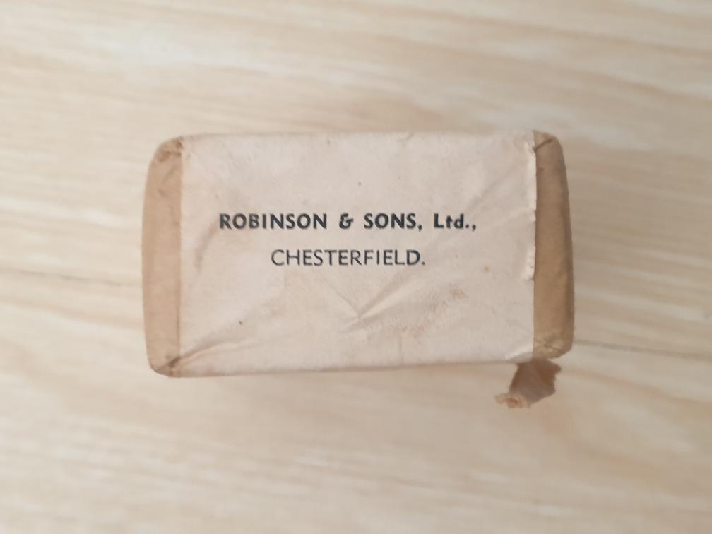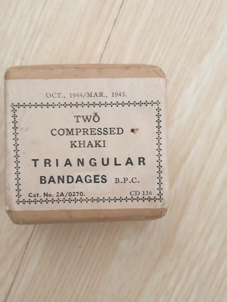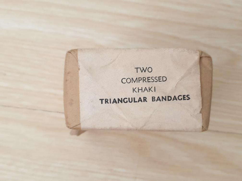 Paquet de deux compresses stérilisées kaki de l'armée anglaise. Fabricant Robinson & sons, Ltd à Chesterfield Co. Ltd. Olbury, datée octobre 1944.