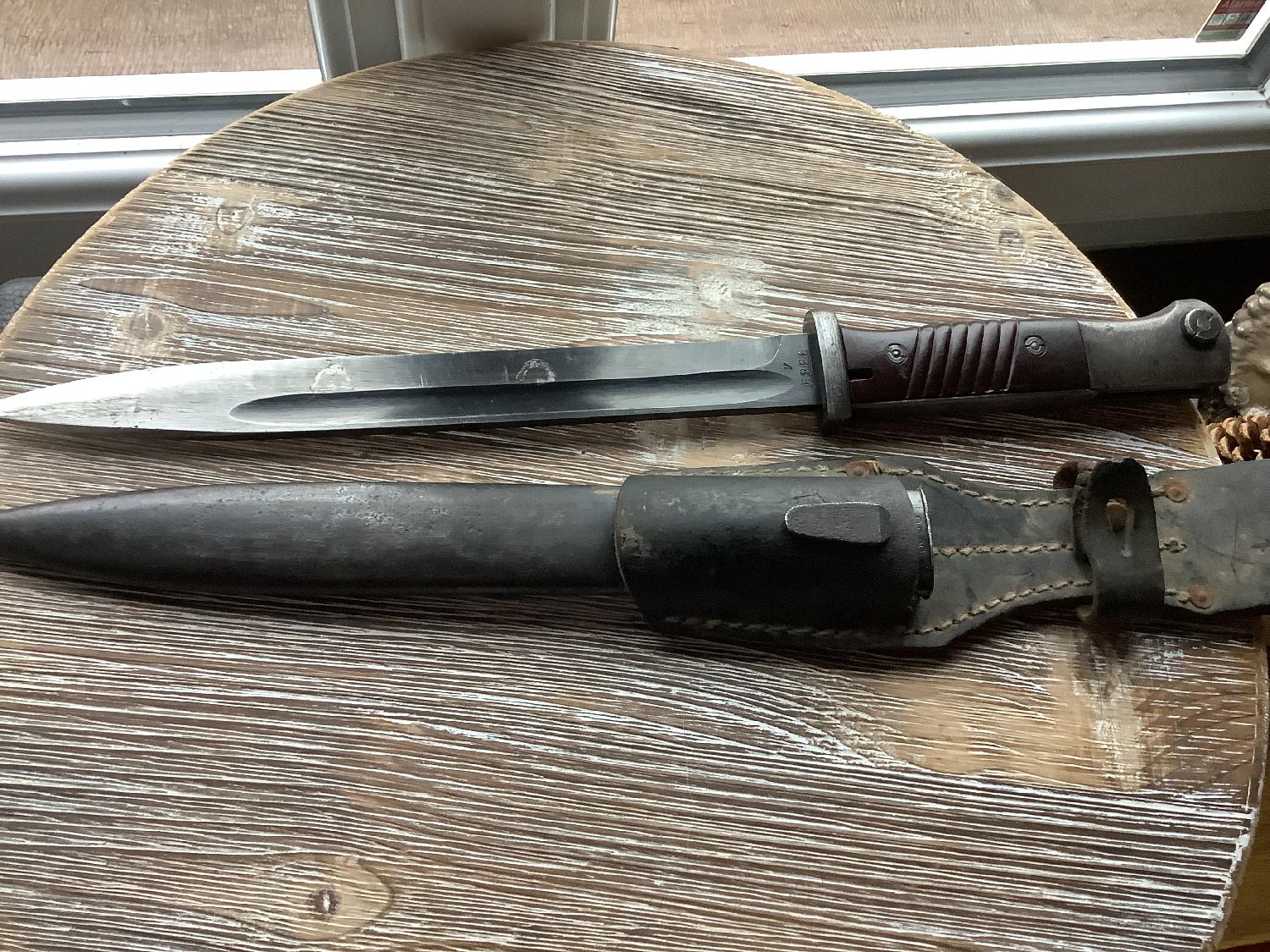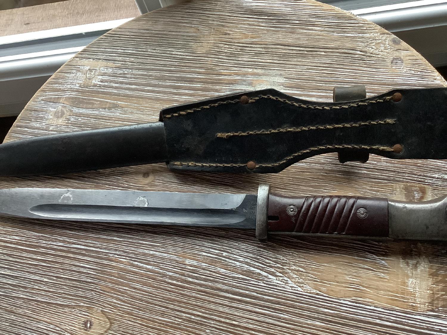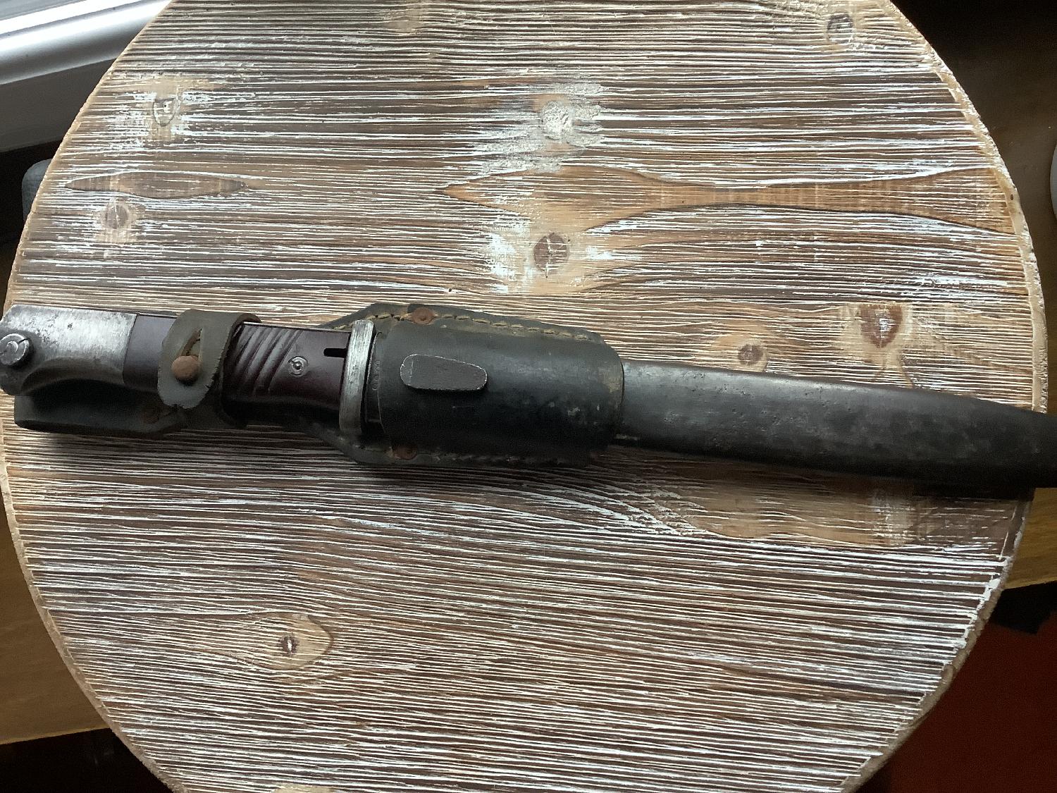 Vend belle Baionnette aux mêmes numéros ( 9889 ) belle lame sans choc avec gousset cuir coutures saines rivets présent présent ( mériterait un coup de graisse ) fabriquant : 43 ffc