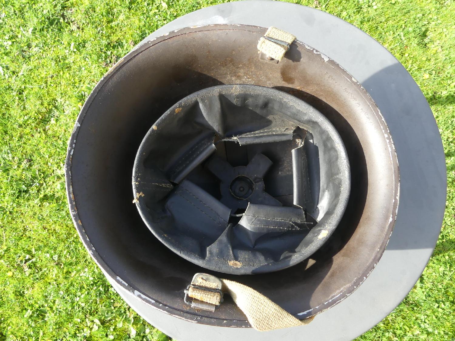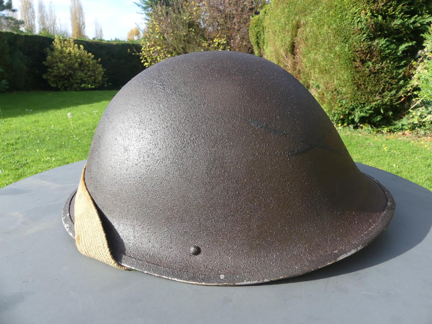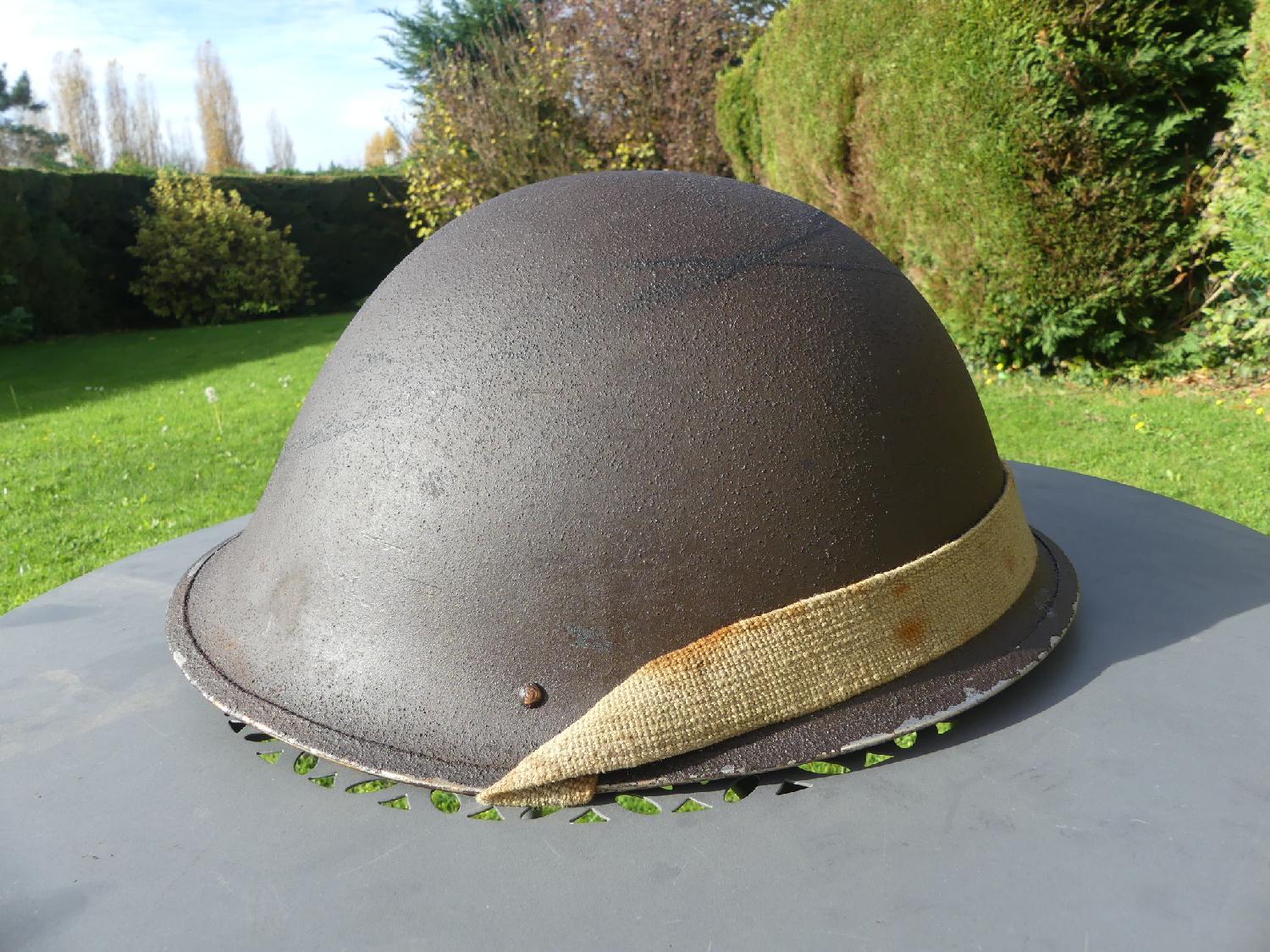 casque anglais/canadien dit "tortue" fin de guerre,bon etat sans trou bosses ou fissures.Peinture kaki brun d'epoque,jugulaire et interieur d'origine daté 1945 (difficile a prendre en photo) et taille 1/4