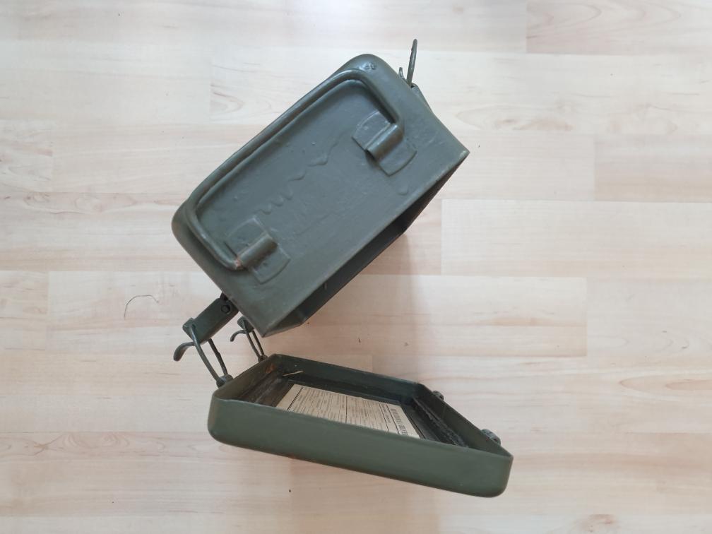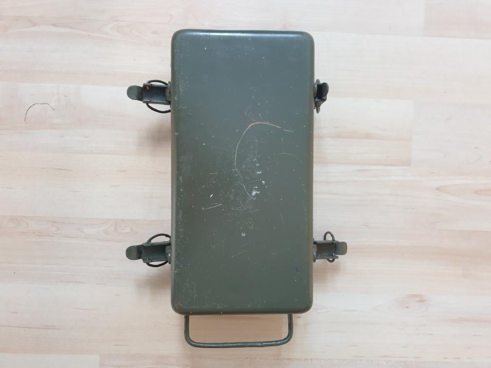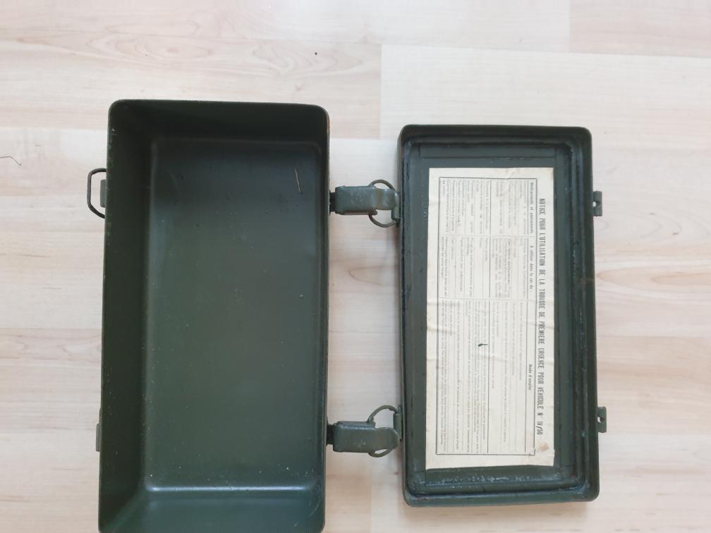 Boîte vide militaire de 1ere urgence pour véhicule Français. Bon état, longueur 24 cm / Largeur 13 cm / Hauteur 8 cm. Frais de port à prévoir.