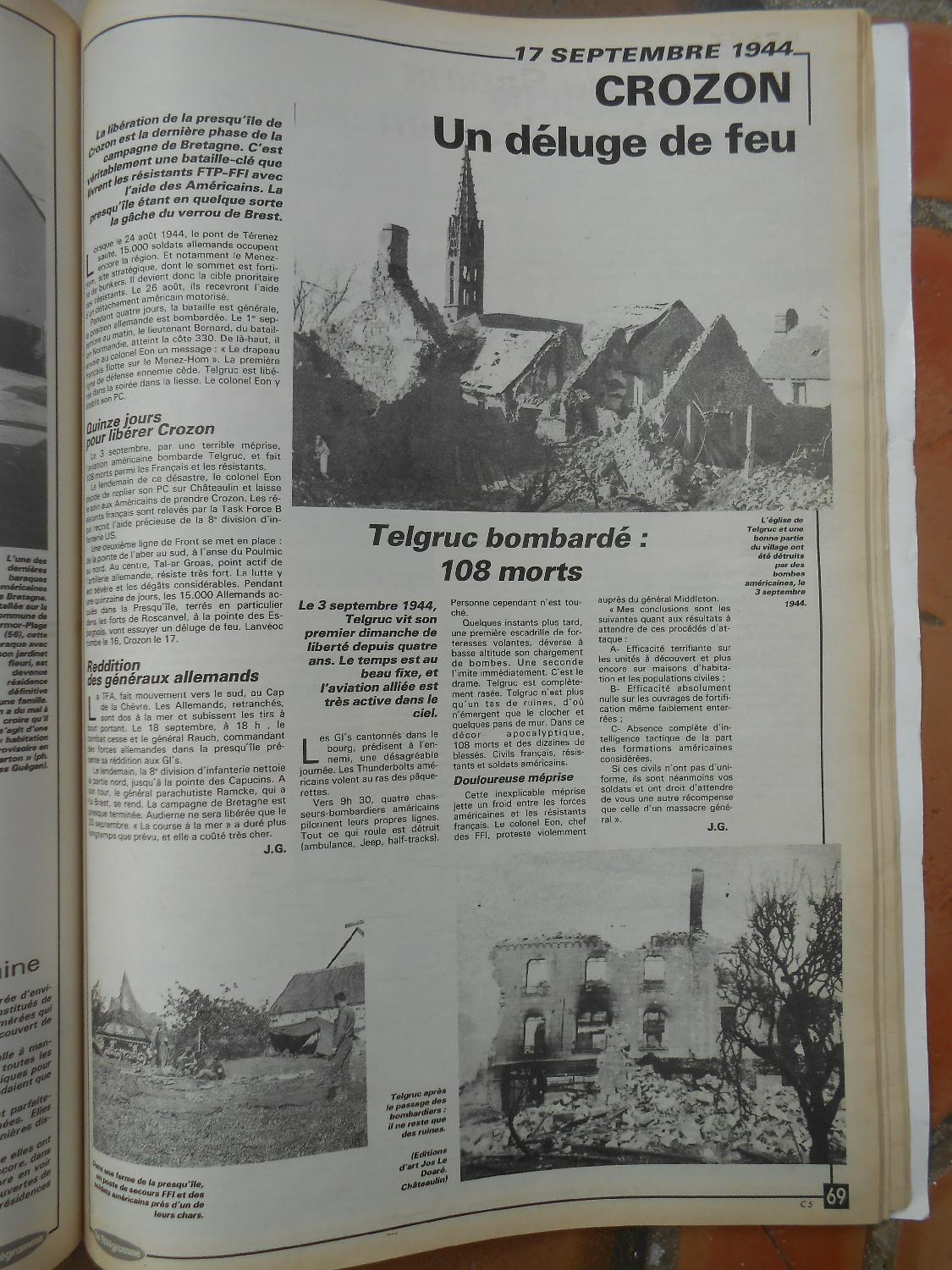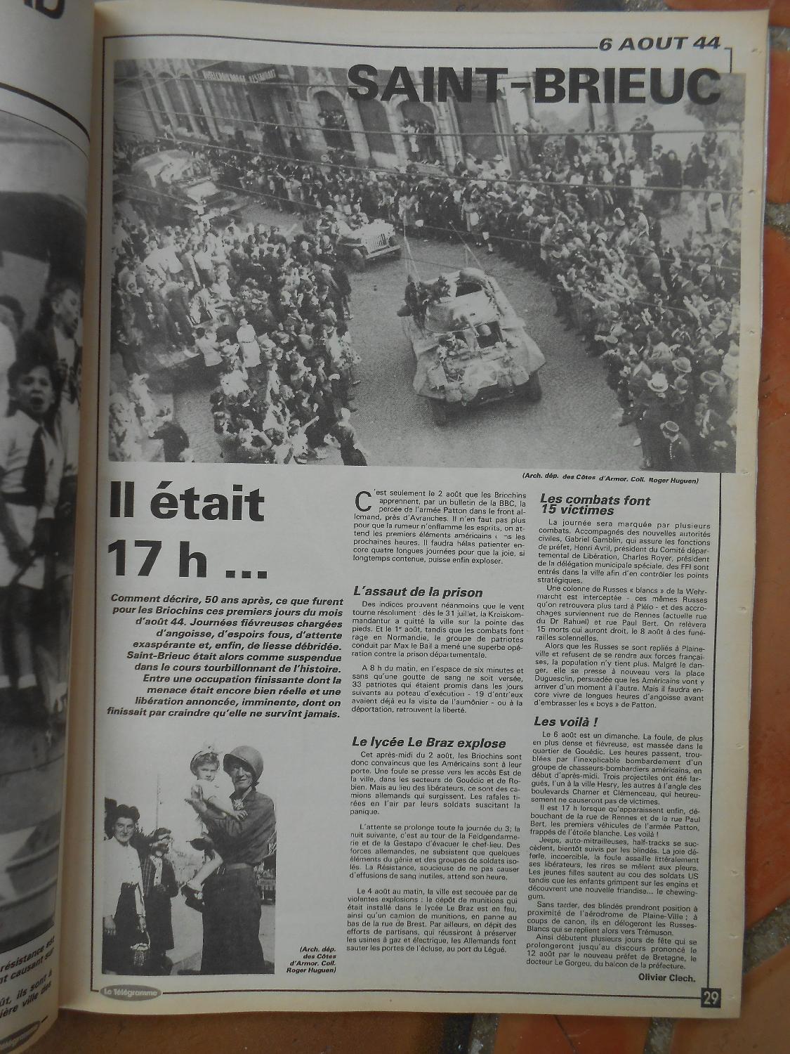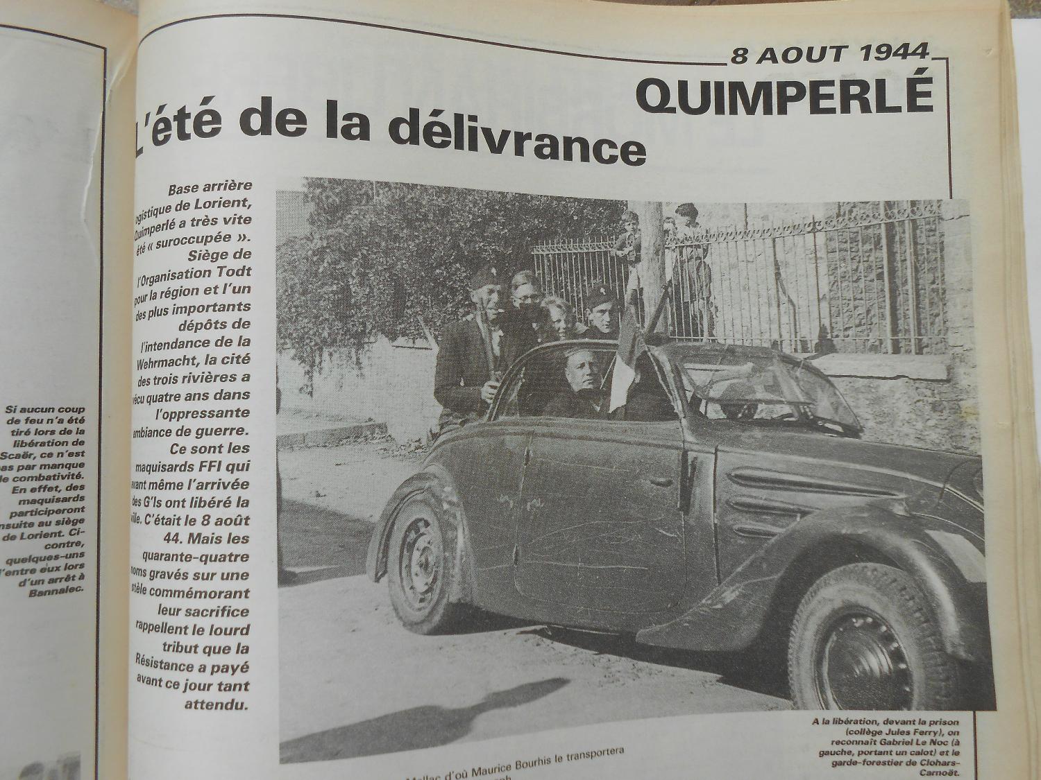 Revue de 124 pages éditée par l'hebdomadaire "Le télégramme" lors de la commémoration de la libération de la Bretagne en 1944. Cette revue fait état de diverses histoires relatives à la libération des villes et villages comme Brest, St-Brieuc, Lorient, Quimper, St-Marcel, Scrignac...