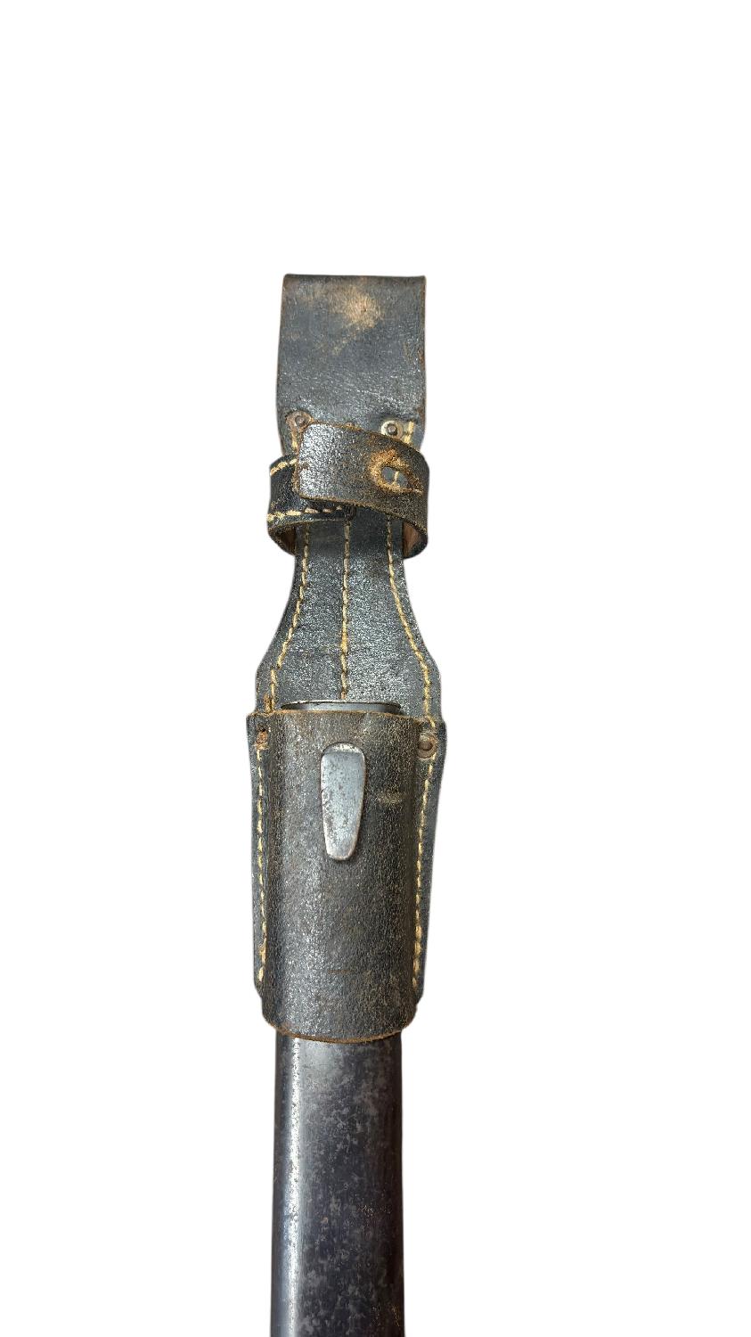 Son porte-baïonnette en cuir en bon état, avec coutures solides et fermeture encore fonctionnelle.