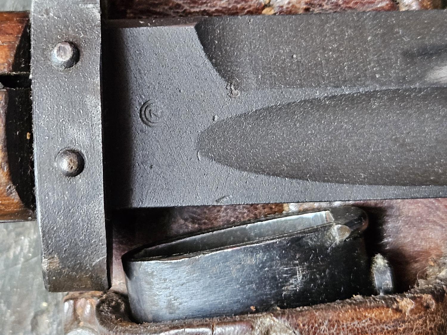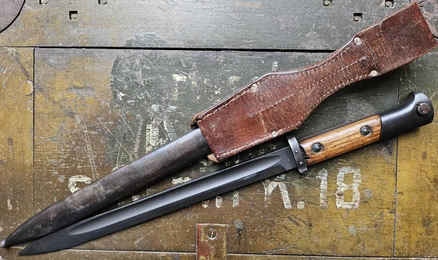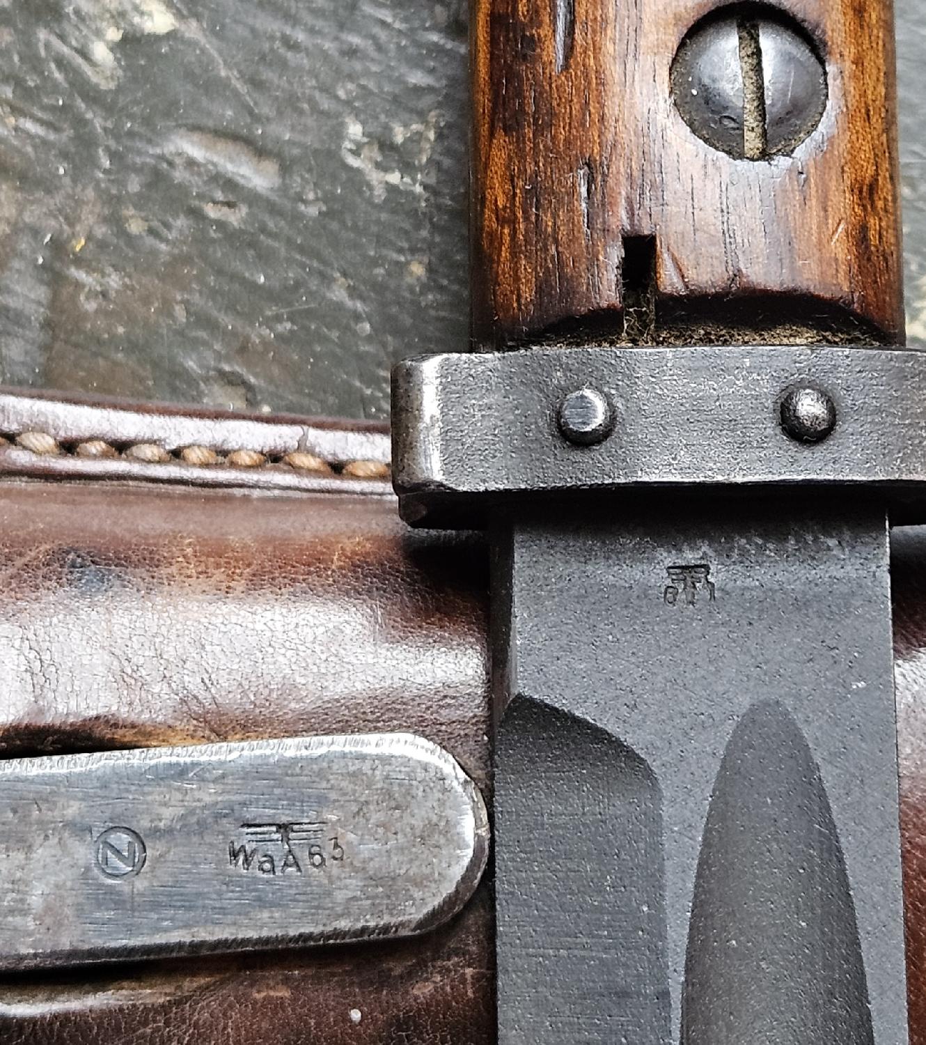Belle baïo VZ 24 fabriquée pendant l'occupation allemande. WaA607 sur la lame pour l'usine de Byrstica. WaA 607 utilisé pendant une partie de l'année 1940. Fourreau lui correspondant avec WaA63 fabrication usine de Brno. Ensemble d'origine. La trace du bouton de chape du fourreau est bien visible sur le porte fourreau ce qui implique que l'ensemble a été porté ensemble.