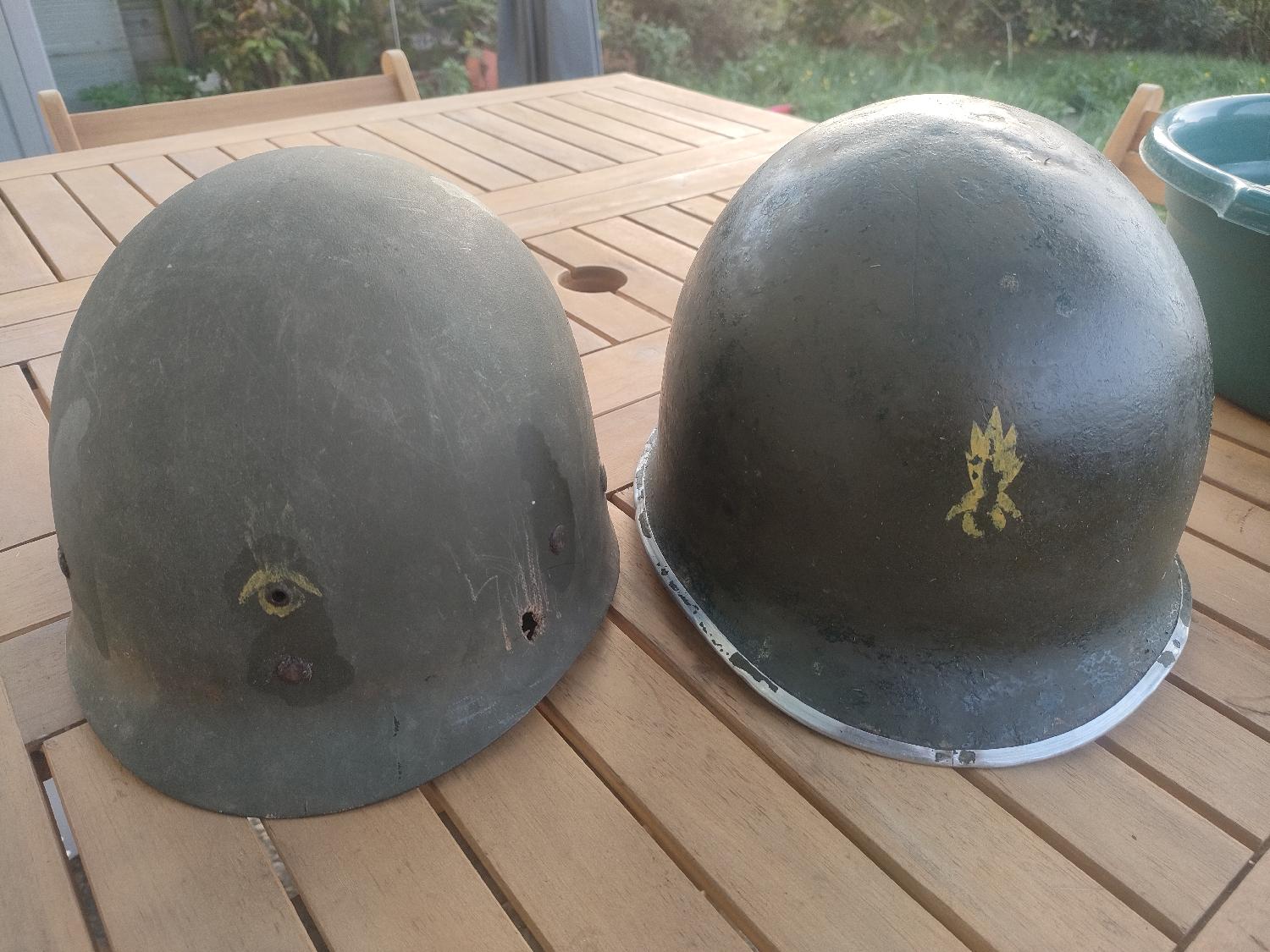 Casque us réutilisé par l armée française grenade a 7 flammes sur le lourd et le léger drapeau français sur le lourd casque a finir de nettoyer belle pièce peu courant