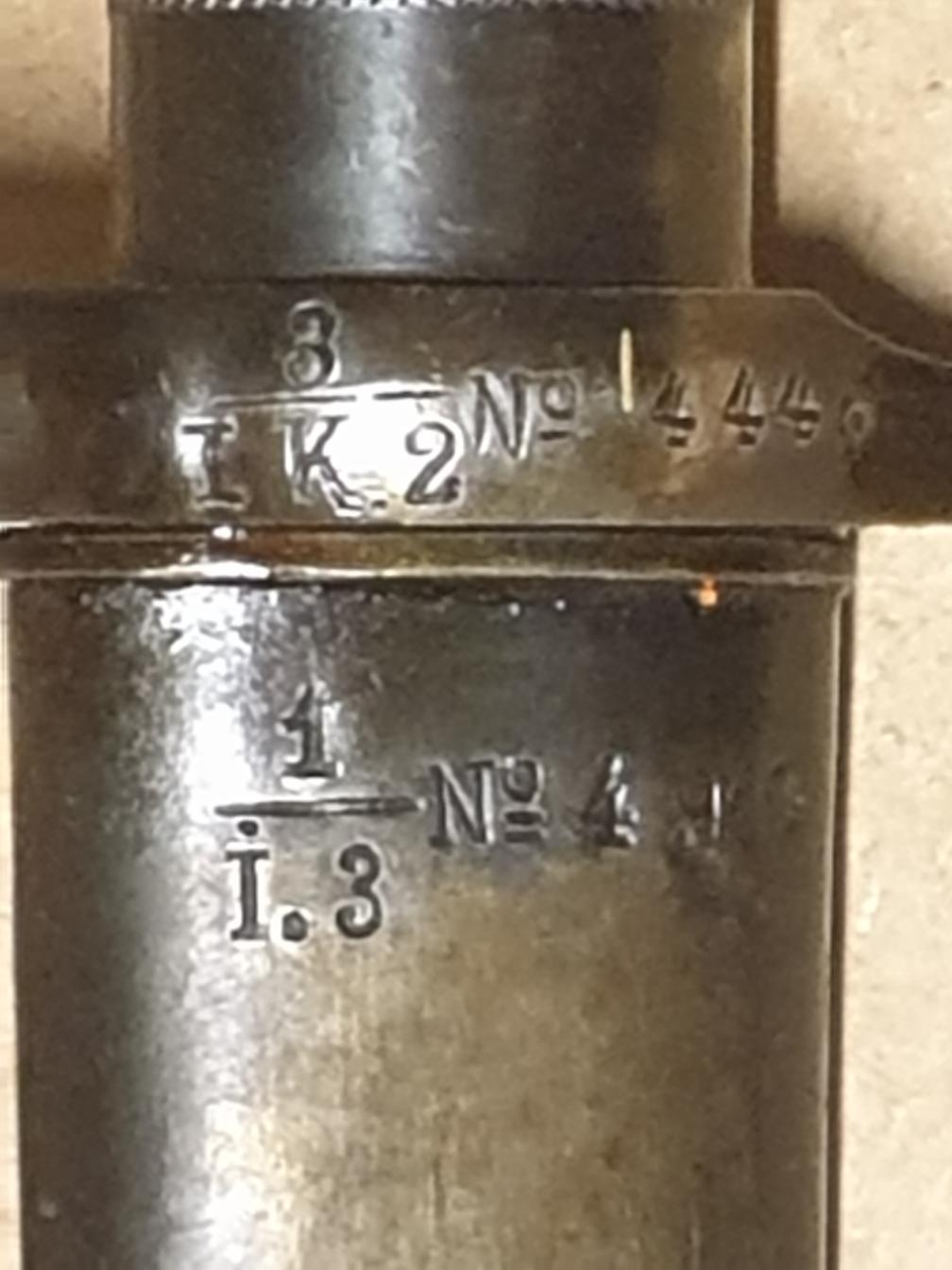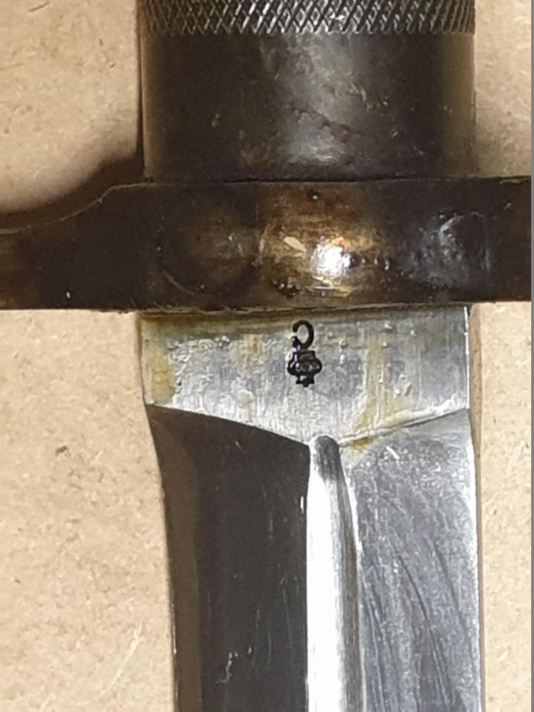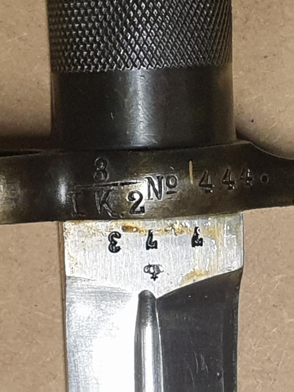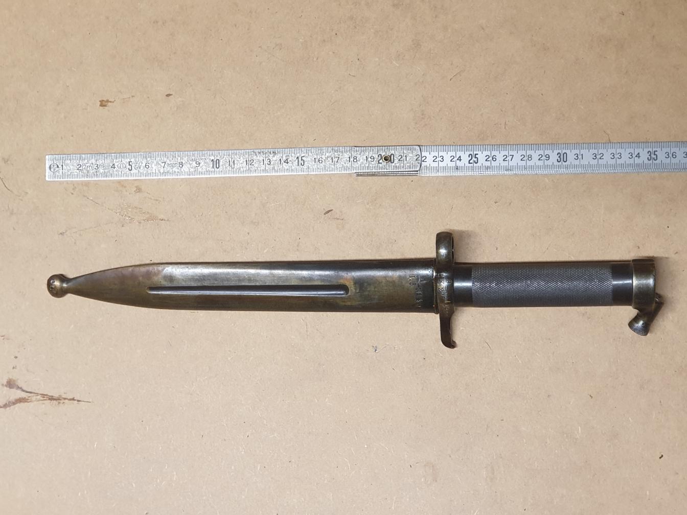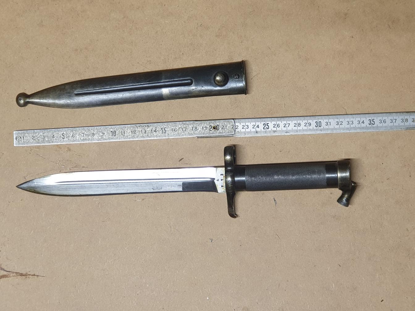 Baïonnette Suédoise M 36. Cet article a été produit à 665 000 exemplaires et a été utilisé avec le Mauser M-1896 (produit de 1896 à 1930), avec la carabine M-1938 (produite de 1938 à 1944), et pour finir avec l’Ag M-42 (produit à partir de 1942).