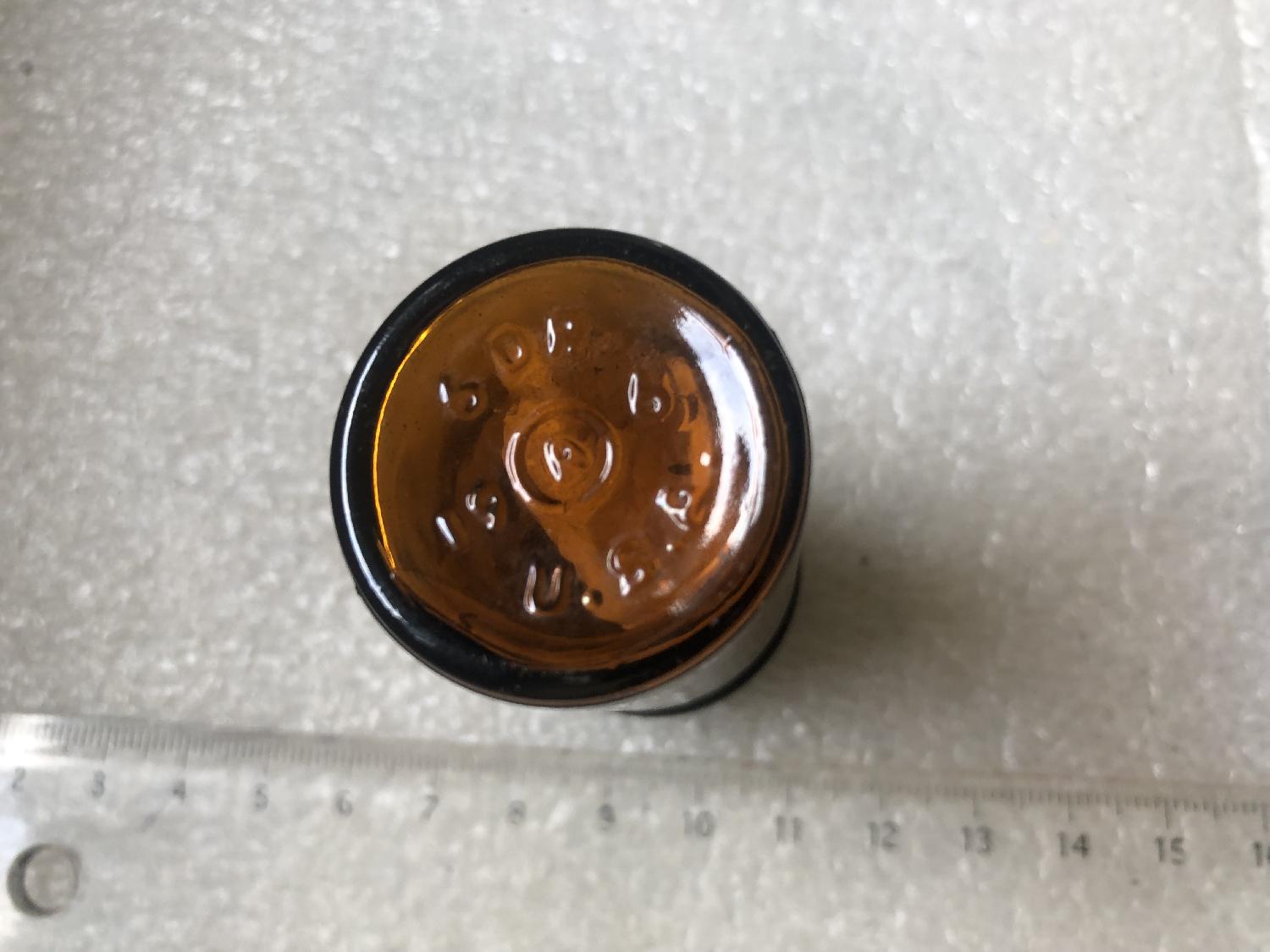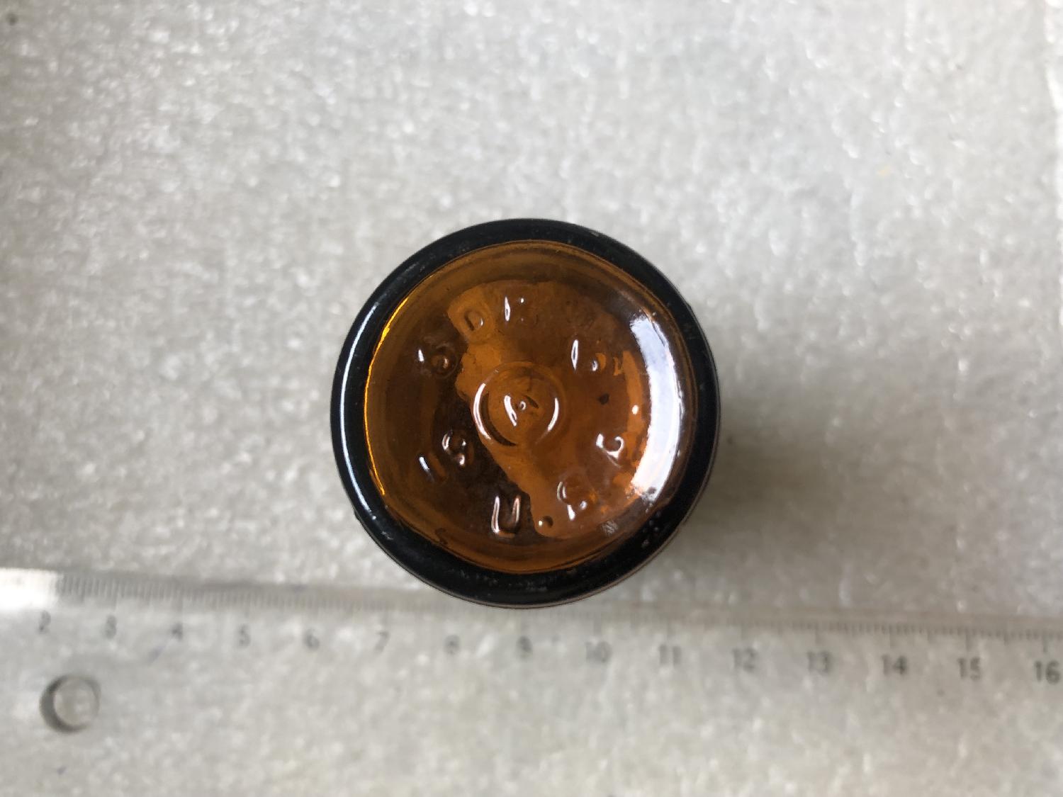 Flacon médical rond avec son bouchon d'origine, pièce de terrain. Restant de matière à l'intérieur. Dimensions 6,2 x 2,9 cm.