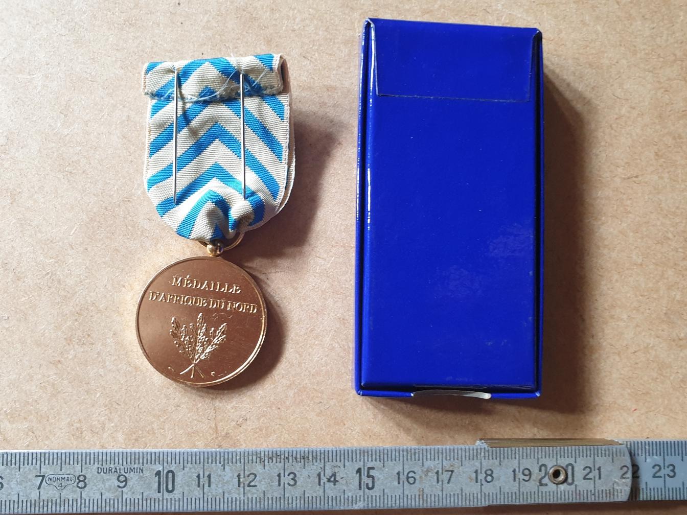 La médaille d'Afrique du Nord est décernée aux personnes civils ou militaires ayant servis pendant au minimum 90 jours dans une unité française ou détachés dans une armée étrangère lors de conflit tels que la guerre d'Algérie. Description : La médaille d'Afrique du Nord (ex TRN) est une médaille ronde simple. Le ruban de cette médaille est de couleur beige rayé par des chevrons bleu indigo. L'avers : la Croix du Sud est représentée avec autour d'elle l'inscription "République Française", le revers : l'inscription "Médaille d'Afrique du Nord" est gravée. En dessous de celle-ci trois branches de chenet croisées forme un bouquet.