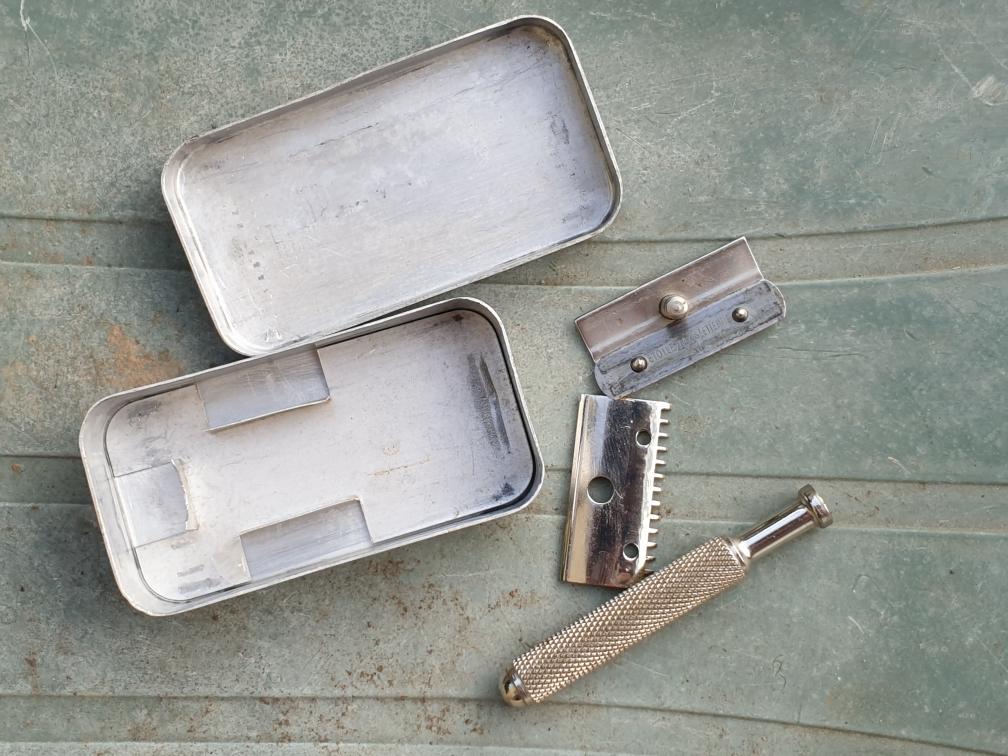 Rasoir de sûreté Le Barbu de chez Manufrance en bon état, idéal pour compléter vitrine du soldat de 1940. Dimensions 8,5x4,5cm