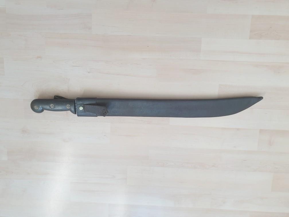 Machette Martindale Birmingham anglaise complète avec son fourreau cuir. La lame est marqué et l'on peut lire le nom du fabricant : Birmingham made in England + gravure d'un crocodile et n° de série, 12. Longueur de la lame 49,5 cm. Fourreau cuir marqué également.