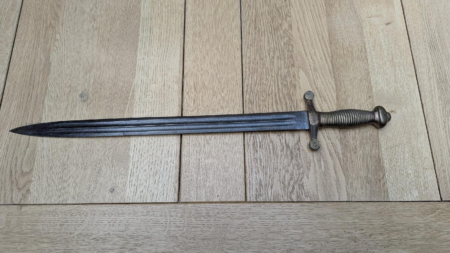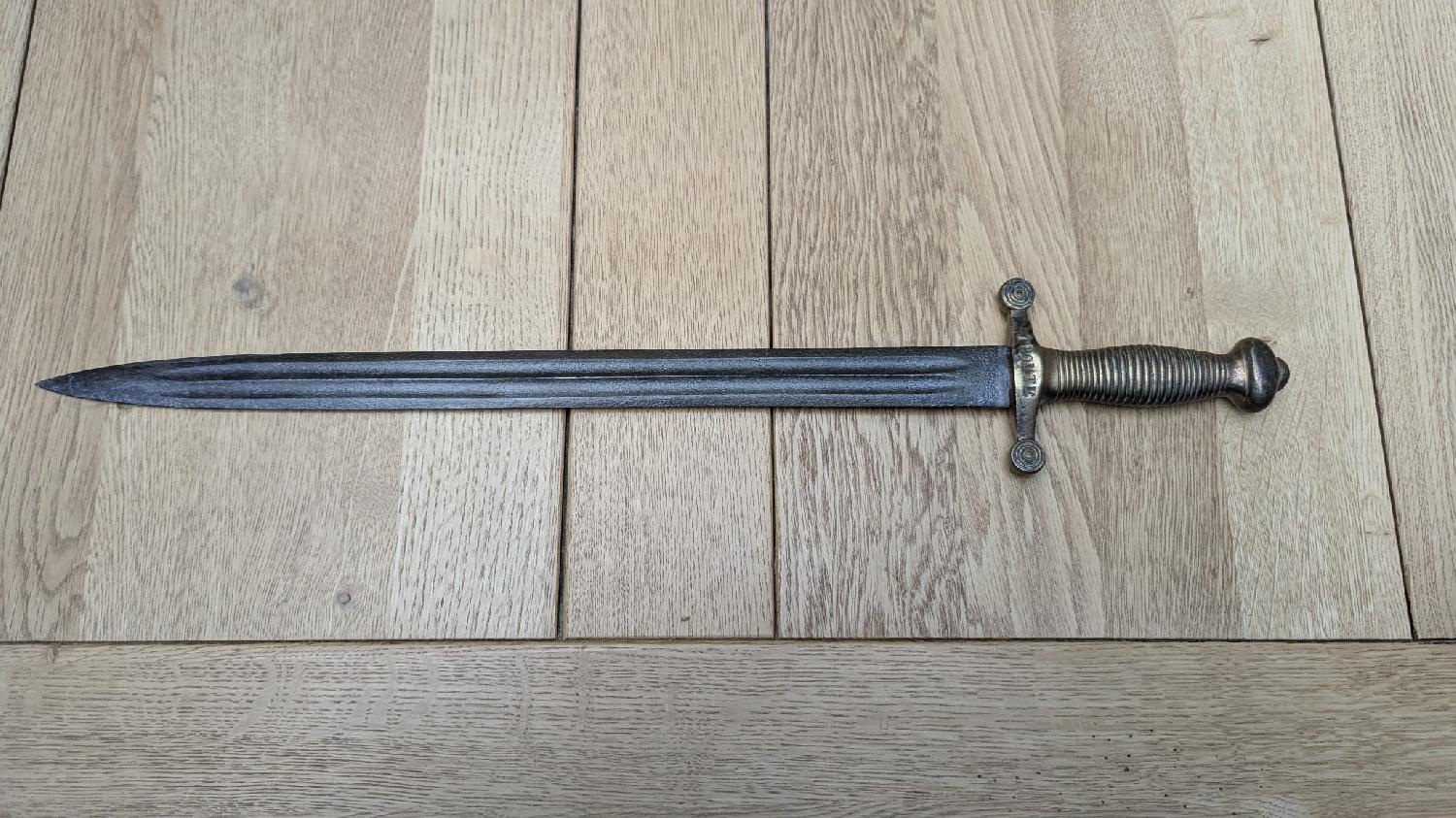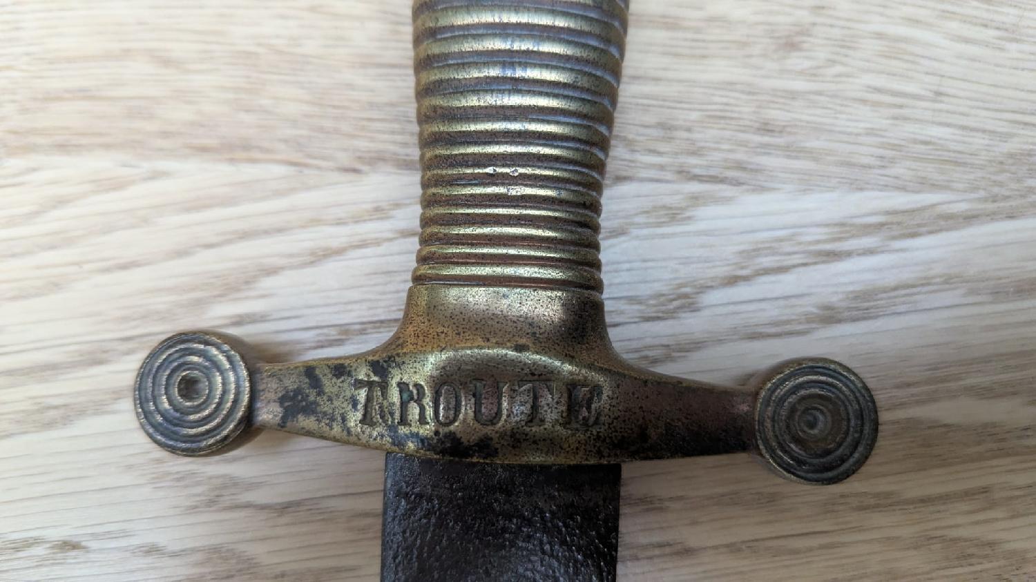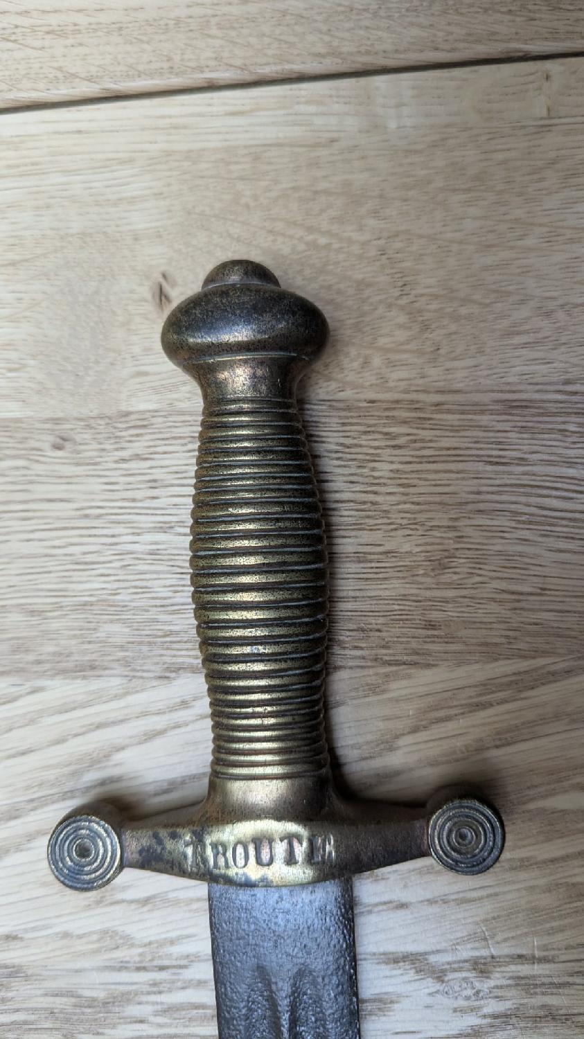 Je vends ce glaive apparemment modèle 1831, sans fourreau, un nom estampé sur le lame "TROUTE" montage solide et pas de jeu.