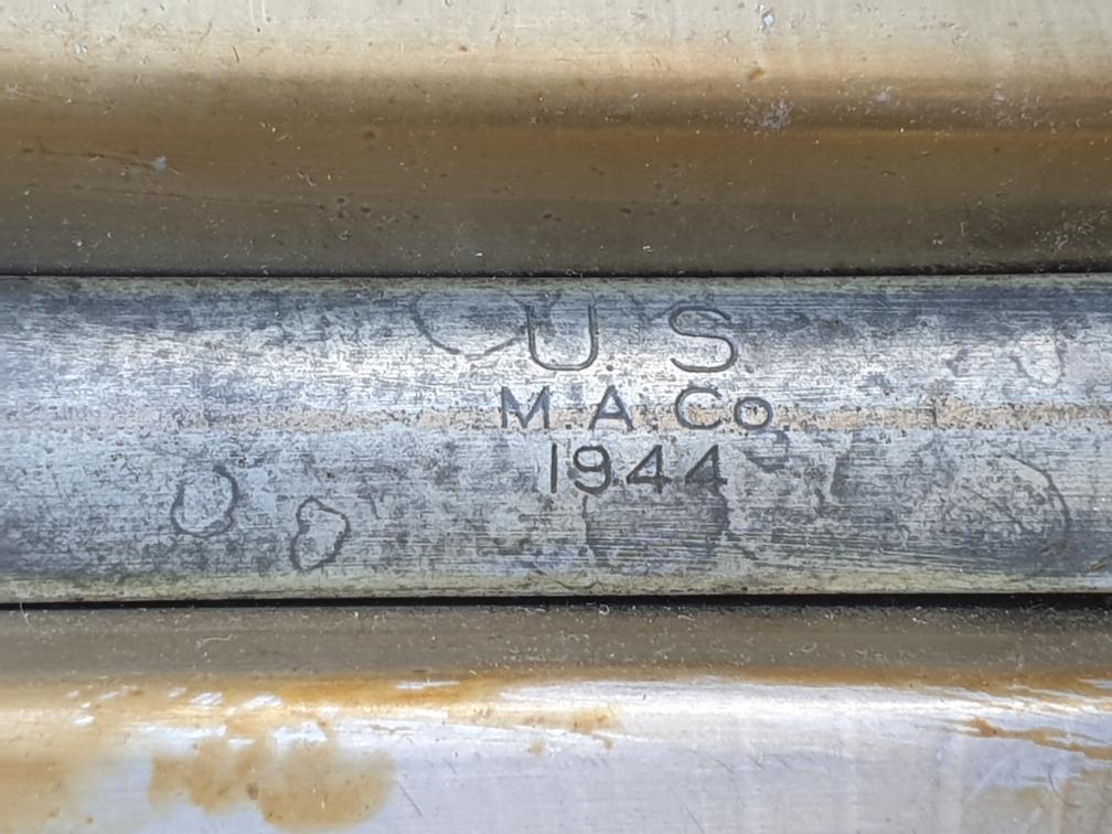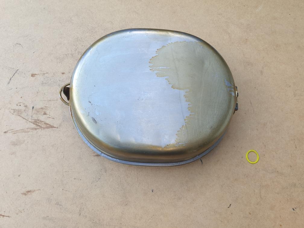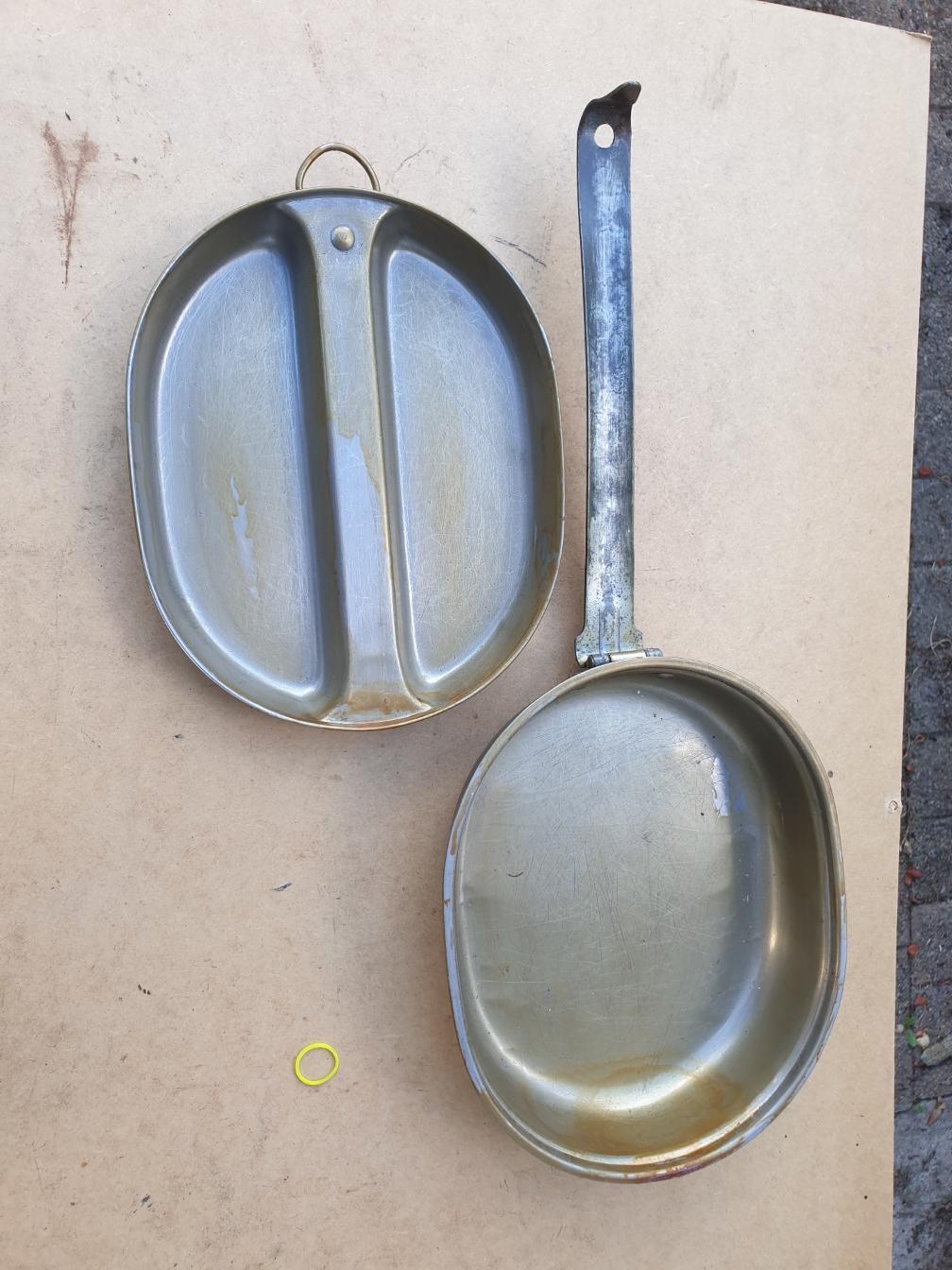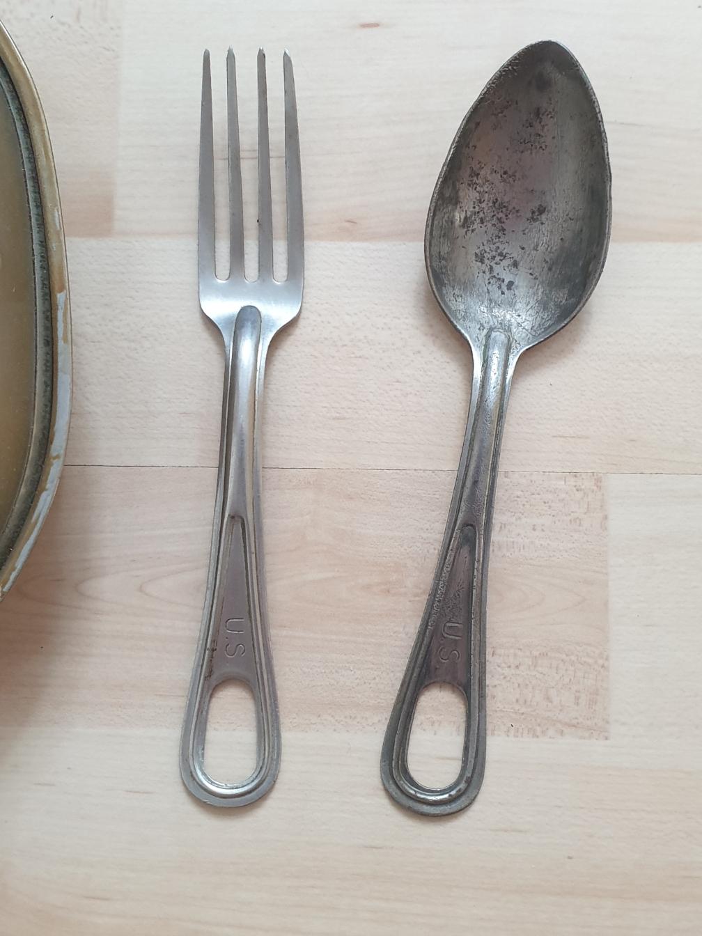 Gamelle datée 1944 du soldat américain avec fourchette et cuillère.