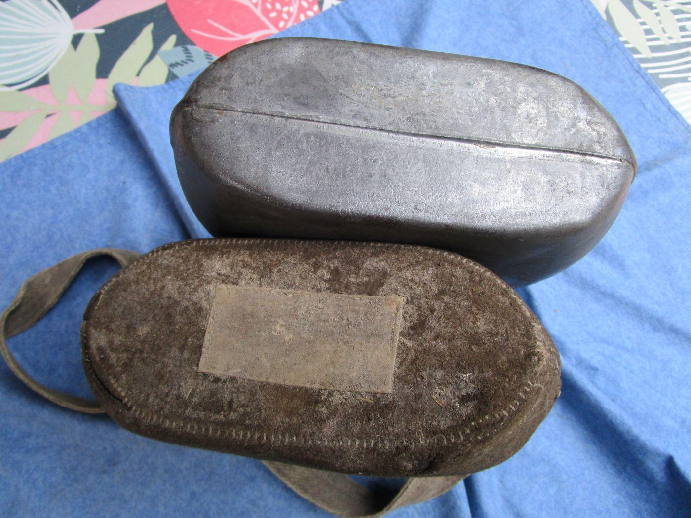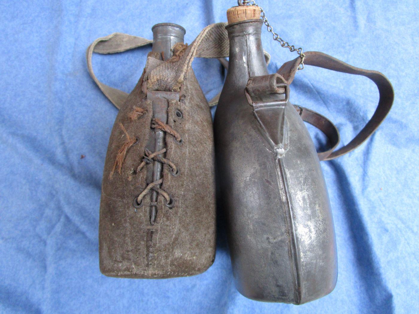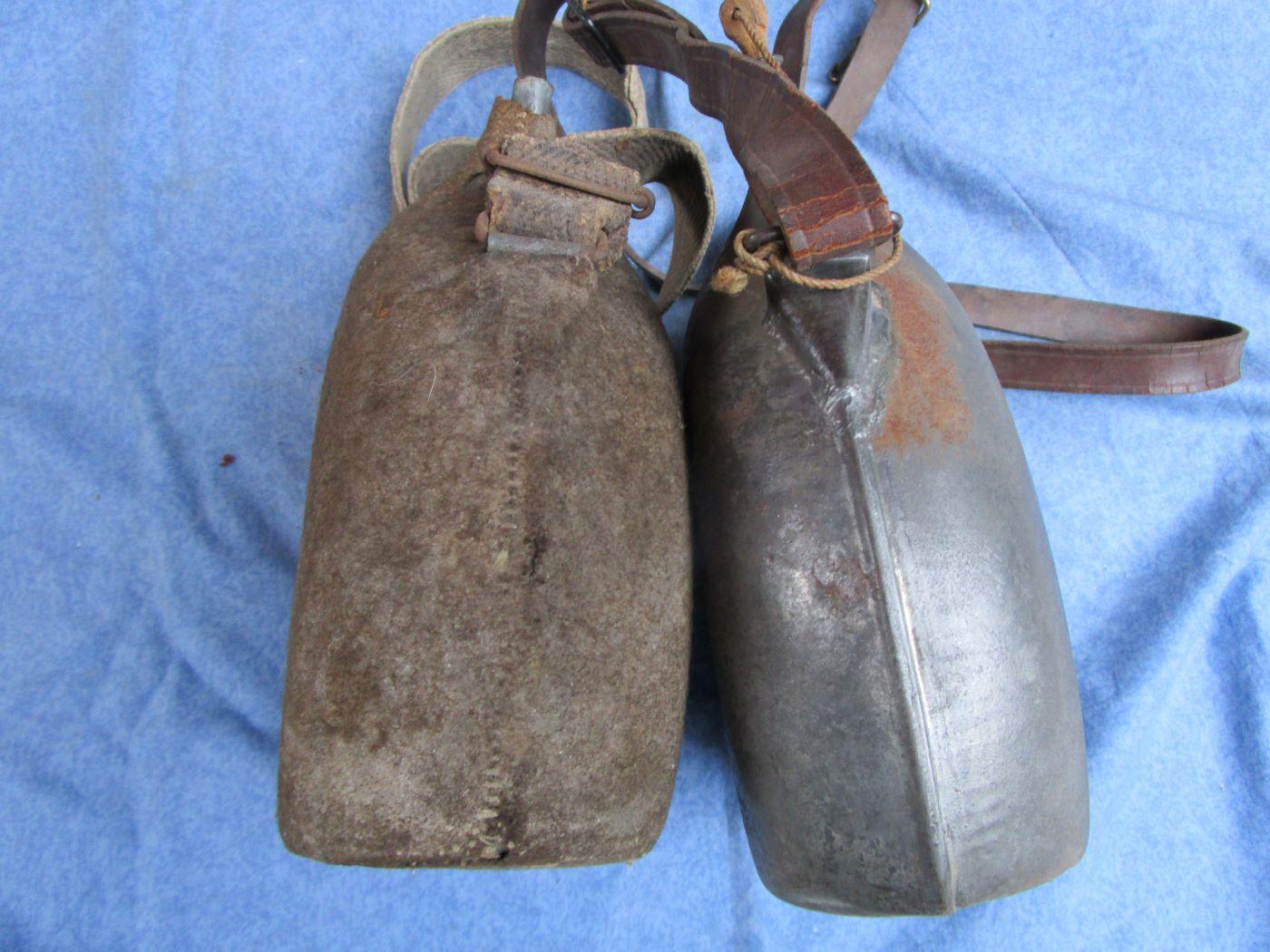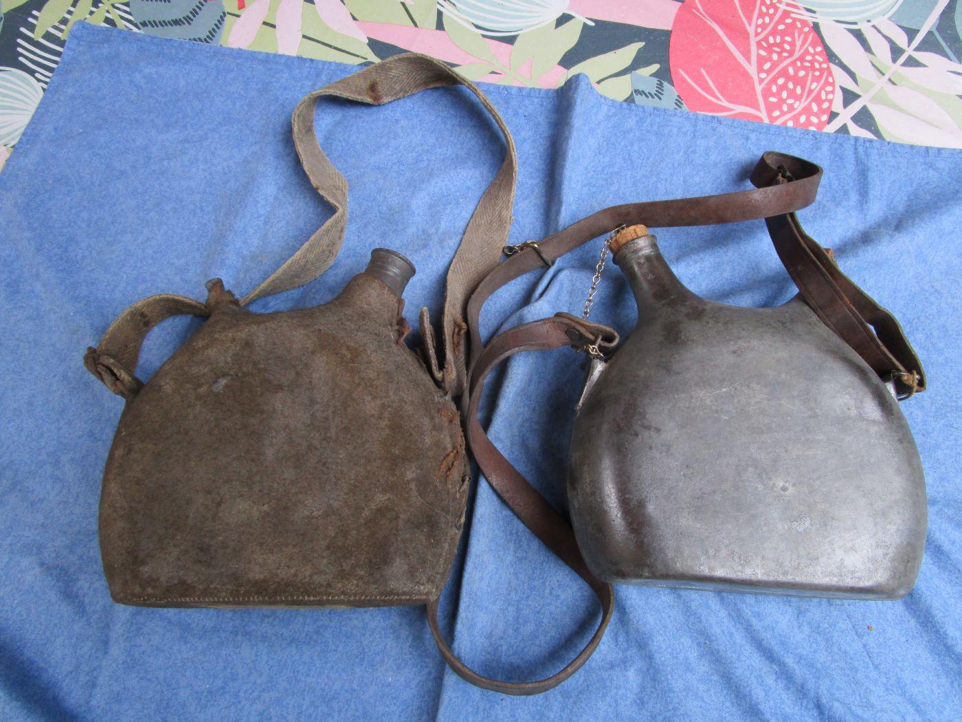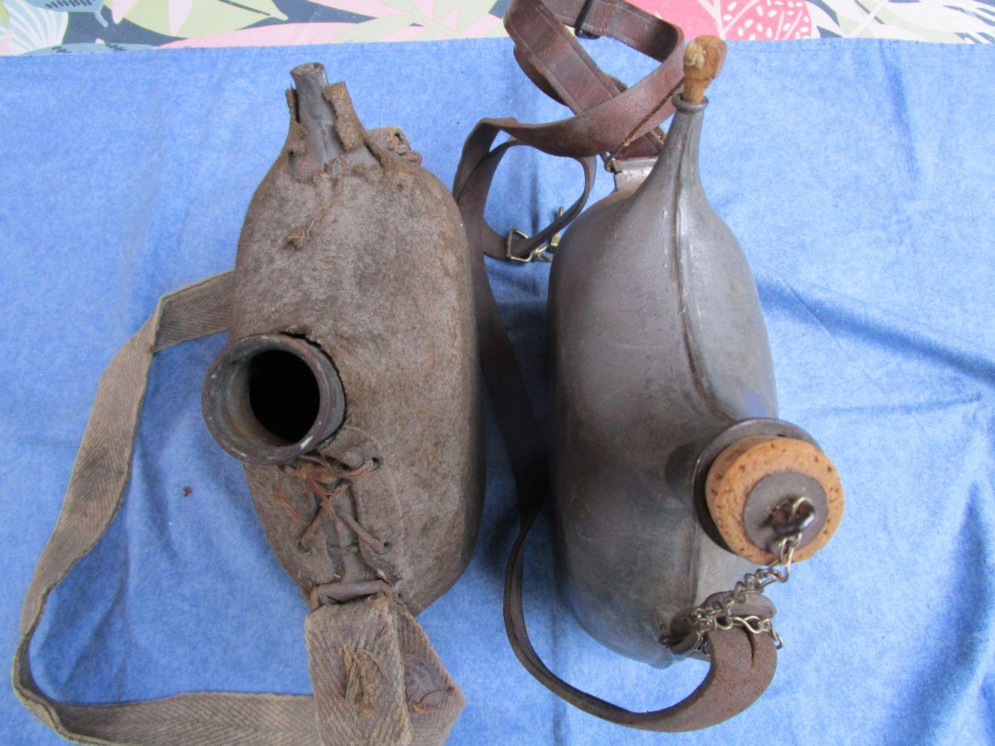 2 bidons de 2 litres. 1 avec drap kaki 39/40 et bretelle en toile assez courte. Bouchons absents. Rectangle blanc au cul du bidon. L'autre avec bretelle cuir. Le petit bouchon est bon, l'autre en partie. Prévoir 10.70 euros en colissimo ou 7.70 euros par mondial relay. Autres photos sur demande.